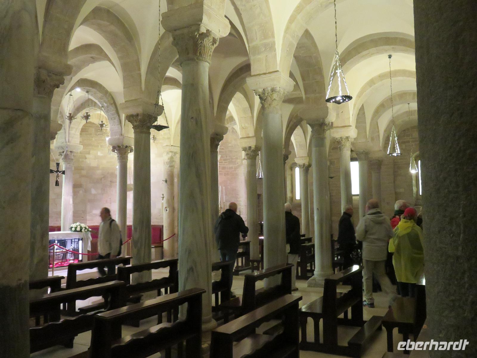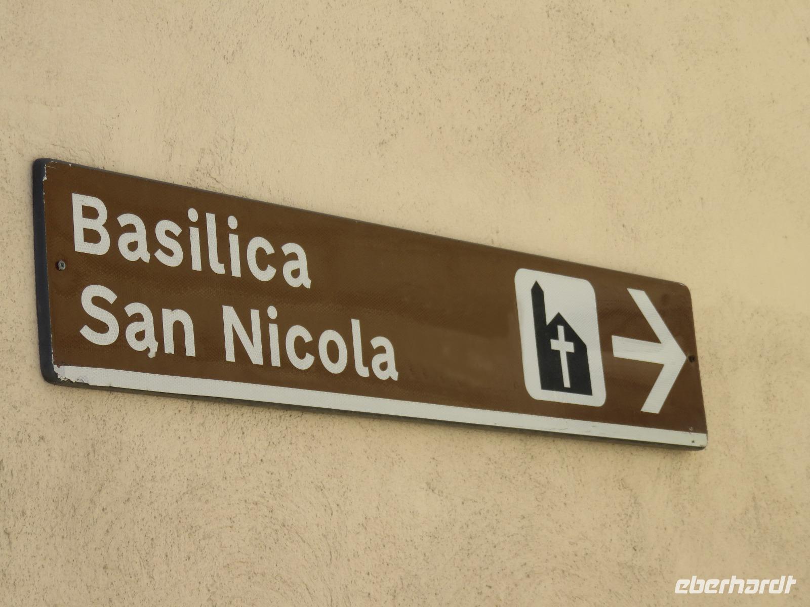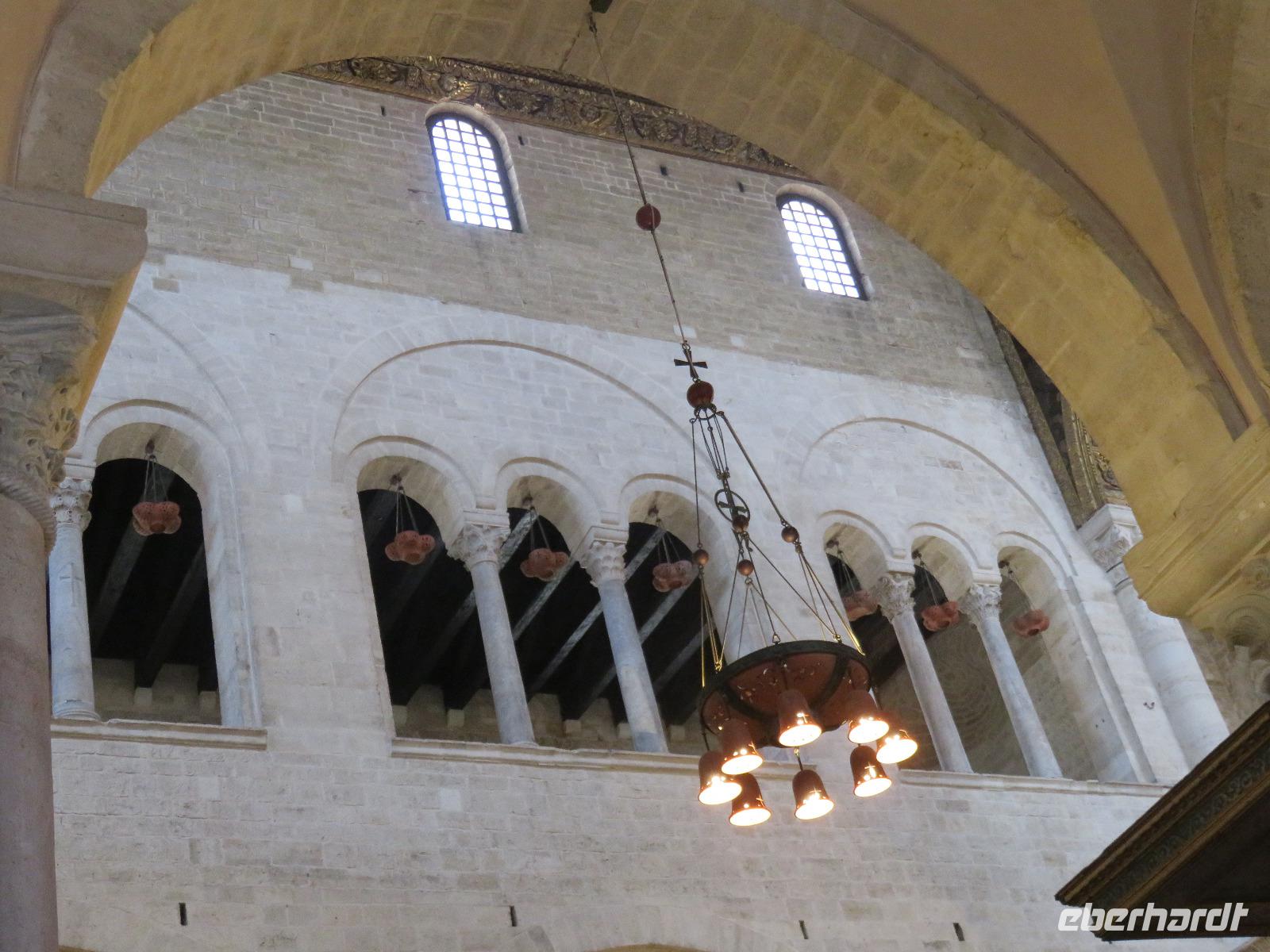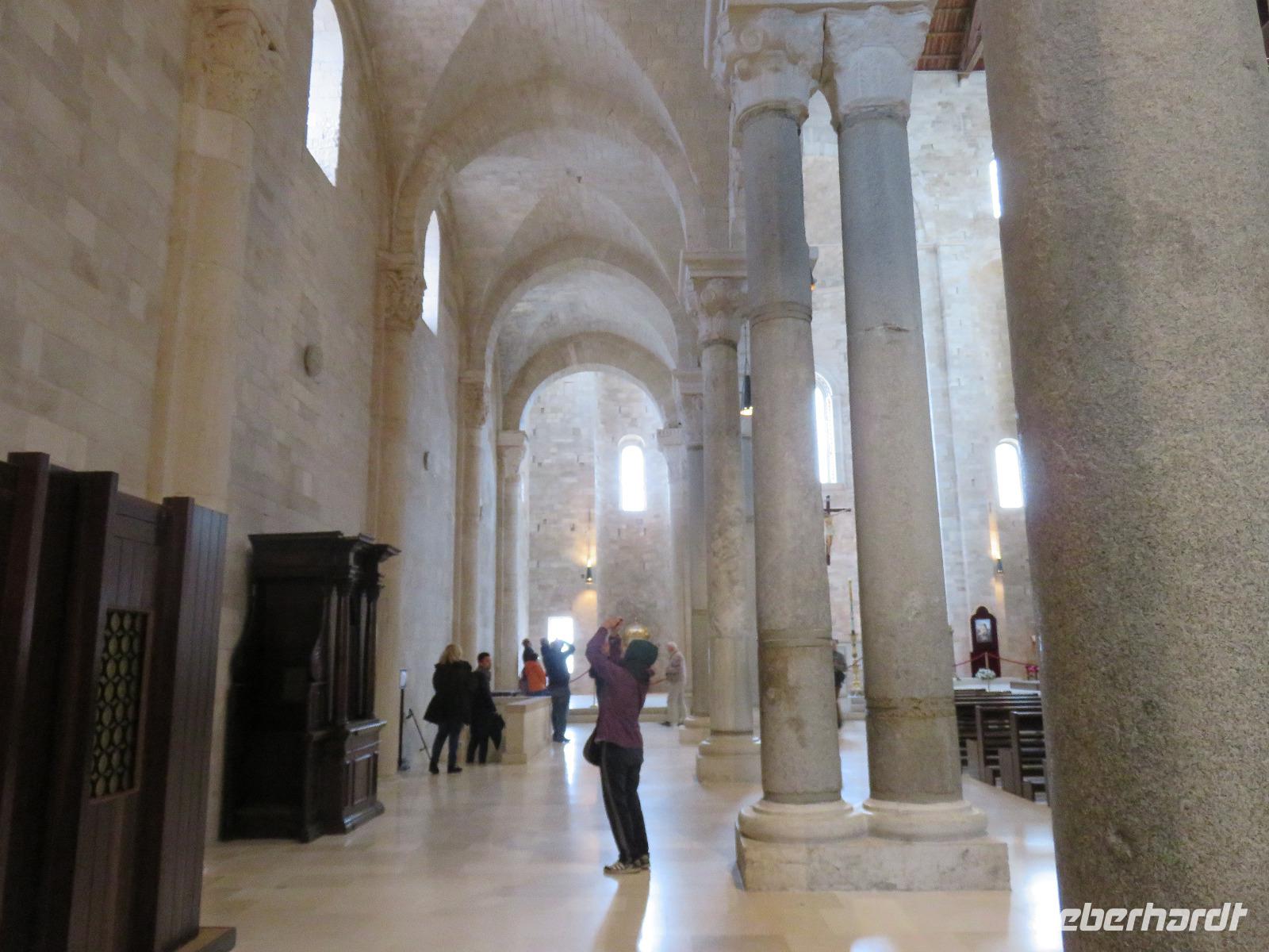 In der Kathedrale S. Sabino fand gerade eine Hochzeitsfeier statt. Wir konnten die Krypta besichtigen. Weiter führte uns unsere Besichtigungstour zur Basilika S. Nicola. Der Bau wurde in dem Jahr begonnen als die Reliquien des Heiligen Nikolaus nach Bari kamen. Am heutigen Samstag fand auch in dieser Kirche eine Hochzeit statt. Deshalb begaben wir uns in die Unterkirche, dort wo die Gebeine des Heiligen Nikolaus aufbewahrt werden. Mirella berichtete ausführlich zu Geschichte seiner Legende. Er gilt als Schutzpatron der Kaufleute und der Seefahrer, als Kinderfreund und Weihnachtsmann. Und so waren es auch 62 Seeleute aus Bari, die die Gebeine aus Kleinasien, aus Myra, dem heutigen Demre, raubten und nach Italien brachten. Alljährlich vom 7. bis 9. Mai findet in Bari ein großes Fest zu Ehren des Heiligen Nikolaus statt. Die Vorbereitungen waren gerade in vollem Gang.
