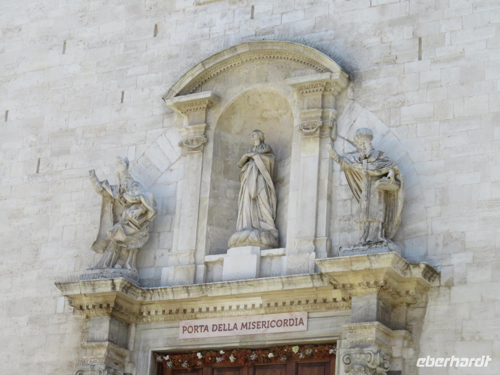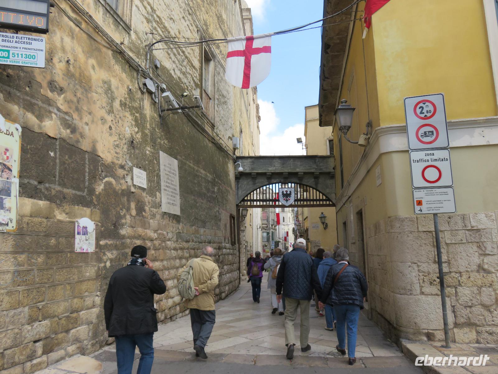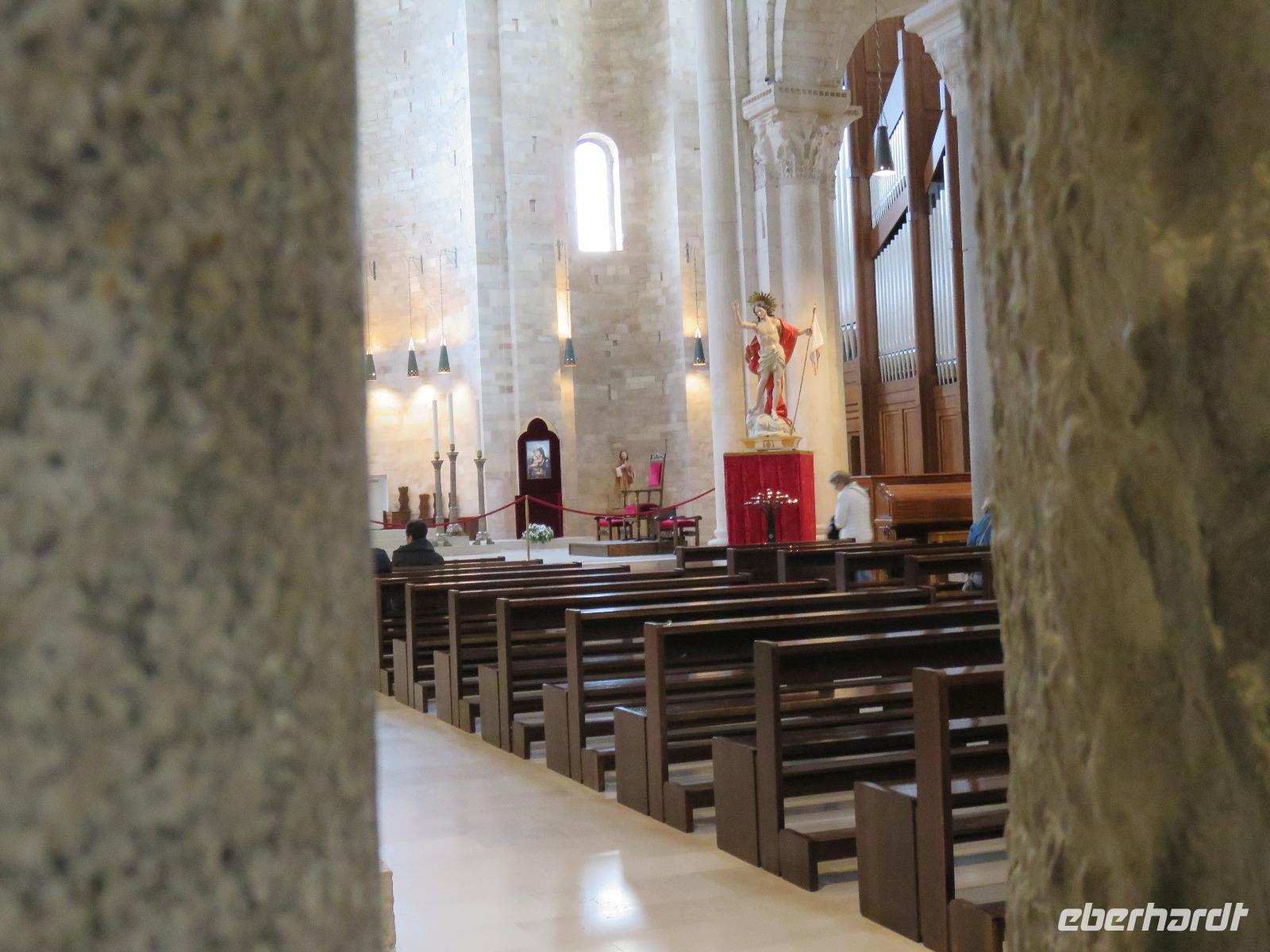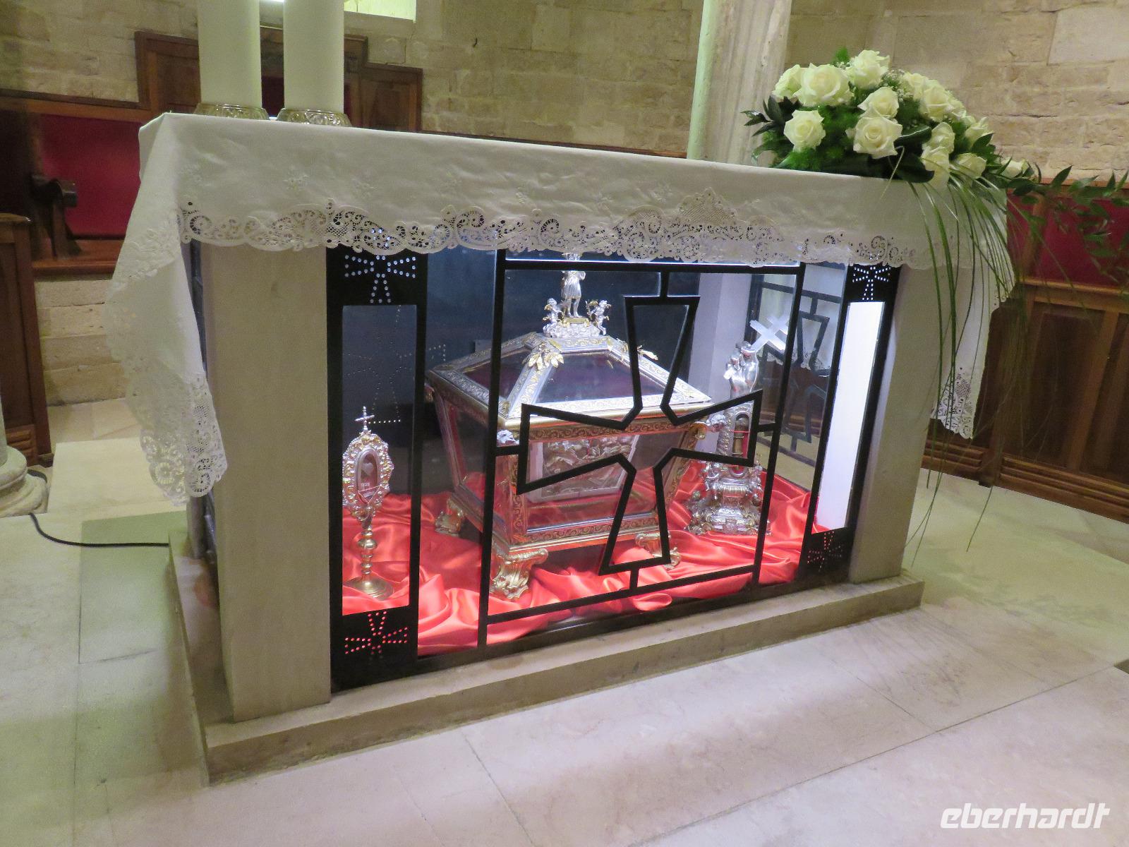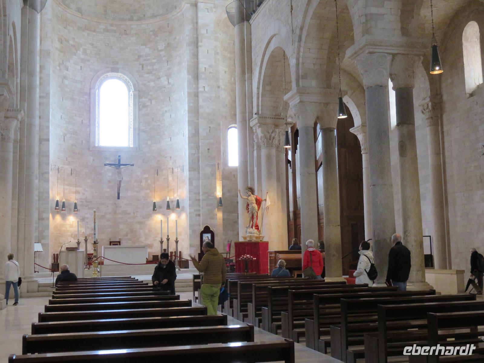 In der Kathedrale S. Sabino fand gerade eine Hochzeitsfeier statt. Wir konnten die Krypta besichtigen. Weiter führte uns unsere Besichtigungstour zur Basilika S. Nicola. Der Bau wurde in dem Jahr begonnen als die Reliquien des Heiligen Nikolaus nach Bari kamen. Am heutigen Samstag fand auch in dieser Kirche eine Hochzeit statt. Deshalb begaben wir uns in die Unterkirche, dort wo die Gebeine des Heiligen Nikolaus aufbewahrt werden. Mirella berichtete ausführlich zu Geschichte seiner Legende. Er gilt als Schutzpatron der Kaufleute und der Seefahrer, als Kinderfreund und Weihnachtsmann. Und so waren es auch 62 Seeleute aus Bari, die die Gebeine aus Kleinasien, aus Myra, dem heutigen Demre, raubten und nach Italien brachten. Alljährlich vom 7. bis 9. Mai findet in Bari ein großes Fest zu Ehren des Heiligen Nikolaus statt. Die Vorbereitungen waren gerade in vollem Gang.