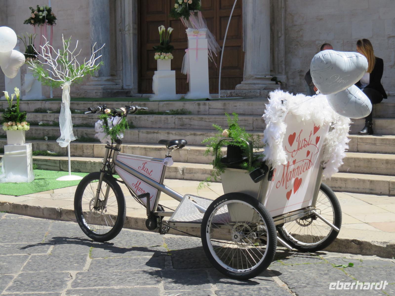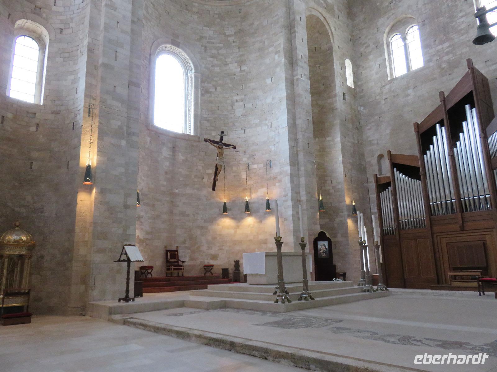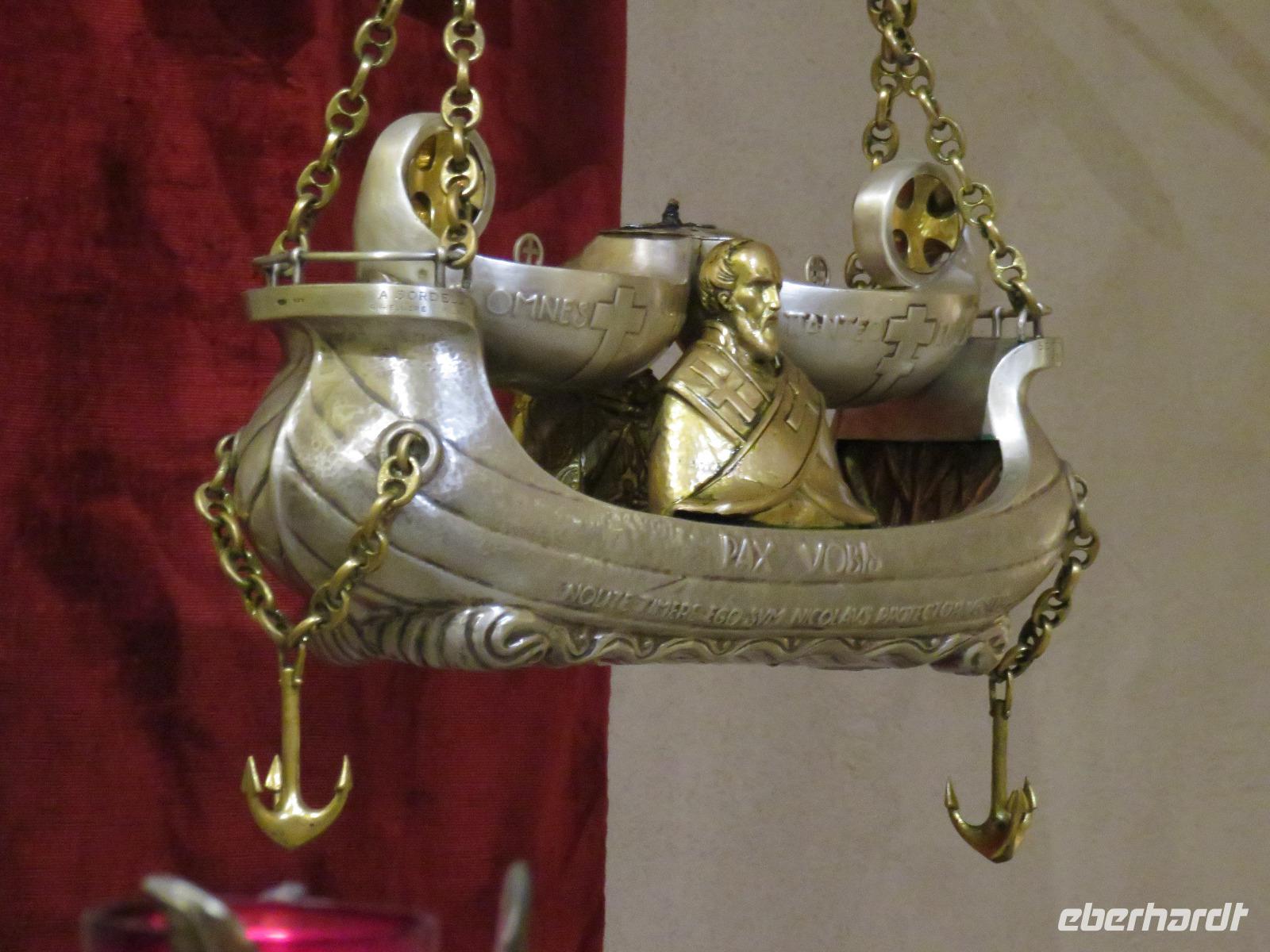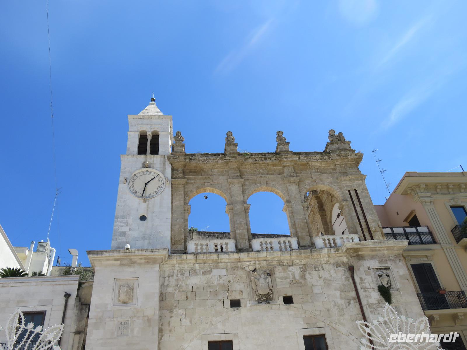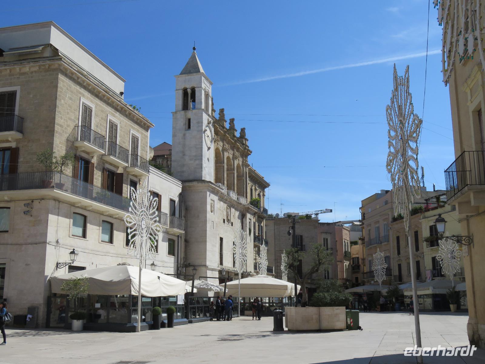 In der Kathedrale S. Sabino fand gerade eine Hochzeitsfeier statt. Wir konnten die Krypta besichtigen. Weiter führte uns unsere Besichtigungstour zur Basilika S. Nicola. Der Bau wurde in dem Jahr begonnen als die Reliquien des Heiligen Nikolaus nach Bari kamen. Am heutigen Samstag fand auch in dieser Kirche eine Hochzeit statt. Deshalb begaben wir uns in die Unterkirche, dort wo die Gebeine des Heiligen Nikolaus aufbewahrt werden. Mirella berichtete ausführlich zu Geschichte seiner Legende. Er gilt als Schutzpatron der Kaufleute und der Seefahrer, als Kinderfreund und Weihnachtsmann. Und so waren es auch 62 Seeleute aus Bari, die die Gebeine aus Kleinasien, aus Myra, dem heutigen Demre, raubten und nach Italien brachten. Alljährlich vom 7. bis 9. Mai findet in Bari ein großes Fest zu Ehren des Heiligen Nikolaus statt. Die Vorbereitungen waren gerade in vollem Gang.