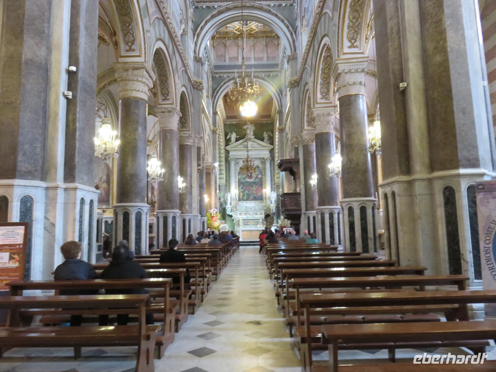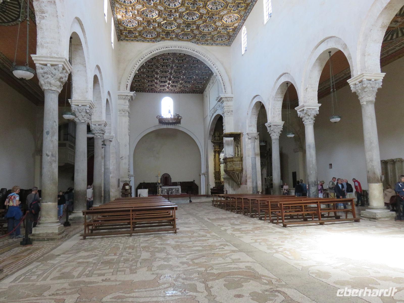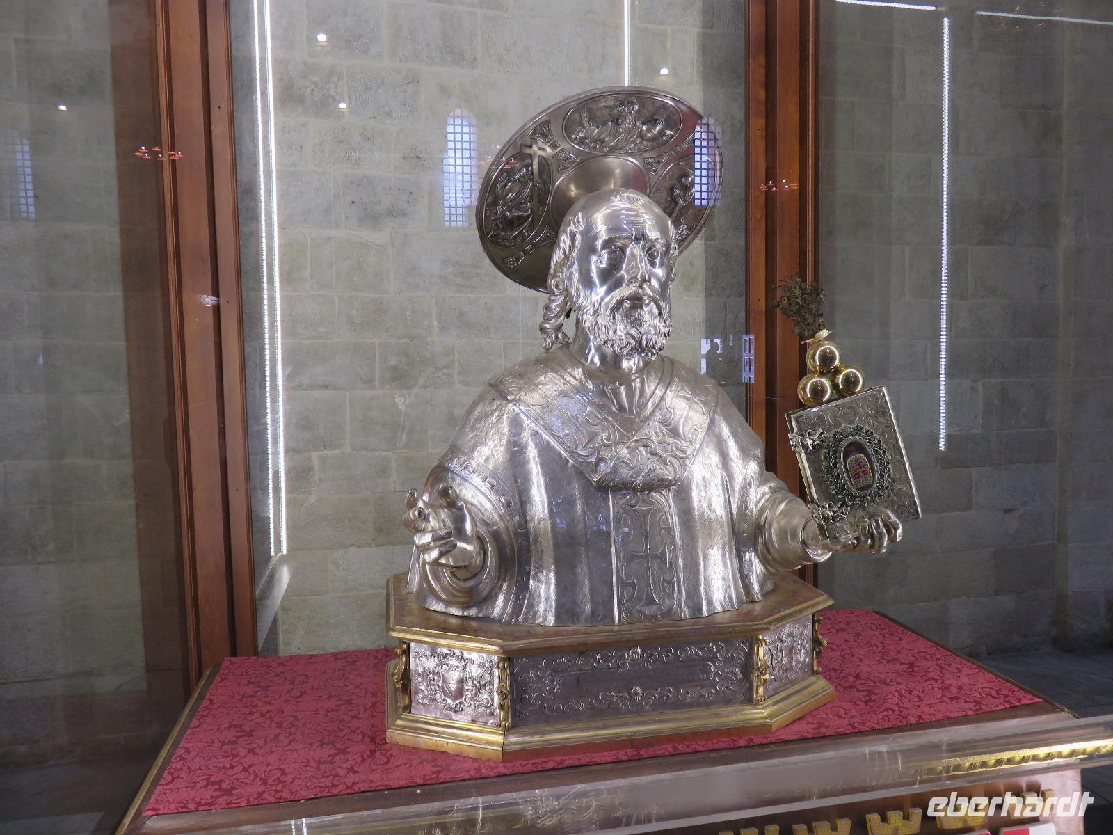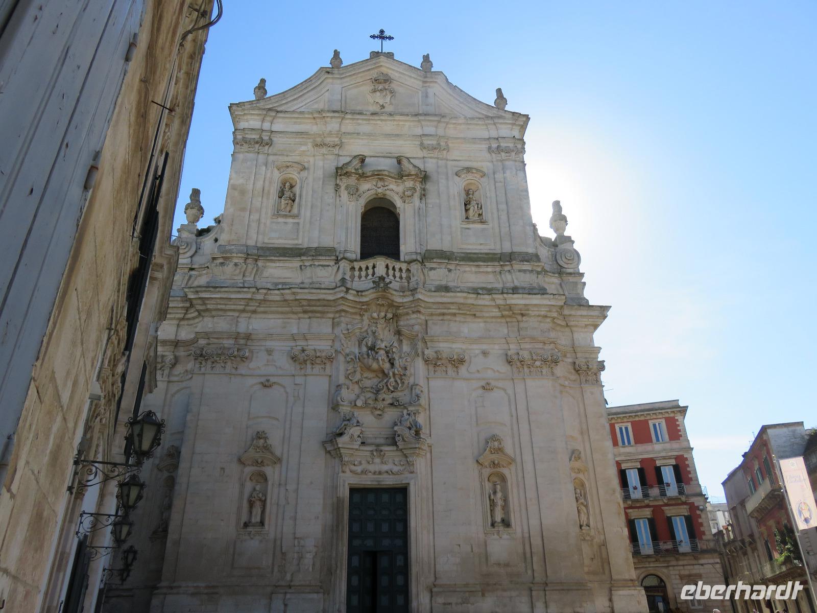 In der Kathedrale S. Sabino fand gerade eine Hochzeitsfeier statt. Wir konnten die Krypta besichtigen. Weiter führte uns unsere Besichtigungstour zur Basilika S. Nicola. Der Bau wurde in dem Jahr begonnen als die Reliquien des Heiligen Nikolaus nach Bari kamen. Am heutigen Samstag fand auch in dieser Kirche eine Hochzeit statt. Deshalb begaben wir uns in die Unterkirche, dort wo die Gebeine des Heiligen Nikolaus aufbewahrt werden. Mirella berichtete ausführlich zu Geschichte seiner Legende. Er gilt als Schutzpatron der Kaufleute und der Seefahrer, als Kinderfreund und Weihnachtsmann. Und so waren es auch 62 Seeleute aus Bari, die die Gebeine aus Kleinasien, aus Myra, dem heutigen Demre, raubten und nach Italien brachten. Alljährlich vom 7. bis 9. Mai findet in Bari ein großes Fest zu Ehren des Heiligen Nikolaus statt. Die Vorbereitungen waren gerade in vollem Gang.