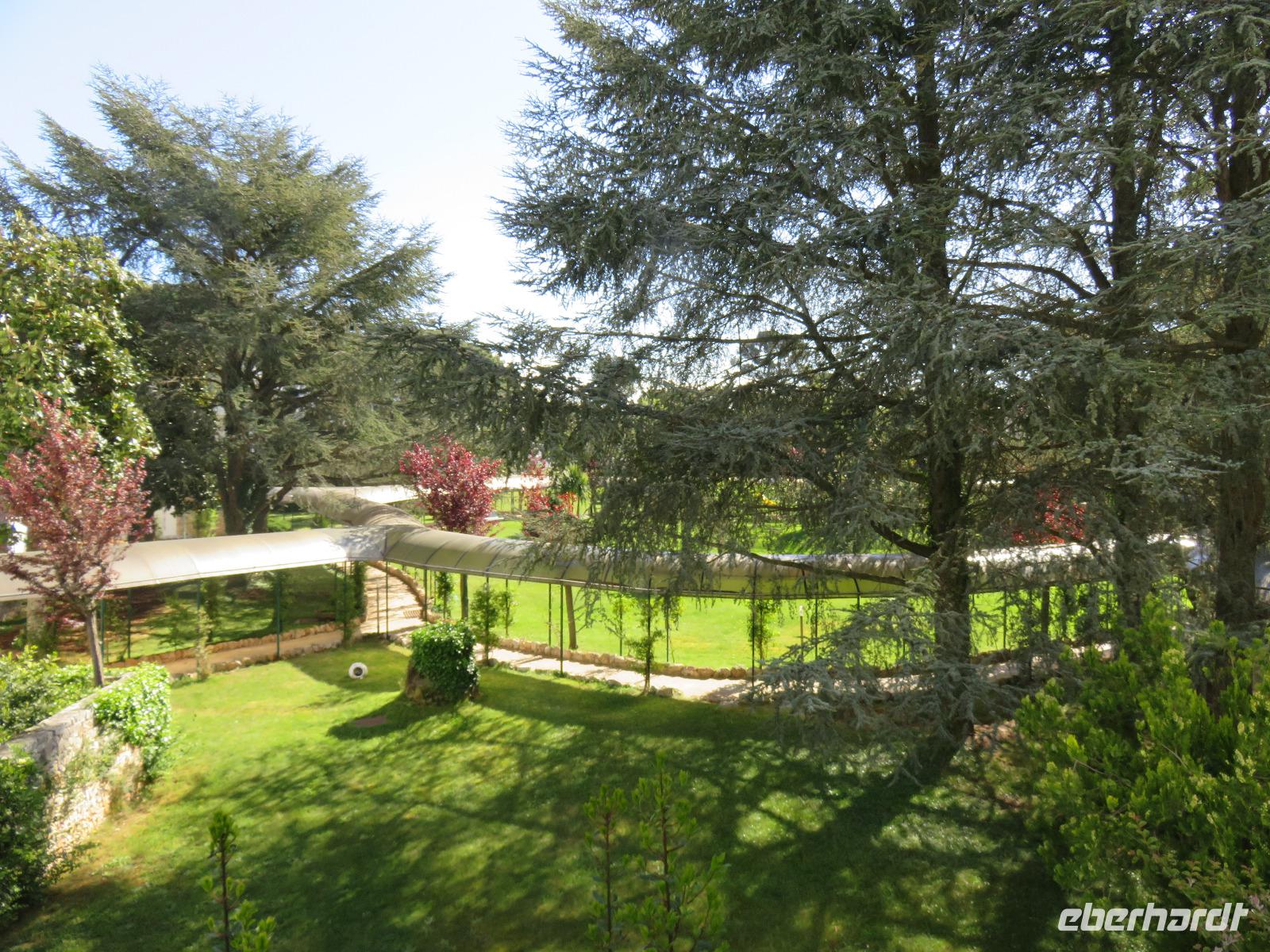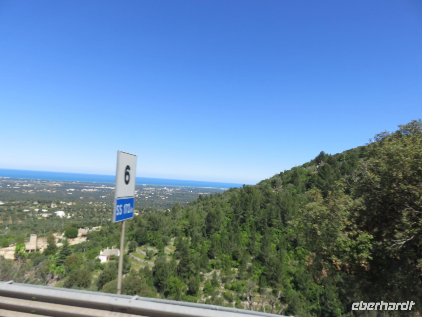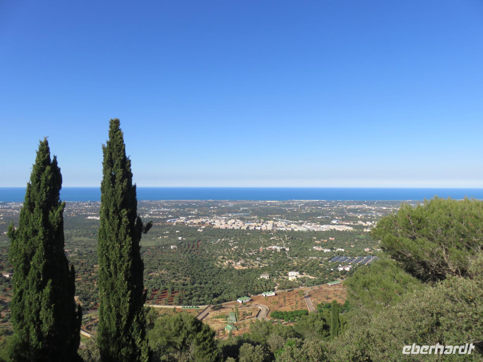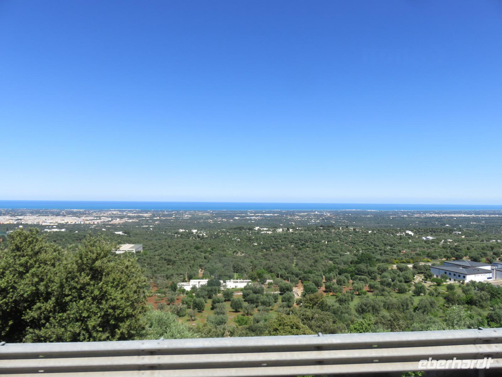 Erst gegen Mittag reisten wir von unseren Ausgangpunkten zum Flughafen Berlin-Tegel, von wo unser Flug mit Air Berlin pünktlich 17.30 Uhr nach Bari startete. Wir landeten nach einem ruhigen zweistündigen Flug im Süden Italiens bei schönstem Wetter. Unsere örtliche Reiseleiterin Mirella begrüßte uns herzlich. Mit Gianni am Steuer und ersten Erläuterungen zu Bari und dem Leben in Apulien reisten wir voller Erwartungen zu unserem 4-Sterne-Hotel „Sierra Silvana" in Selva de Fasano, dem bewaldeten Bergrücken oberhalb von Fasano. Auf dem letzten Stück des Weges, unter uns das Lichtermeer der Handels- und Industriestadt Fasano mit Blick zur Adria, leuchtete uns der Mond den Weg aus. Ein faszinierend schöner Moment!