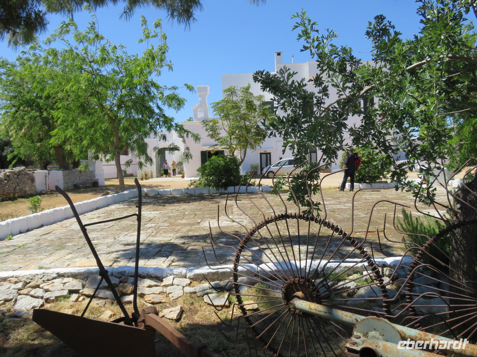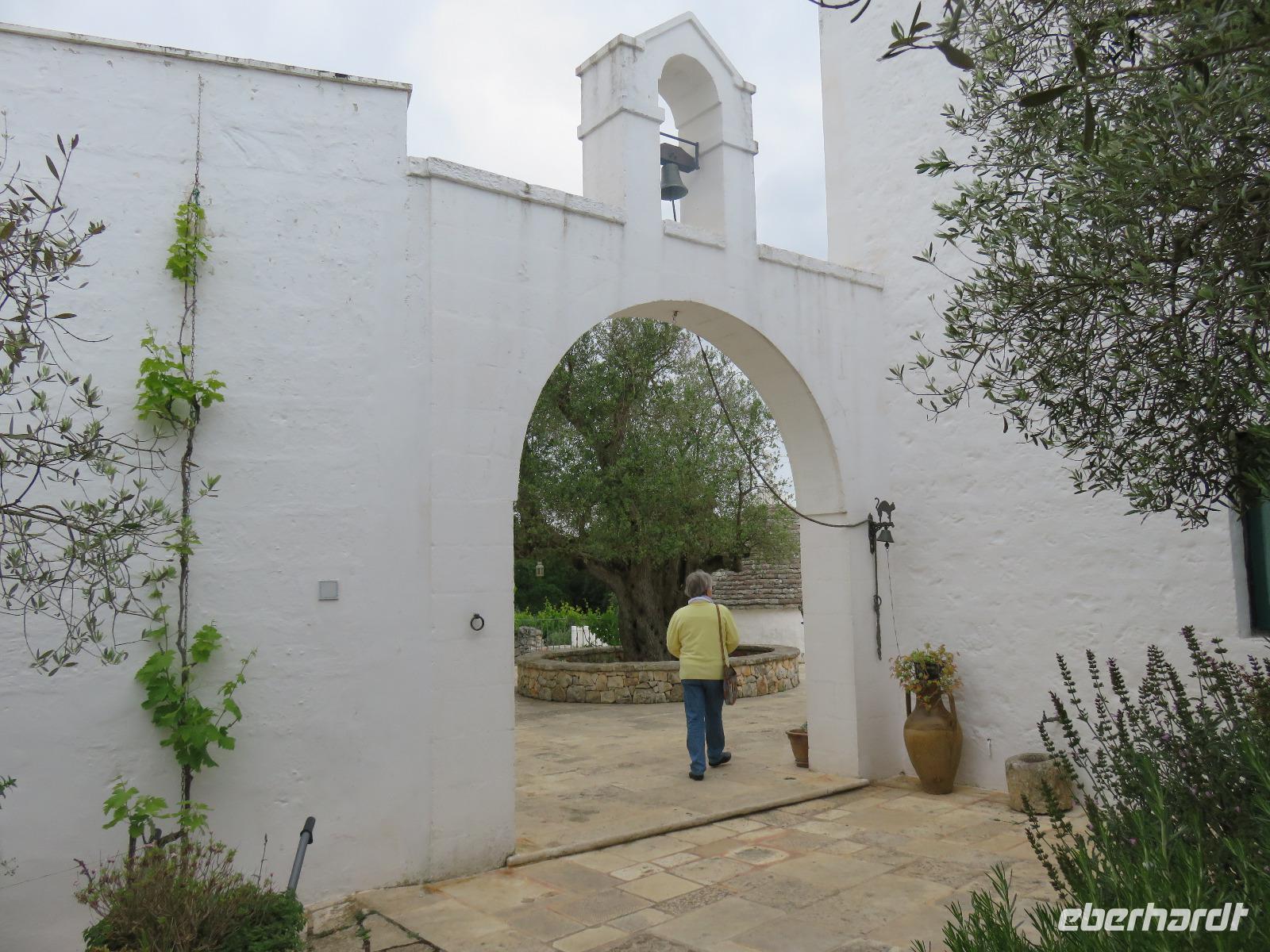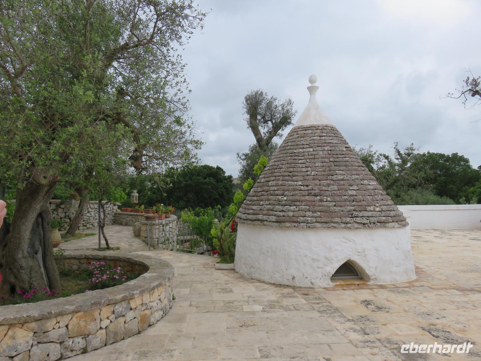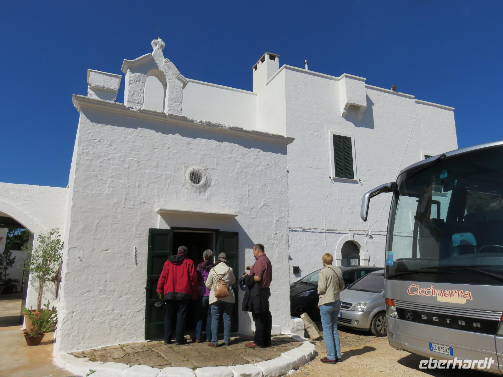 In der Masseria Refrigerio begrüßte uns die Chefin des Hauses herzlich. Wir nahmen an der großen Tafel im Erdgeschoss zu einem opulenten Mittagsmahl Platz. Die Küche hatte aus frischen Zutaten ausgezeichnete, vegetarische, mediterrane, gesunde Spezialitäten gezaubert. Nur bei einem Gang wurden Fleischspezialitäten aufgetischt. Kaffee und Apfelkuchen mit frischen Erdbeeren rundeten unser Mahl ab. Herzlichen Dank für diese Köstlichkeiten!Gut gestärkt reisten wir zur Ölmühle bei Cisternino. Zuerst mussten alle Gäste auf die Waage. Oh und das nach unserem Mittagessen in der Masseria! Wir wogen 1.445 kg. Nun, die Besitzer wollten uns nur mitteilen, dass aus diesem Gewicht hätten 180 Liter Öl gepresst werden können - je nach Sorte werden 7 bis 10 Kilogramm Oliven für einen Liter Öl benötigt. Unsere Rundgang führte vorbei an den alten Pressen und den modernen Ölmühlen zu einem kleinen Trullo. Hier verkosteten wir einige der Öle, auch aromatisierte mit Zitronen, Orangen, Zwiebeln ... Natürlich kauften wir einige Flaschen oder kleine Kanister Olivenöl sowie kosmetische Produkte. Für den Flug bot die Mühle den tollen Service des Einschweißens. Auf dem Rückweg trübte es sich ein und leichter Regen kam auf. Es regnete bis in den Morgen des nächsten Tages.
