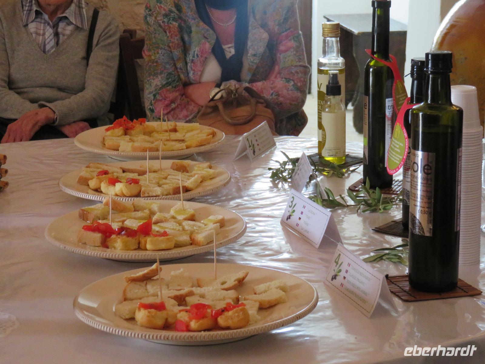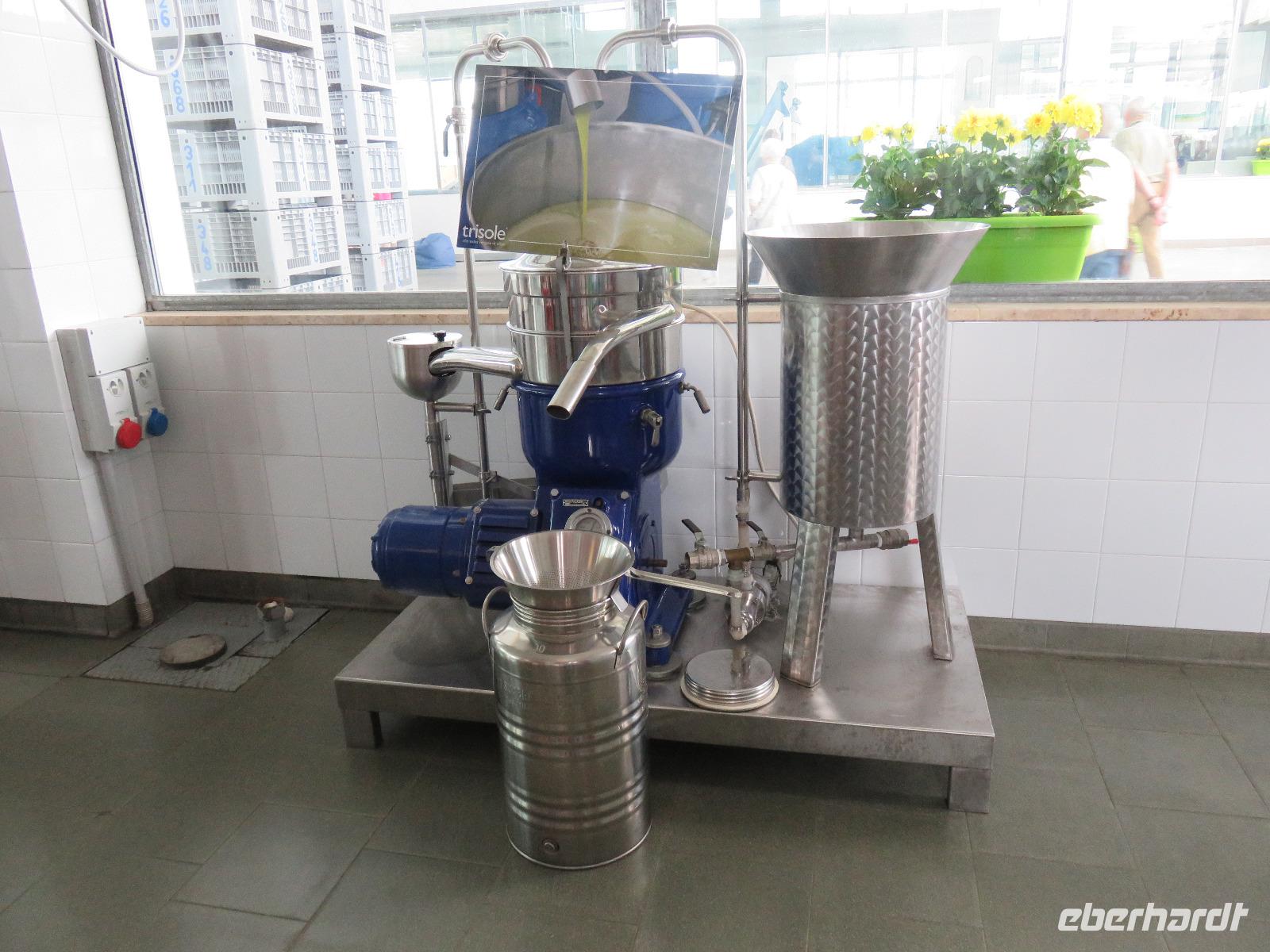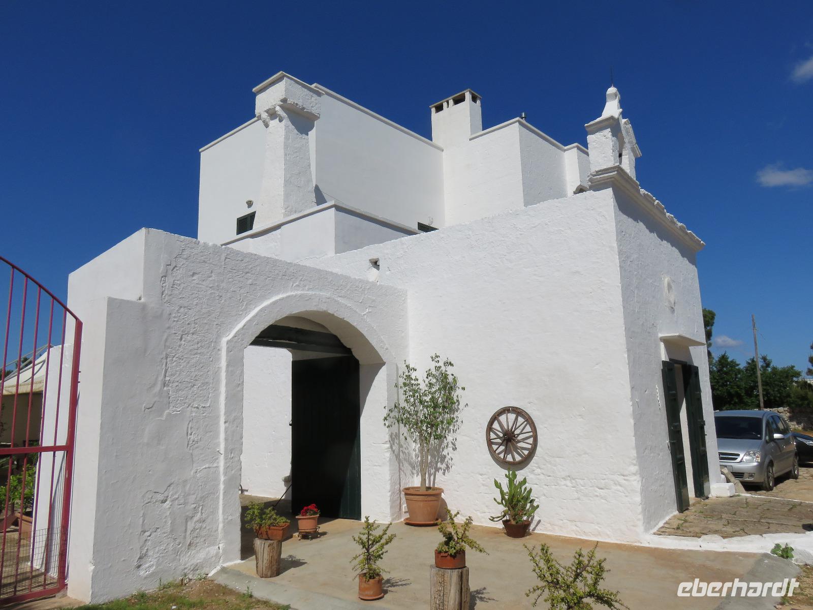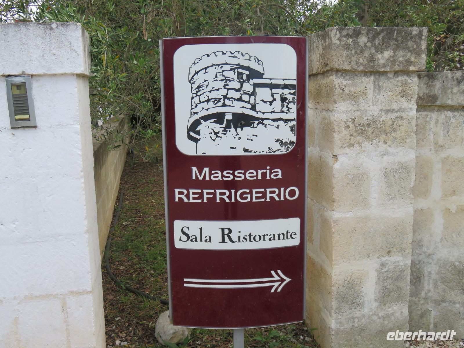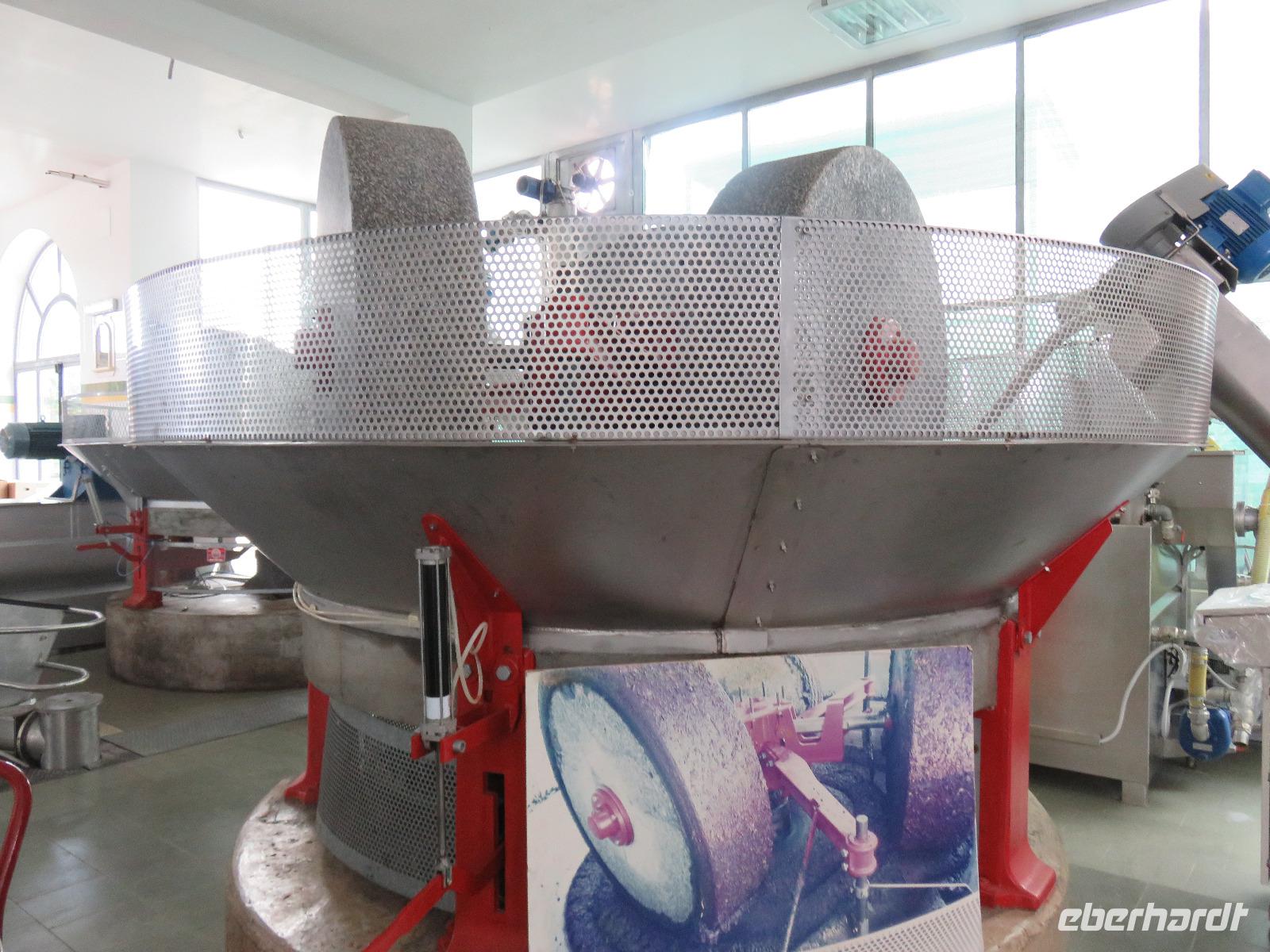 In der Masseria Refrigerio begrüßte uns die Chefin des Hauses herzlich. Wir nahmen an der großen Tafel im Erdgeschoss zu einem opulenten Mittagsmahl Platz. Die Küche hatte aus frischen Zutaten ausgezeichnete, vegetarische, mediterrane, gesunde Spezialitäten gezaubert. Nur bei einem Gang wurden Fleischspezialitäten aufgetischt. Kaffee und Apfelkuchen mit frischen Erdbeeren rundeten unser Mahl ab. Herzlichen Dank für diese Köstlichkeiten!Gut gestärkt reisten wir zur Ölmühle bei Cisternino. Zuerst mussten alle Gäste auf die Waage. Oh und das nach unserem Mittagessen in der Masseria! Wir wogen 1.445 kg. Nun, die Besitzer wollten uns nur mitteilen, dass aus diesem Gewicht hätten 180 Liter Öl gepresst werden können - je nach Sorte werden 7 bis 10 Kilogramm Oliven für einen Liter Öl benötigt. Unsere Rundgang führte vorbei an den alten Pressen und den modernen Ölmühlen zu einem kleinen Trullo. Hier verkosteten wir einige der Öle, auch aromatisierte mit Zitronen, Orangen, Zwiebeln ... Natürlich kauften wir einige Flaschen oder kleine Kanister Olivenöl sowie kosmetische Produkte. Für den Flug bot die Mühle den tollen Service des Einschweißens. Auf dem Rückweg trübte es sich ein und leichter Regen kam auf. Es regnete bis in den Morgen des nächsten Tages.
