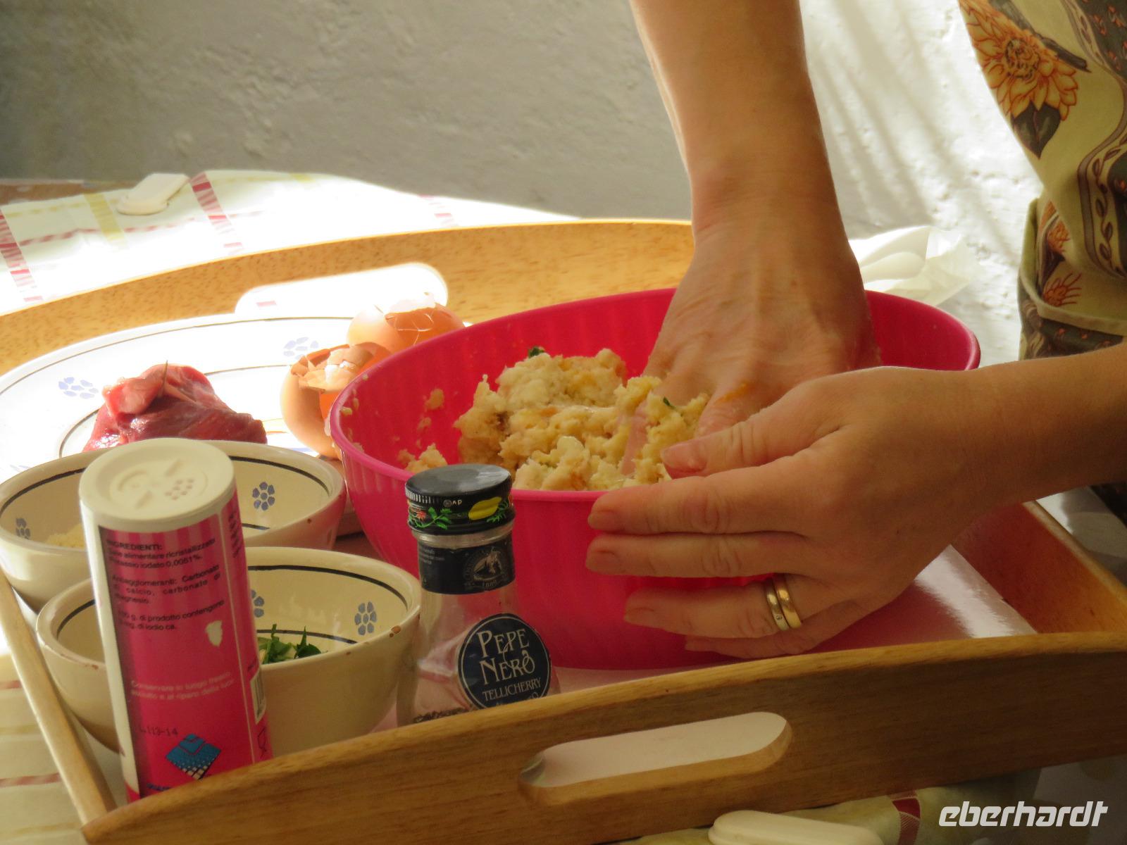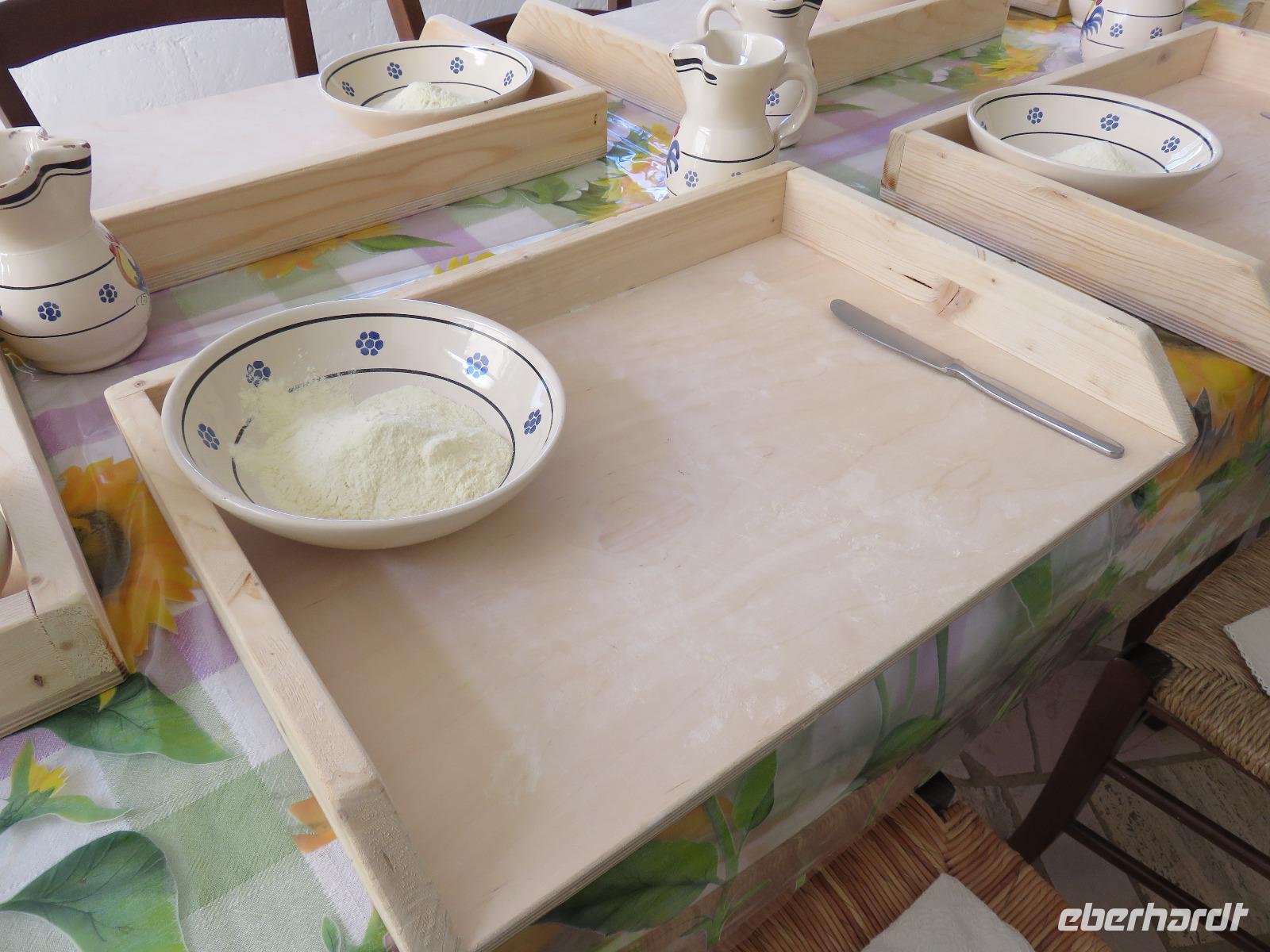 Am Morgen weckten uns die Sonne und strahlend blauer Himmel. Nach einer kurzen Busfahrt erreichten wir die Masseria Priore. Pedro, der Besitzer, begrüßte uns herzlich. Es schloss sich eine Besichtigung der kleinen Kapelle des Bauernhofes an. Danach erläuterte uns Dina die Herstellung von Mozzarella-Käse in ihrem Familienbetrieb. Natürlich verriet sie uns nicht alle Geheimnisse. Ganz flinke, geschickte Hände formten aus der großen Käsemasse kleine Mozzarella-Knoten, größere Kugeln, gefüllten Mozzarella und die Grundform für geräucherten Mozzarella. Anna empfing uns und fertigte kleine Klöße und Rouladen nach Omas-Art. Und nun waren wir an der Reihe, uns unser Mittagessen zu erarbeiten: An jedem Platz lagen eine Schürze, ein Holzbrett, eine Schüssel, Hartweizenmehl, Wasser und ein Messer. Ärmel aufgekrempelt! Mit viel Freude kneteten wir unseren eigenen Nudelteig, unter Anleitung von Anna kreierten wir unsere eigenen Öhrchennudeln. Was bei ihr ganz einfach von der Hand ging, war für uns nicht so leicht nachzumachen. So entstanden eigenartige Nudelformen, aber auch Mäuse, Teddys ... Bei schönstem Wetter spazierten wir anschließend über den Bauernhof, bestaunen die Oliven- und Obstbäume, die Tomaten-, Bohnen- und Fenchelpflanzen und im hinteren Teil den Hausgarten mit Orangen- und Zitronenbäumchen. 12.00 Uhr hieß es Platznehmen im Restaurant zum Mittagessen: Wein und Wasser, mehr als 14 Gänge mit mediterranen Spezialitäten, kleine Köstlichkeiten mit viel Liebe zubereitet. Natürlich haben wir die ein oder andere Spezialität anschließend im Laden des Bauernhofes käuflich erworben. Wie viele Nudeltütchen in unseren Bus wanderten kann ich nicht schreiben, aber es muss eine ganze Menge gewesen sein.Am Nachmittag fuhren wir zur „runden" Stadt Locorotondo, die sich wunderschön mit ihrer weißen Silhouette vom azurblauen Himmel abhob. Wir hielten zum Fotostopp unterhalb der Stadt mit Blick zur imposanten Chiesa Matrica di S. Giorgio, die aus den weißen Häusern und der weißen Stadtmauer majestätisch empor ragt. In Locorotondo angekommen, gingen wir allmählich ansteigend hinauf zum Stadtpark Villa Comunale und erfreuten uns am Panoramablick in das Dreiländereck zwischen Valle d'Itria, Brindisi und Táranto. Bevor wir durch Altstadt flanierten, legten wir eine Kaffeepause ein. In den kleinen Gassen bestaunten wir die weißen Reihenhäuser mit den spitzen Giebeldächern, stellenweise wuchsen darauf Blumen und Kräuter. Die Bauweise der Dächer erinnerte uns an die Trullis. Bei den Cummersa werden ebenfalls Kalksteinplatten verwendet. Überall sahen wir in den Gassen wunderschönen Blumenschmuck, geschmackvolle Werbung für Geschäfte und Restaurants mit frischen Blumen und Blüten. In der kleinen Kirche San Nicola di Mira bewunderten wir den Bilderzyklus zum Leben des hl. Nikolaus. Schließlich erreichten wir die Chiesa Madre di San Giorgio mit der Abbildung des hl. Georg mit dem Drachen. Wir besichtigten zudem die Sakristei und die Unterkirche. Durch das Porta Lecce verließen wir die Altstadt. Gianni lenkte den Bus nun bei bestem Wetter durch die typische Landschaft, links und rechts der Straße Weinfelder über Weinfelder. Seit dem 12. Jahrhundert wird rund um Locorotondo Wein angebaut, aber erst 1932 die erste Winzergenossenschaft Apuliens gegründet. Der Wein ist von bester Güte, seit 1969 als DOC-Gebiet ausgewiesen.Auf unserem Weg zum Hotel hielten wir zum Fotostopp am Panoramapunkt oberhalb des Safariparks von Fasano mit Blick zum Meer. Einige der Tiere haben wir entdeckt, aber nur weil wir unsere Fotoapparate als Fernstecher nutzten: Büffel, Gnus, Giraffen, Pferde ... Nach dem abendlichen Spaziergang zu den Villen in der Nähe des Hotels ließen wir uns nach einem äußerst erlebnisreichen Tag das Abendessen schmecken.