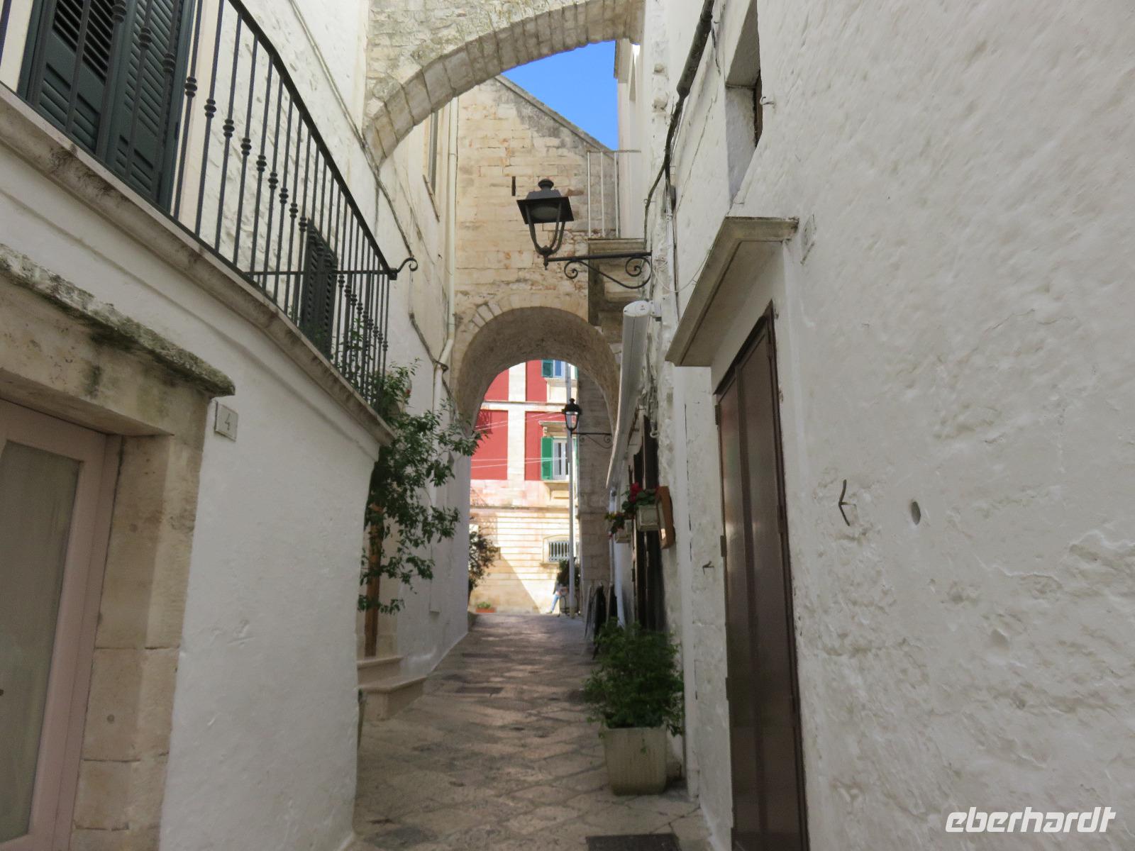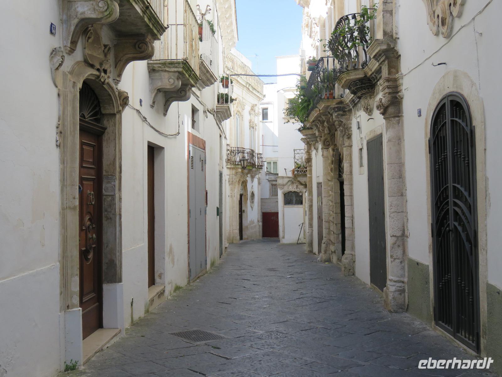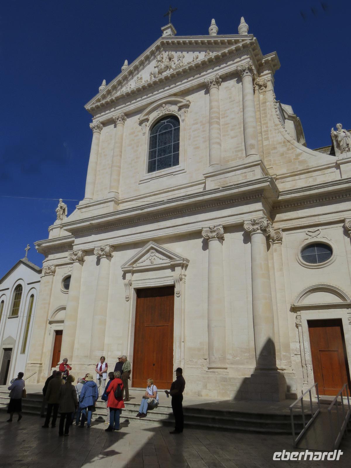 Der Morgen empfing uns erneut mit Sonne. Wieder starteten wir gleich nach dem Frühstück zu unserem Ausflug. Unser erstes Augenmerk galt der kleinen Stadt Martina Franca. Bereits von weitem grüßte uns das Stadtensemble auf dem Monte San Martino mit der Dom S. Martino in der Mitte. Wir spazierten durch die Gassen der noch „schlafenden" Stadt, genossen den Anblick der schmucken Gebäude. Leider war der Dom noch nicht geöffnet. So mussten wir uns mit dem Anblick von außen begnügen. Dafür besichtigten wir einige Räume im prächtigen Palazzo Ducale und bestaunten barocke Fresken. Hier sahen wir eine kleine Ausstellung zum Leben in der Region, zum Naturschutz und zum Handwerk. Sehr imposant auch der Innenhof, der im Sommer für Konzerte und Opernaufführungen genutzt wird. Unser Reiseplan führte uns nun in die „weiße Stadt" Ostuni, Zunächst spazierten wir hinauf zu Piazza della Libertà, dem Hauptplatz am Fuße des Altstadthügels. Unser Weg führte uns hinauf zur spätgotischen Kathedrale S. Maria Assunta. Wir bestaunten die Fensterrosette mit den zwölf Aposteln, den 24 Säulen, die die Speichen eines Rades bilden, in dessen Mitte Jesus Christus steht. Anschließend flanierten wir durch die Gässchen zur Stadtmauer mit wunderschönem Blick auf die Adria, die sich in unterschiedlichen Blautönen präsentierte. Viele kleine Restaurants laden zum Verweilen ein, besonders an den Abenden soll es eine pittoreske Kulisse bilden. Vielleicht eine Anregung für das Programm! Wir gingen nochmals an der entweihten Kirche S. Vito Martire vorbei. Hier befindet sich ein Museum mit Steinzeitfunden, darunter das Skelett einer schwangeren Frau, der 20-jährigen Delia, die vor 25.000 Jahren mit reichem Muschelschmuck beigesetzt wurde. Schließlich erreichen wir durch das Gewirr der Gassen, später mit dem Blick auf die gewaltigen weißen Stadtmauern, wieder die Piazza della Libertá mit der Guglia di Sant'Oronzo, einem 21 Meter hohen Obelisken mit der Statue des Stadtpatrons. Wir nutzten die Zeit zu einer kleinen Pause am Café Centrale.