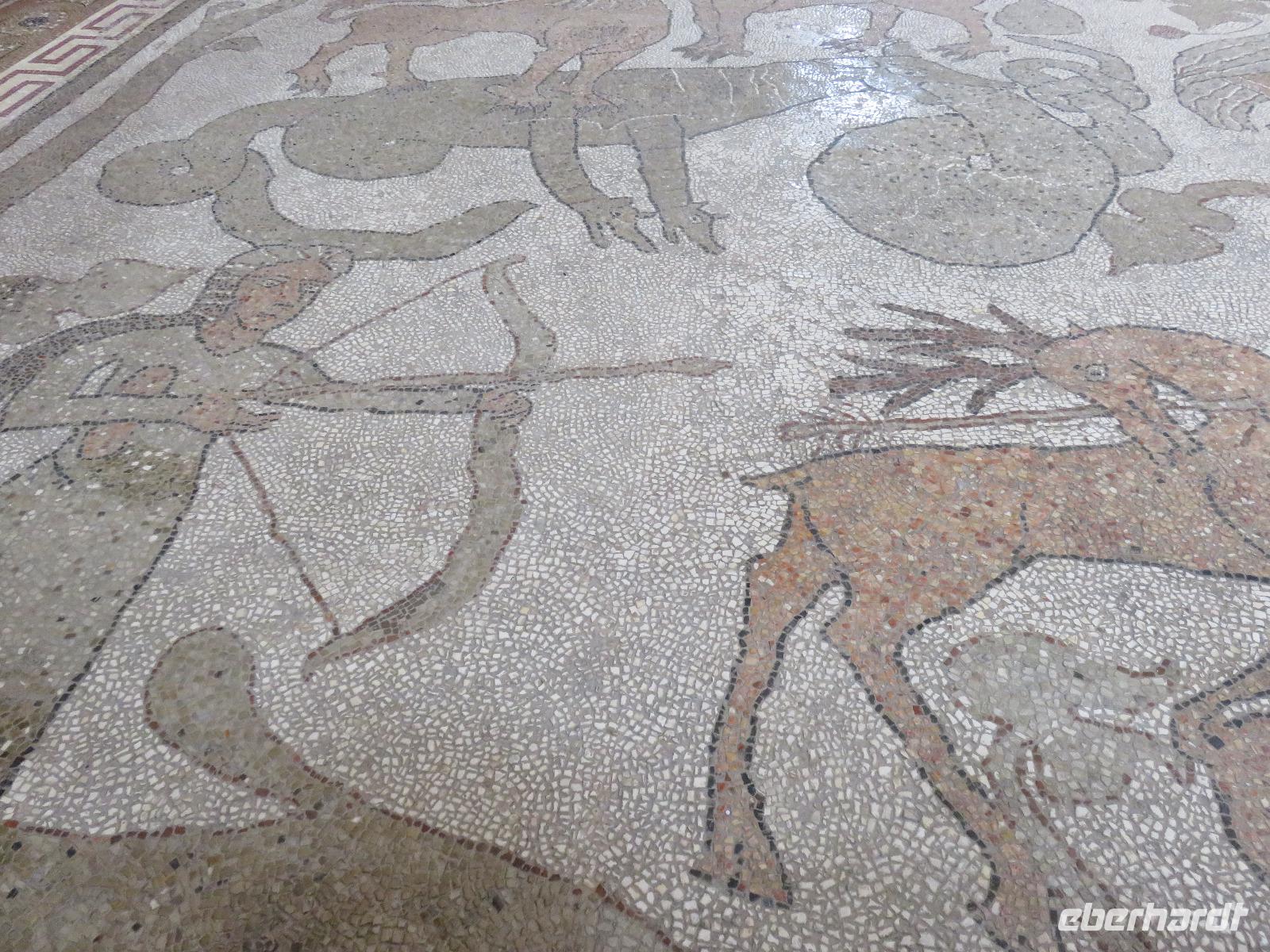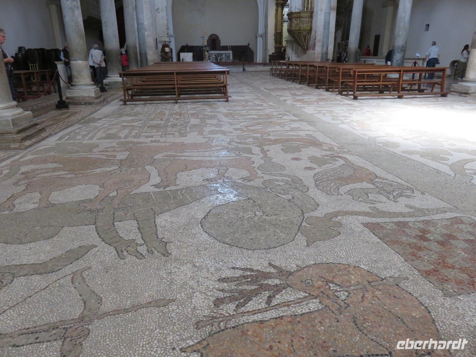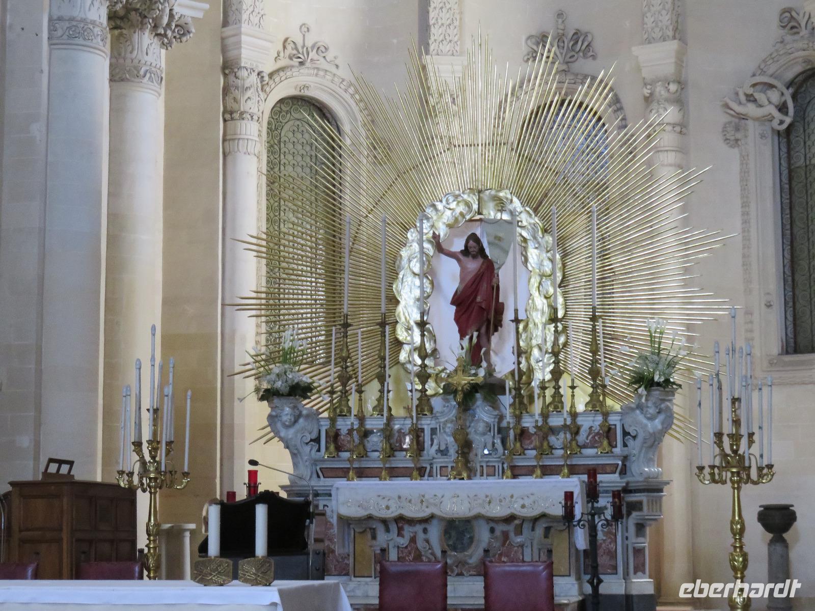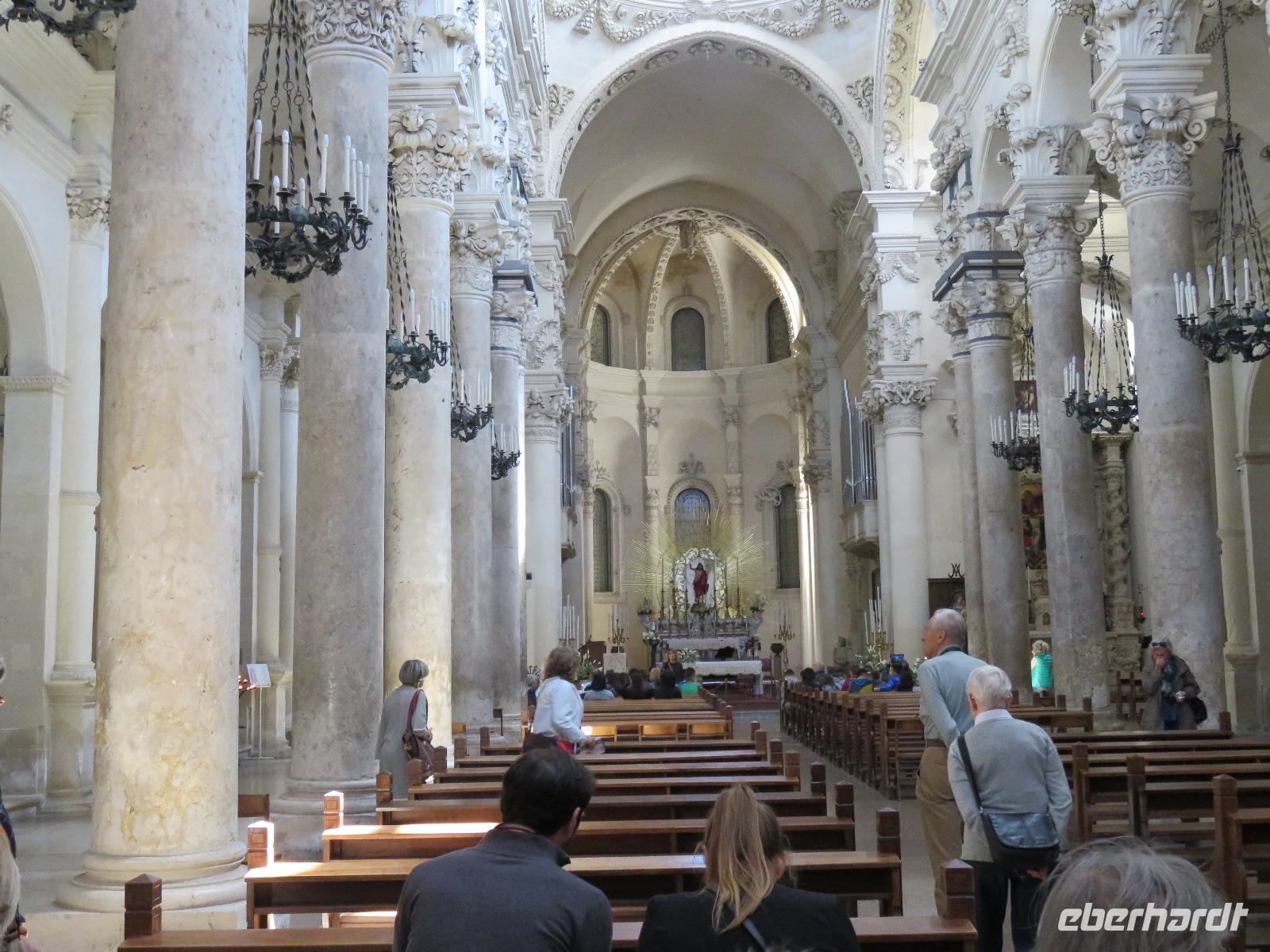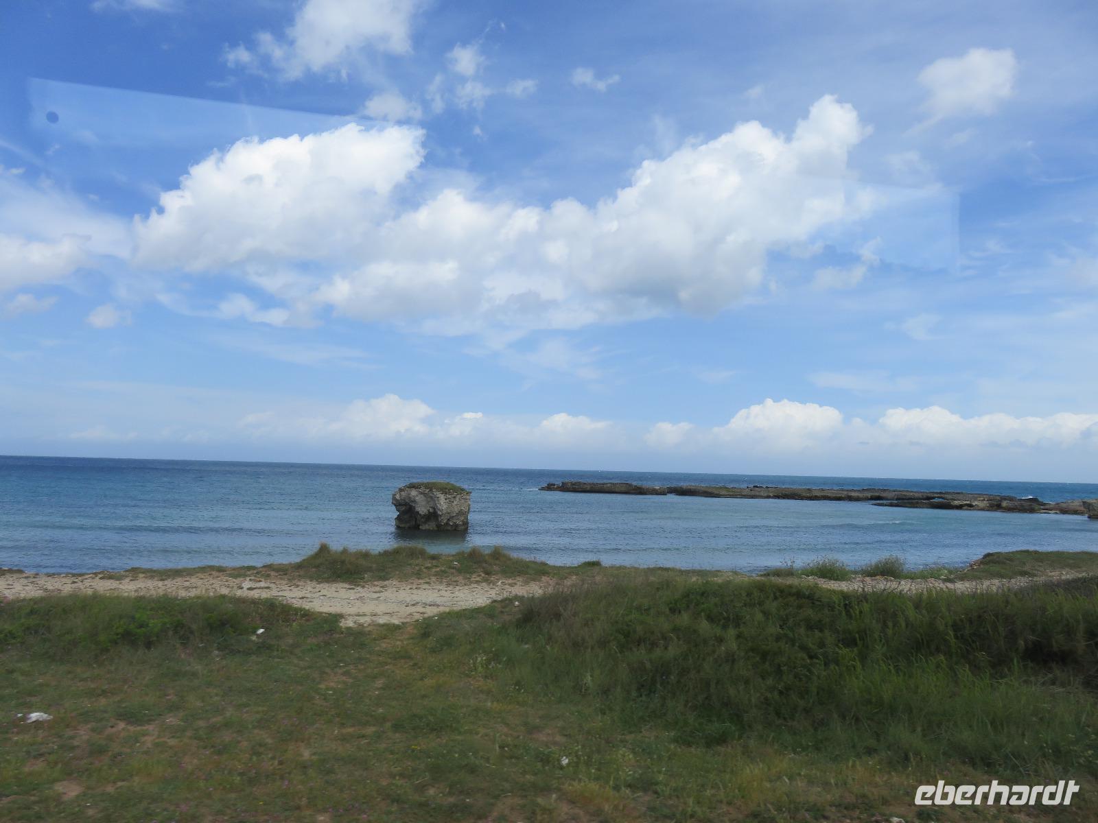 Nun ist Frühsommer: strahlend blauer Himmel, 23 °C. So hatten wir es uns gewünscht! Auch heute starteten wir bereits 08.15 Uhr, diesmal nach Lecce, in das „Florenz von Apulien". Uns erwartete eine barocke Stadt mit einem einzigartigen Ensemble an Prachtbauten. Durch die Porta Napoli betraten wir dieses Kleinod. Wir spazierten gemütlich vorbei an reich geschmückten Häusern zum Domplatz mit dem Dom Santa Maria dell'Assunta, dem Bischofspalast und dem Seminar, über allem ragt der schlanke Glockenturm mit einer Höhe von 68 Metern empor. Im Inneren des Domes bestaunten wir die wertvoll gestaltete mit Gold verzierte Holzdecke und die barocken Altäre. Nach einem Blick in eine der Pappmaché-Werkstätten führte uns der Weg durch die Gassen vorbei an der Kirche S. Irene schließlich zur Basilica di S. Croce. Diese gilt als berühmtestes Werk des Leccer-Barocks. Unsere Augen konnten gar nicht alle Details der äußerst üppigen Fassadengestaltung erfassen, eine wahre Explosion an unterschiedlichen Formen - kein Wunder dass fast 150 Jahre daran gebaut wurde. Nun gingen wir noch ein Stück und standen am römischen, antiken Theater. In den zwölf in den Fels gehauen Sitzreihen sollen bis zu 5.000 Zuschauer Platz gefunden haben. Heute wird es im Sommer für Konzerte und Theateraufführungen genutzt.Wir hatten uns nun eine Mittagspause verdient. Mirella empfahl uns einen Mandelkaffee. Den probierten wir auch: Mandellikör mit Eis und Kaffee - eine willkommene Erfrischung! Wir traten unseren Rückweg zum Porta Napolia an. Unser Chauffeur Gianni war wie immer pünktlich und wir fuhren entlang der Küstenpanoramastraße nach Ótranto an. Unterwegs stoppten wir zu einem Picknick am Meer. In würziger Seeluft schmeckten uns die Pizzastücke besonders gut. Bald erreichten wir das „Tor des Orients" und die östlichste Stadt Süditaliens, Ótranto. Die wechselvolle Geschichte zeugt vom Einfluss der Griechen, der Römer, der Normannen, der Spanier und der Türken. Nach der Ankunft spazierten wir zum Hafen und stiegen die Stufen hinauf zum Castello Aragonese. Weiter führte uns der Weg durch die schmucken Gassen zur Kathedrale mit der prachtvollen Fensterrosette und dem barocken Eingangsportal. Wir besichtigten die Krypta mit ihren freistehenden Säulen, das mittelalterliche Fußbodenmosaik des riesigen Lebensbaums mit Tieren, allegorischen Figuren, Tierkreiszeichen und biblischen Gestalten: der Erschaffung der Welt, Szenen der Sintflut, dem Turmbau zu Babel, der Vertreibung Evas aus dem Paradies ... leider konnten wir nicht von oben auf das Mosaik schauen, um alle diese Szenen zu erfassen. Das müssen wir nachlesen, nachschlagen und nachschauen. Aber wir erahnten diese besondere Bedeutung des Mosaiks, erschaffen Mitte des 12. Jahrhunderts vom Mönch Pantaleone im Auftrag des Erzbischofs Jonathan. Die Capella di Martiri an der rechten Apsis erinnert an die 800 Märtyrer, die 1480 am Minerva-Hügel von den Türken hingerichtet worden, weil sie sich weigerten ihren christlichen Glauben abzulegen. Uns fuhr ein Schaudern über den Rücken!