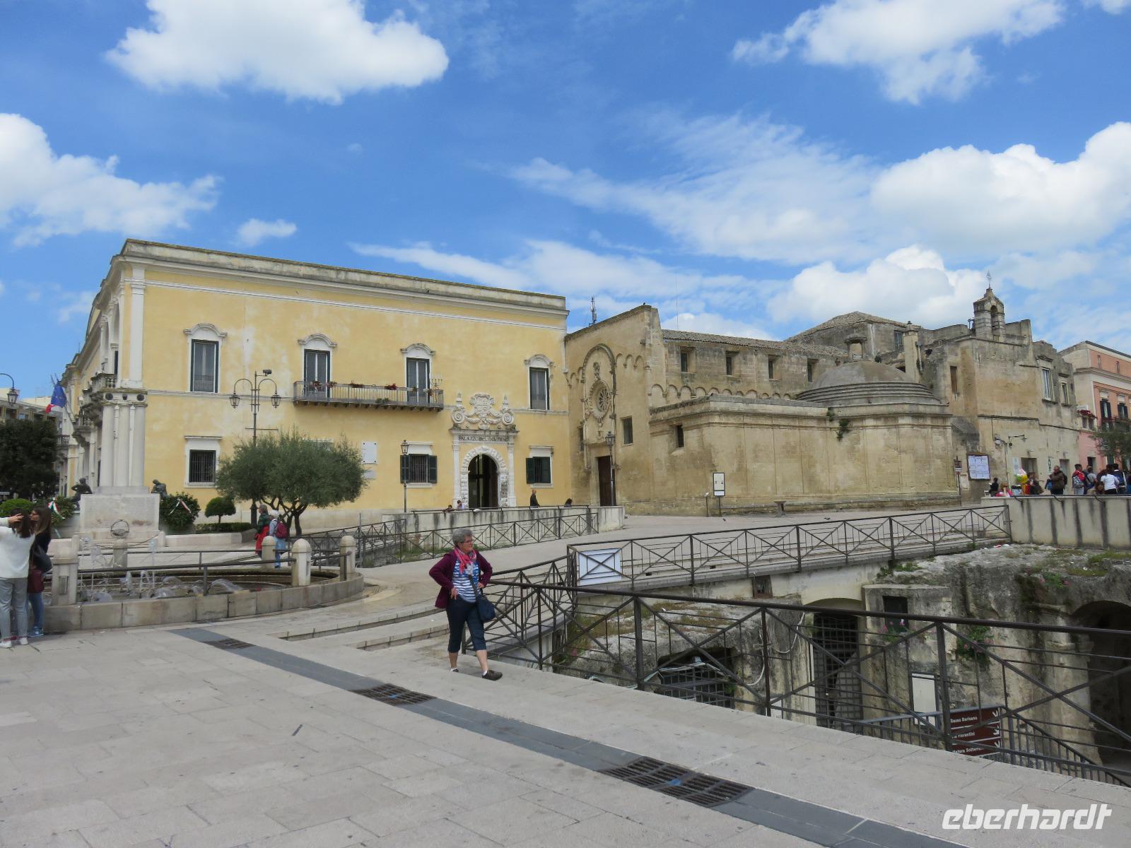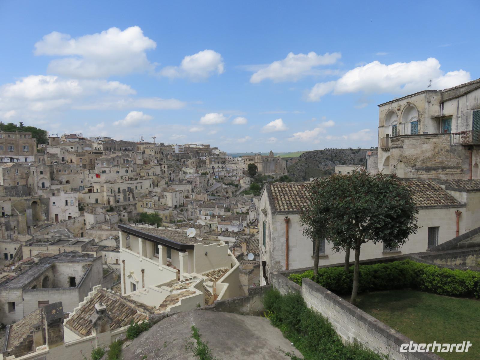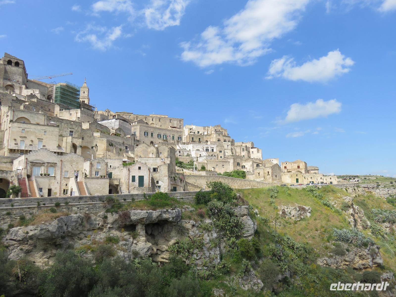 Nach einer kurzen Busfahrt von 20 Minuten erreichten wir Stadt der Sassi (Steine) in der Region Basilikata, Matera. Zunächst spazierten wir durch die Altstadt vorbei an den Palazzi des reichen Bürgertums und weiter zur Höhlenstadt. Kaum vorstellbar wie die Menschen hier lebten, ohne Strom und Wasser. Wir blickten in das Tal der Höhlenwohnungen und stiegen entlang des Passionsweges weiter hinab bis zum Hauptplatz. Von dort waren es wenige Meter bis zu einer eingerichteten Felsenwohnung, der Sasso Caveoso. Nach einem Film zur Einstimmung sahen wir die Einrichtung mit den einzelnen Bereichen. Hier lebten Mensch und Tier auf engstem Raum zusammen, einfache Bauern, Hirten und Tagelöhner. Carlo Levi, Schriftsteller und Arzt, setzte in seinem Roman „Christus kam nur bis Eboli" den Menschen ein literarisches Denkmal. Gleichzeitig zeigte er damit die unwirtlichen Lebensbedingungen auf. Die Wohnungen wurden als nationale Schande empfunden, die Bewohner umgesiedelt. Seit Ende des 20. Jahrhunderts werden die Wohnungen restauriert und teilweise neu aufgebaut. Seit 1993 steht das Gebiet unter dem Schutz der UNESCO. Ein Großteil der Sassi ist heute Eigentum der Stadt Matera. Wer bereit ist, ein Haus zu sanieren, wird mit Subventionen und günstigen Krediten unterstützt. So sahen wir viele restaurierte Hotels, Restaurants, Läden und Wohnungen. Die Stadt war oft Filmkulisse, zum Beispiel für den Film „Die Passion Christi" von Mel Gibson. 2019 wird Matera Kulturhauptstadt Europas sein. Nach einer kleinen Pause am Hauptplatz gingen wir tief beeindruckt hinauf zum Castello Tramontano auf dem Lapillo-Hügel. Von dort fuhren wir wieder zurück zum Hotel.