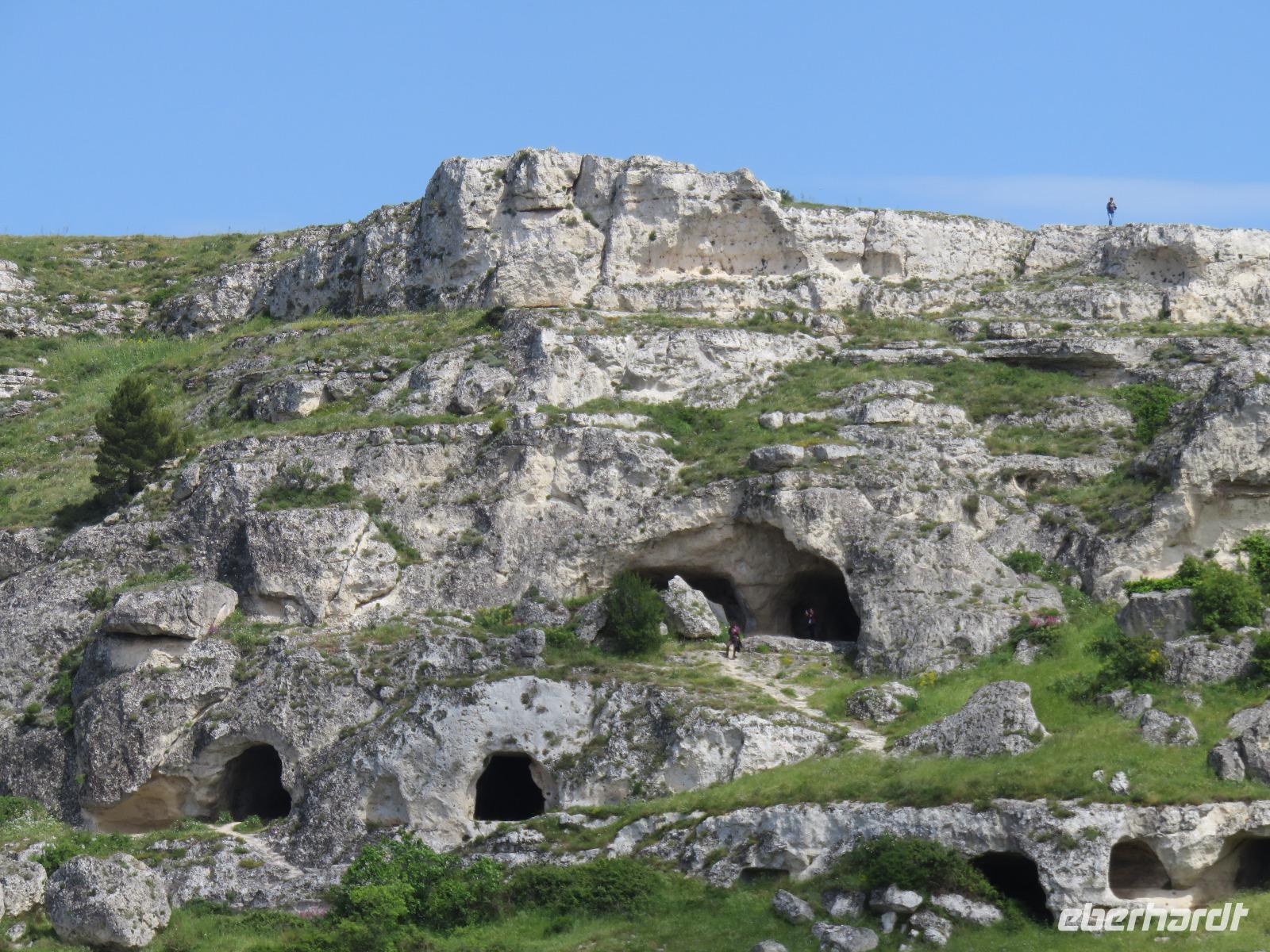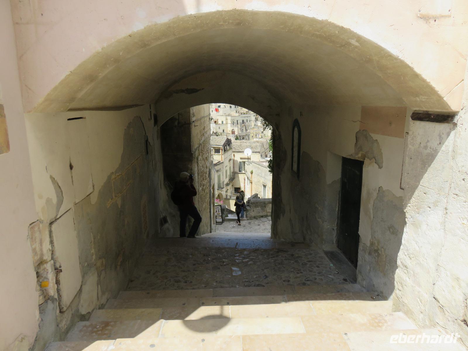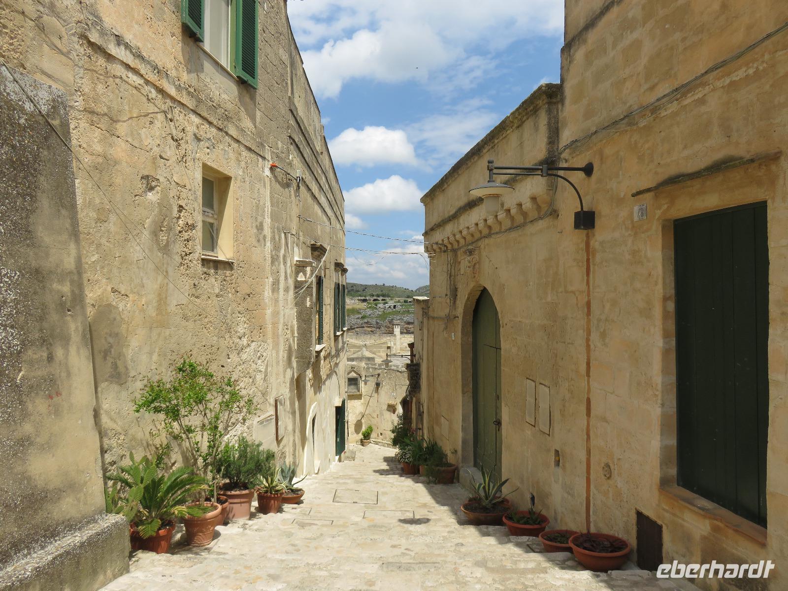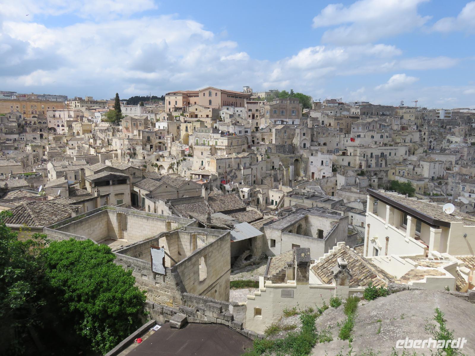 Nach einer kurzen Busfahrt von 20 Minuten erreichten wir Stadt der Sassi (Steine) in der Region Basilikata, Matera. Zunächst spazierten wir durch die Altstadt vorbei an den Palazzi des reichen Bürgertums und weiter zur Höhlenstadt. Kaum vorstellbar wie die Menschen hier lebten, ohne Strom und Wasser. Wir blickten in das Tal der Höhlenwohnungen und stiegen entlang des Passionsweges weiter hinab bis zum Hauptplatz. Von dort waren es wenige Meter bis zu einer eingerichteten Felsenwohnung, der Sasso Caveoso. Nach einem Film zur Einstimmung sahen wir die Einrichtung mit den einzelnen Bereichen. Hier lebten Mensch und Tier auf engstem Raum zusammen, einfache Bauern, Hirten und Tagelöhner. Carlo Levi, Schriftsteller und Arzt, setzte in seinem Roman „Christus kam nur bis Eboli" den Menschen ein literarisches Denkmal. Gleichzeitig zeigte er damit die unwirtlichen Lebensbedingungen auf. Die Wohnungen wurden als nationale Schande empfunden, die Bewohner umgesiedelt. Seit Ende des 20. Jahrhunderts werden die Wohnungen restauriert und teilweise neu aufgebaut. Seit 1993 steht das Gebiet unter dem Schutz der UNESCO. Ein Großteil der Sassi ist heute Eigentum der Stadt Matera. Wer bereit ist, ein Haus zu sanieren, wird mit Subventionen und günstigen Krediten unterstützt. So sahen wir viele restaurierte Hotels, Restaurants, Läden und Wohnungen. Die Stadt war oft Filmkulisse, zum Beispiel für den Film „Die Passion Christi" von Mel Gibson. 2019 wird Matera Kulturhauptstadt Europas sein. Nach einer kleinen Pause am Hauptplatz gingen wir tief beeindruckt hinauf zum Castello Tramontano auf dem Lapillo-Hügel. Von dort fuhren wir wieder zurück zum Hotel.