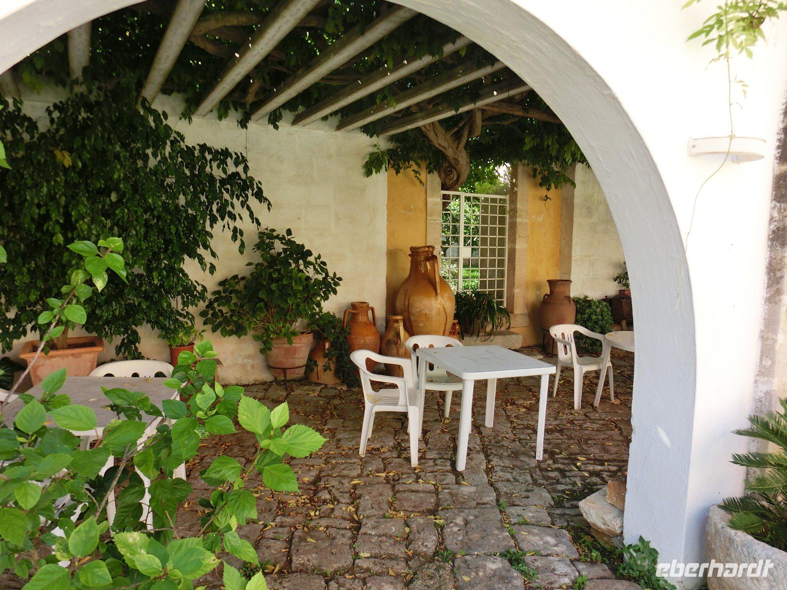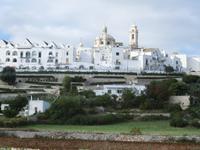 Pünktlich 12:00 Uhr treffen wir zum Mittagessen in der Masseria Refrigerio ein. Über 2 h läßt die Chefin eine Köstlichkeit nach der anderen auftafeln. Wir genießen die italienische Küche und den Wein. Kurze Busfahrt nach Ostuni, die "weiße Stadt" wegen der schneeweiß gekalkten Häuser. Von der Aussichtsterrasse genießen wir den Blick ins Umland.