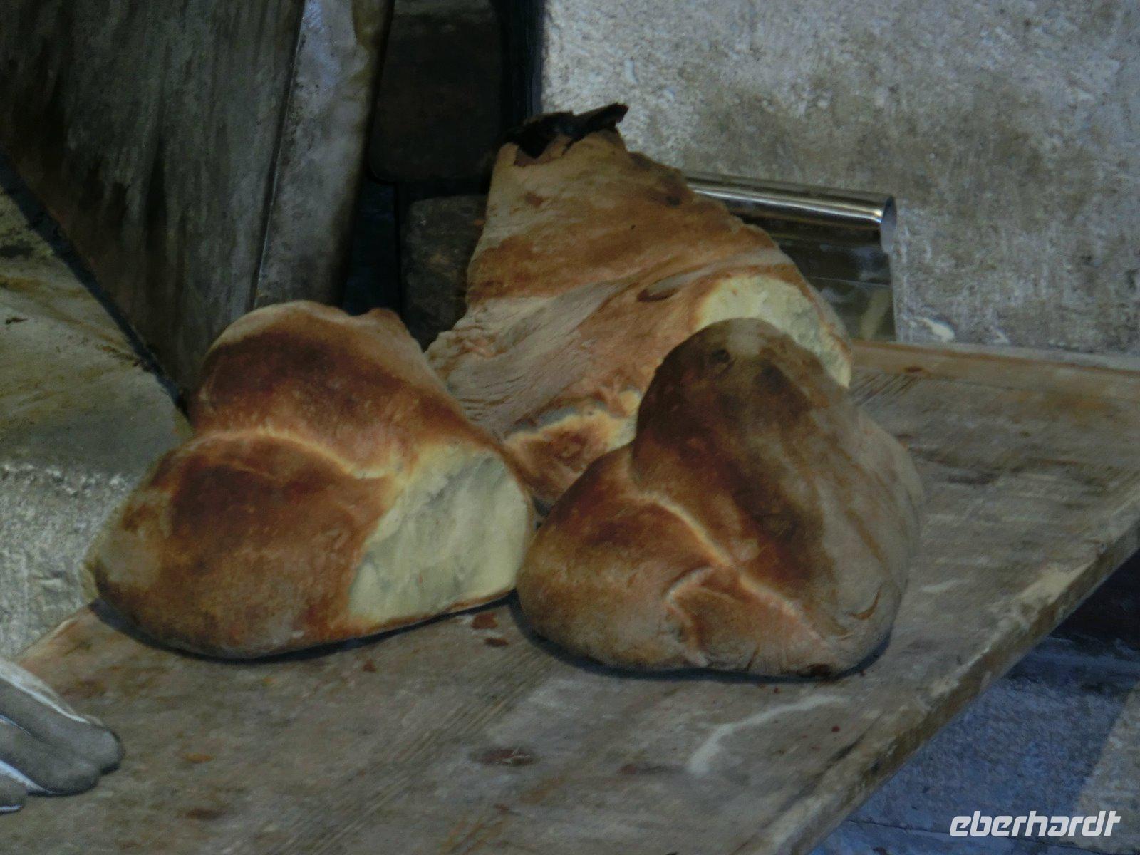 Ein Highlight dieser Reise war der Besuch einer Bäckerei in Altamura, wo in einen riesigen Steinofen, mit Eichenholz befeuert, Brot gebacken wird. Brot goldgelb, mit knuspriger Kruste, 5 Tage haltbar aus Hartweizen. Wir kamen zur richtigen Zeit, als mittels eines 6 m langen Schiebers die Brote aus dem Ofen geholt wurden. Natürlich durften wir ausgiebig kosten.