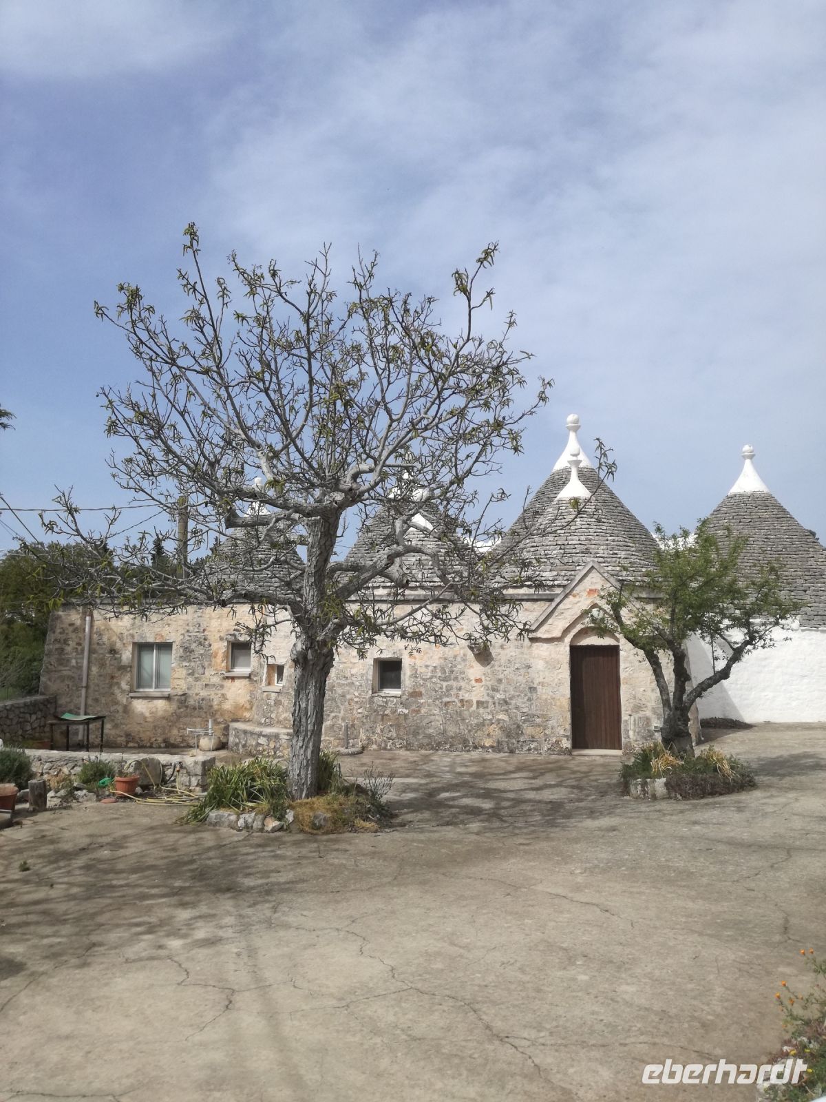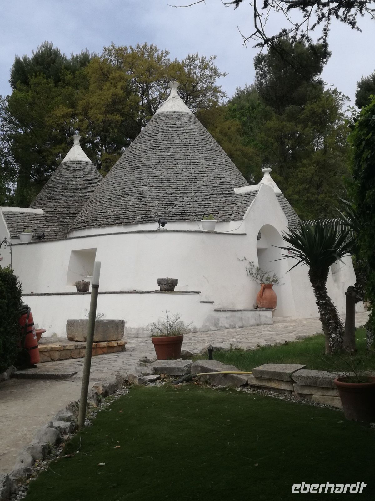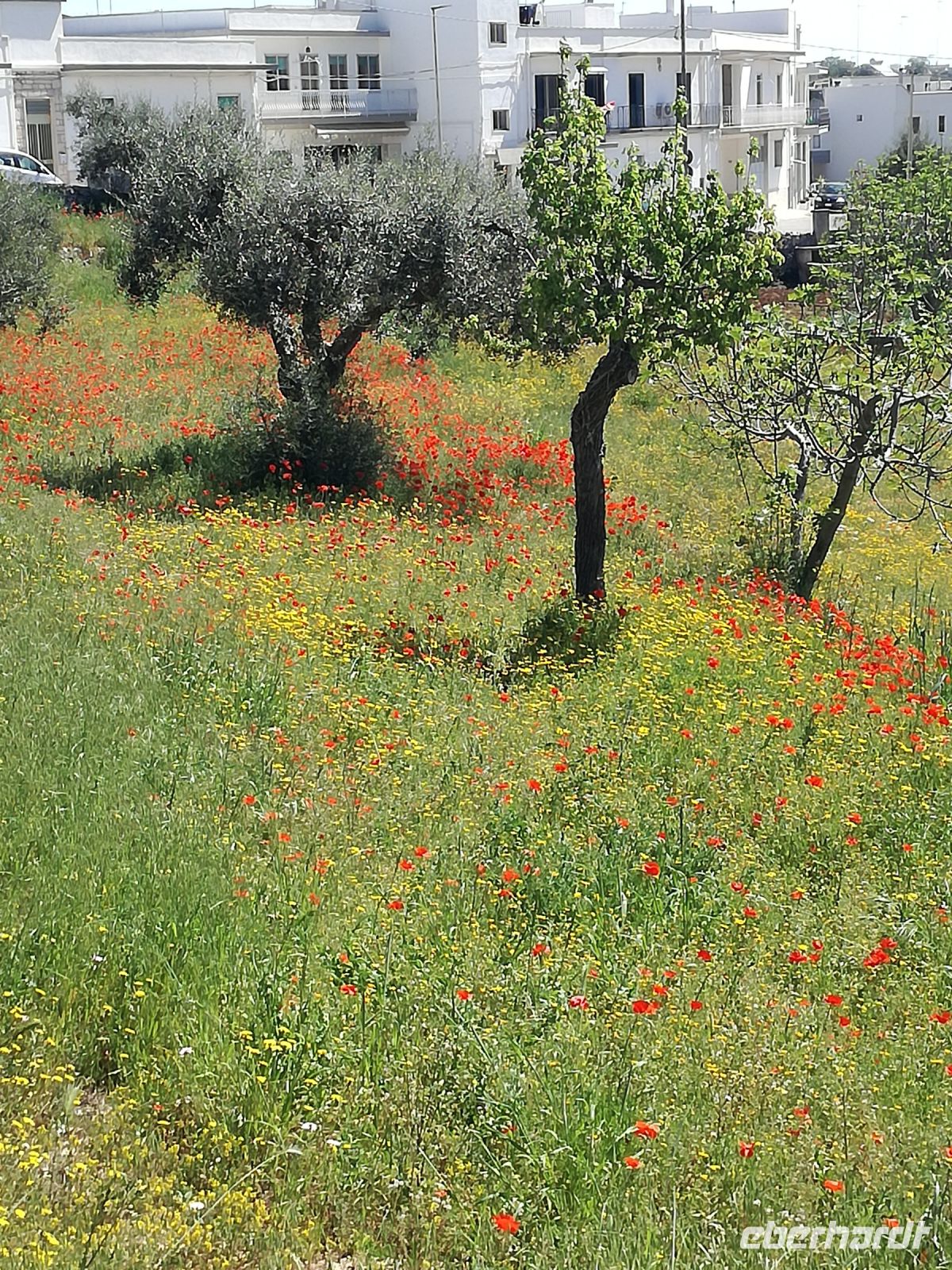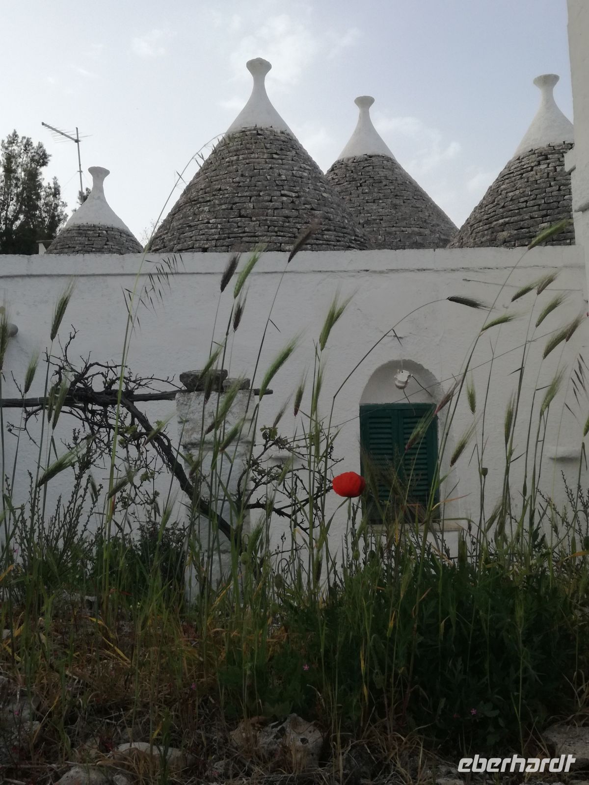 Apulien empfängt uns in frischem Grün und frühlingshaft, Olivenbäume ziehen sich über das ganze Land, bunte Blumenwiesen mit tiefrotem Mohn und dann die majestätischen Pinien, die wie ein riesiges Schattendach wirken. Wir erhalten im Transferbus erste Informationen über Apulien, auch Puglia genannt. Reiseleiterin Mirella empfängt uns schon am Hotel, wo 3 weitere Gäste aus Frankfurt eingetroffen sind. Eine symphatische Reiseleiterin mit einem riesigen Wissen, wie wir bald feststellen werden. Sie bietet uns nachmittags einen Rundgang durch den Ort an. Dieser ist klein und eigentlich nicht spektakulär, wenn da nicht die vielen selbstgebauten Trullis und Villen der gut betuchten Leute wäre, wie uns Mirella erklärt.