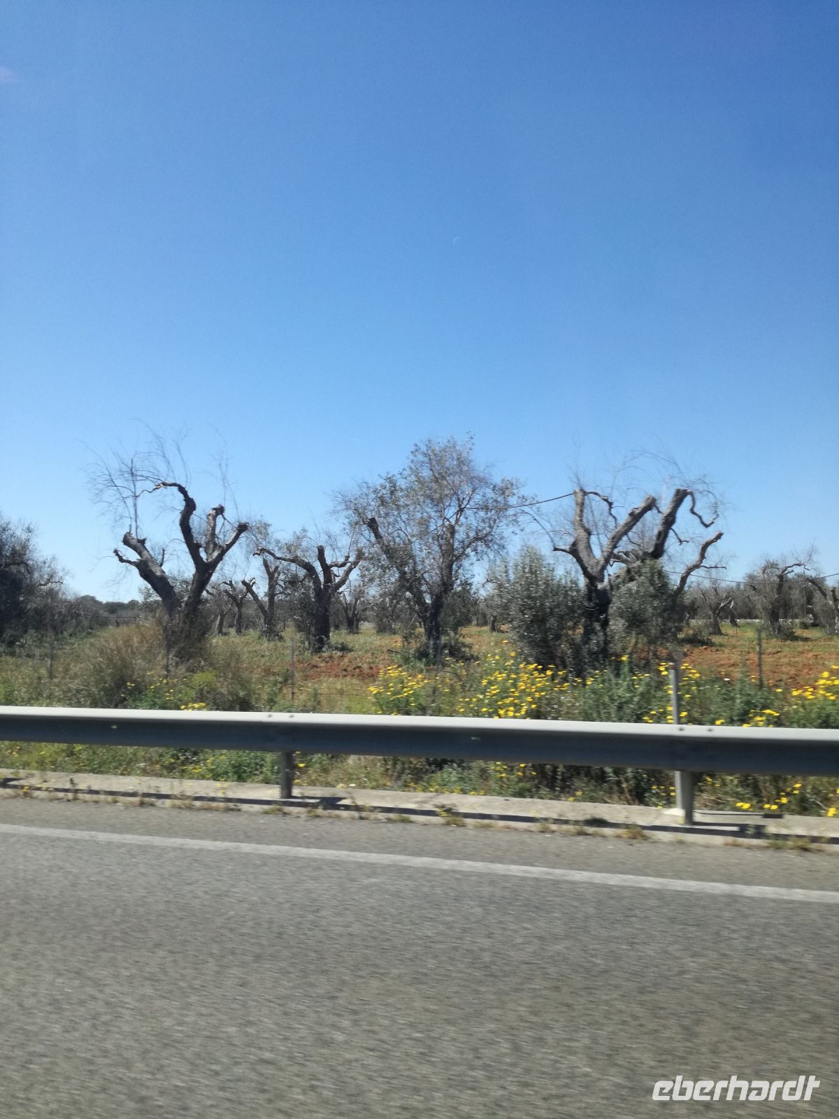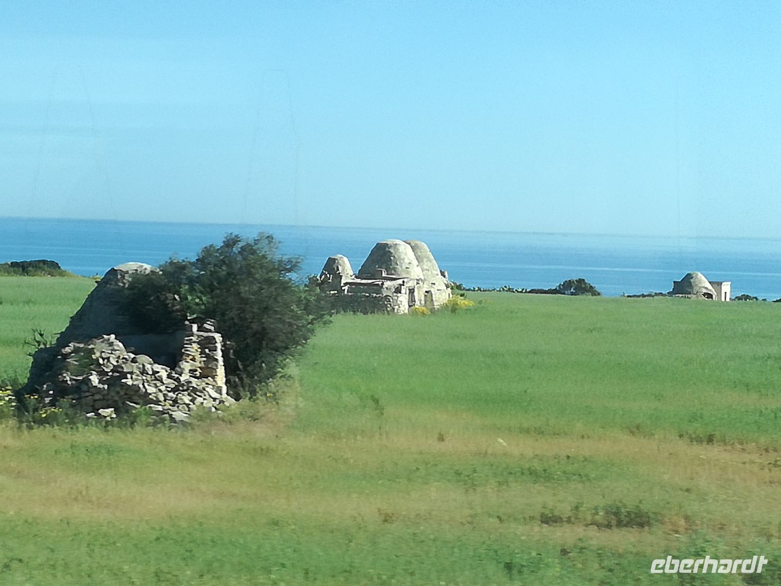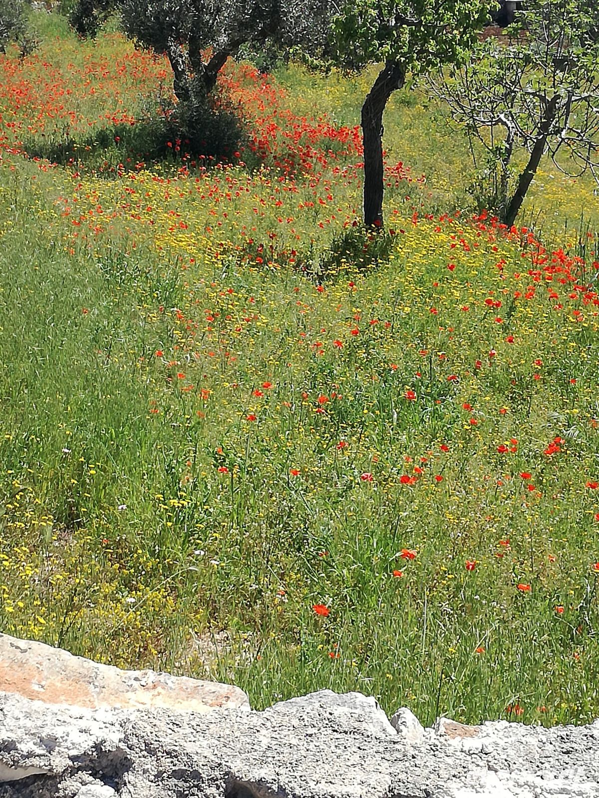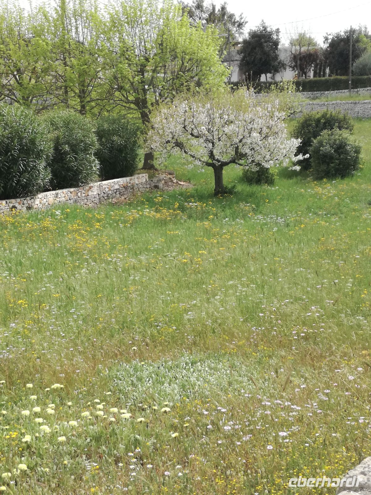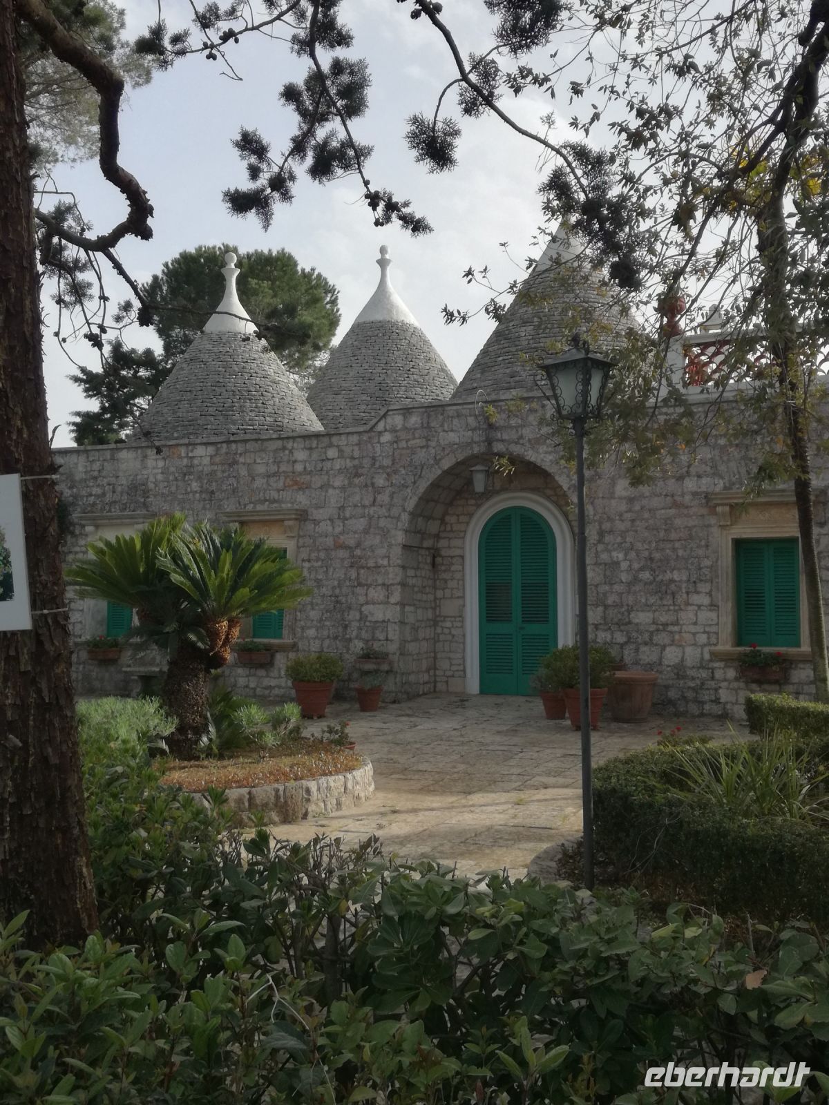 Apulien empfängt uns in frischem Grün und frühlingshaft, Olivenbäume ziehen sich über das ganze Land, bunte Blumenwiesen mit tiefrotem Mohn und dann die majestätischen Pinien, die wie ein riesiges Schattendach wirken. Wir erhalten im Transferbus erste Informationen über Apulien, auch Puglia genannt. Reiseleiterin Mirella empfängt uns schon am Hotel, wo 3 weitere Gäste aus Frankfurt eingetroffen sind. Eine symphatische Reiseleiterin mit einem riesigen Wissen, wie wir bald feststellen werden. Sie bietet uns nachmittags einen Rundgang durch den Ort an. Dieser ist klein und eigentlich nicht spektakulär, wenn da nicht die vielen selbstgebauten Trullis und Villen der gut betuchten Leute wäre, wie uns Mirella erklärt.
