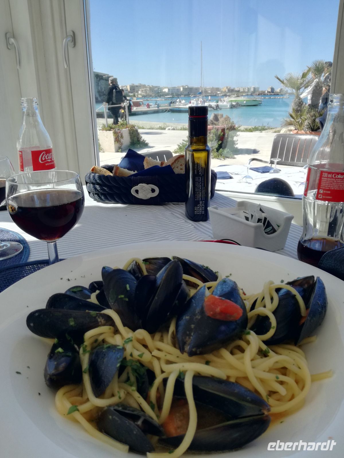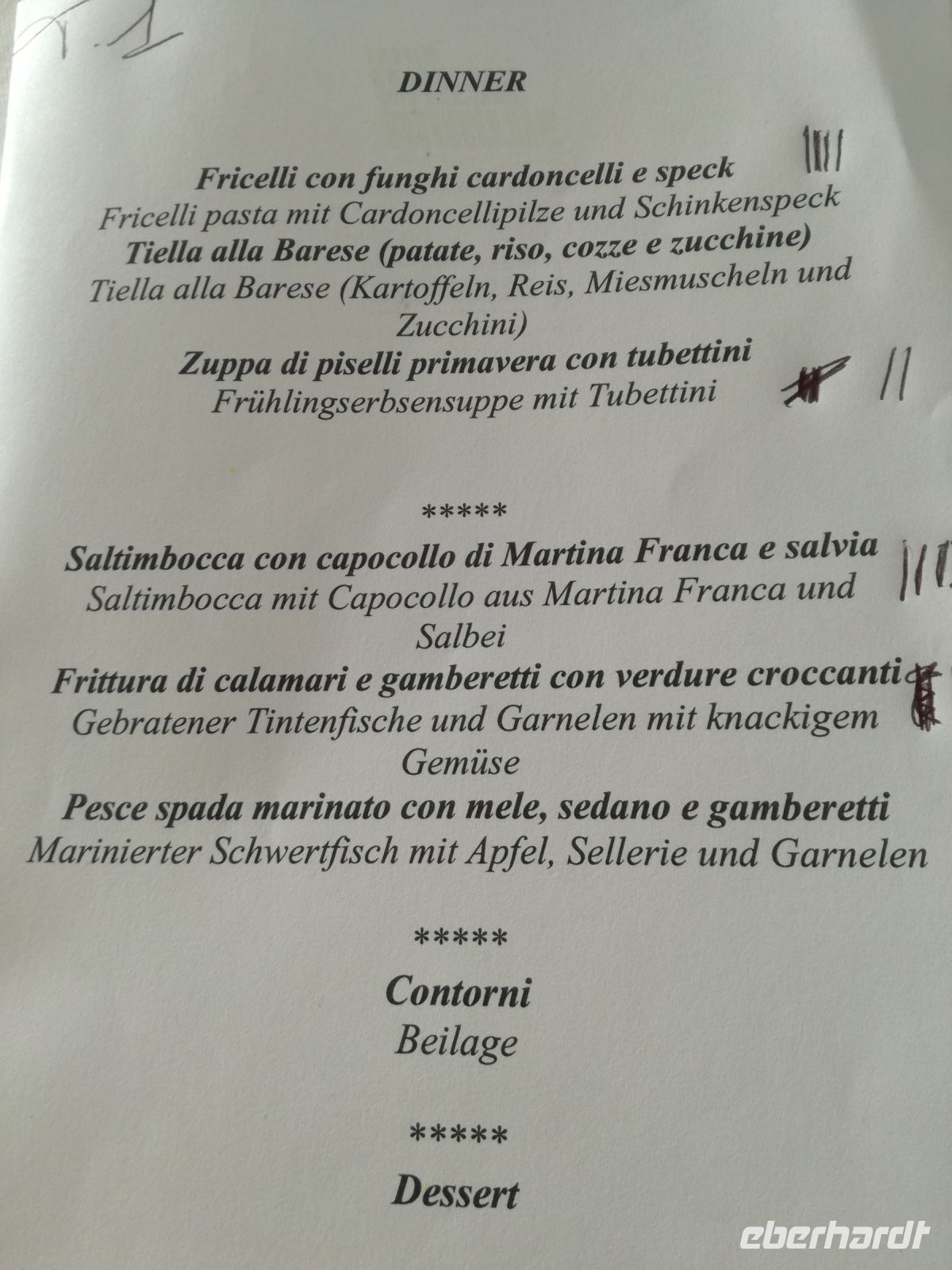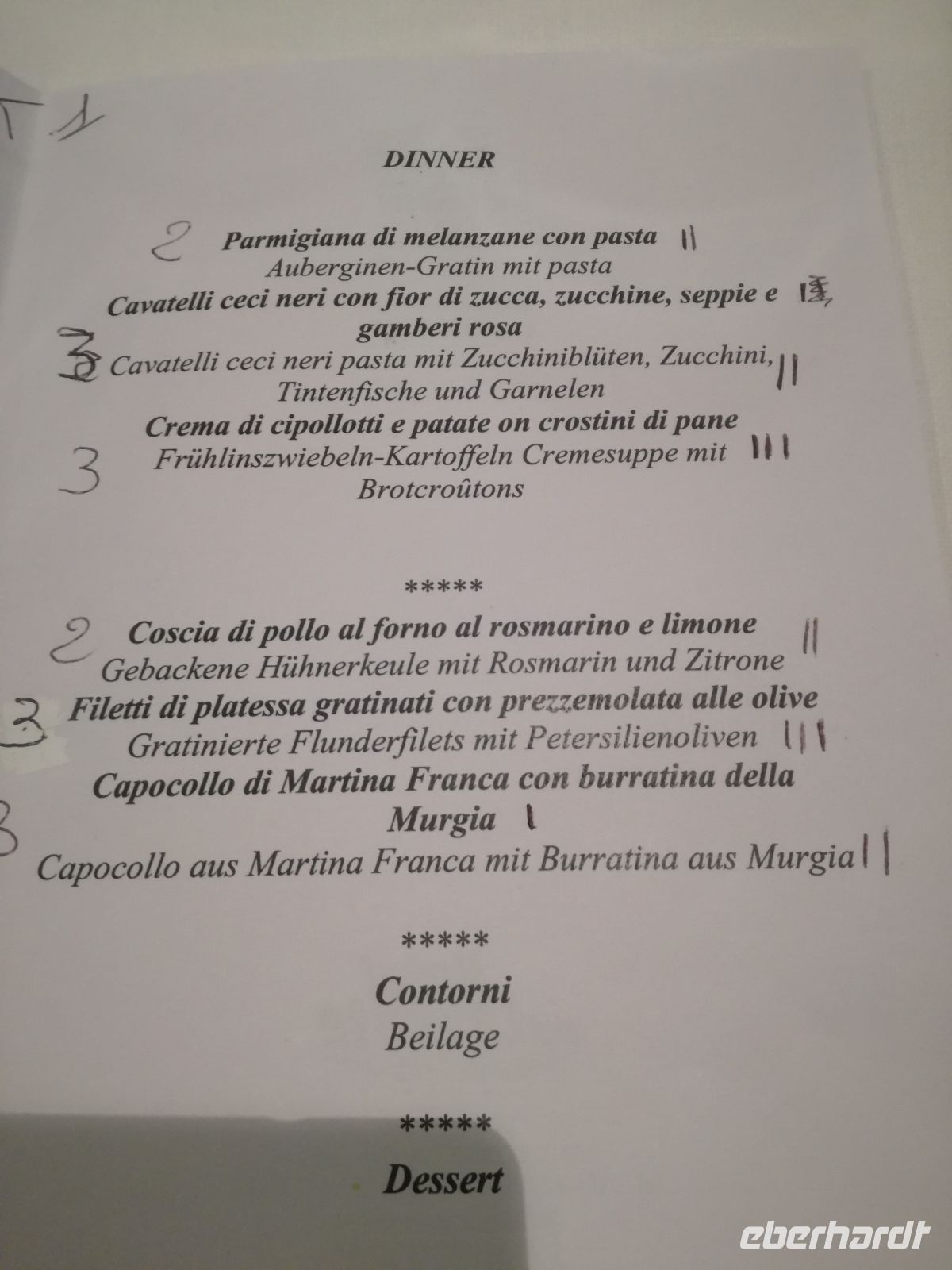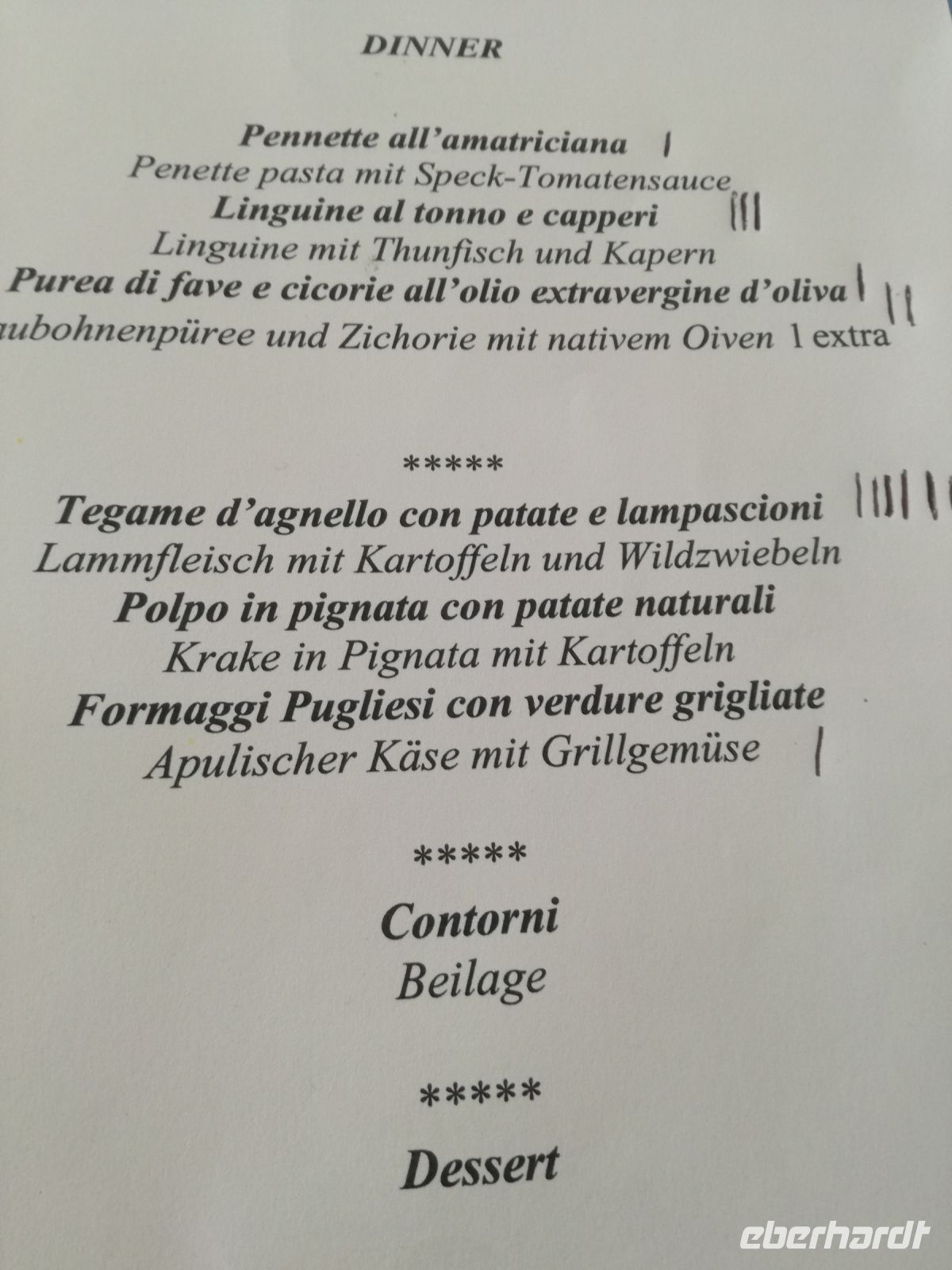 Unser Abendessen nehmen wir im Hotel gemeinsam ein, apulianische Küche als Wahlmenü. Es ist erst der Beginn der kulinarischen Genüsse, die wir die gesamte Woche erleben werden.