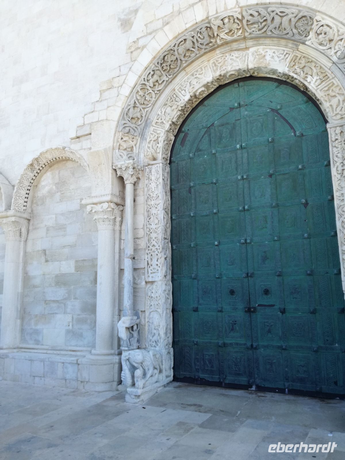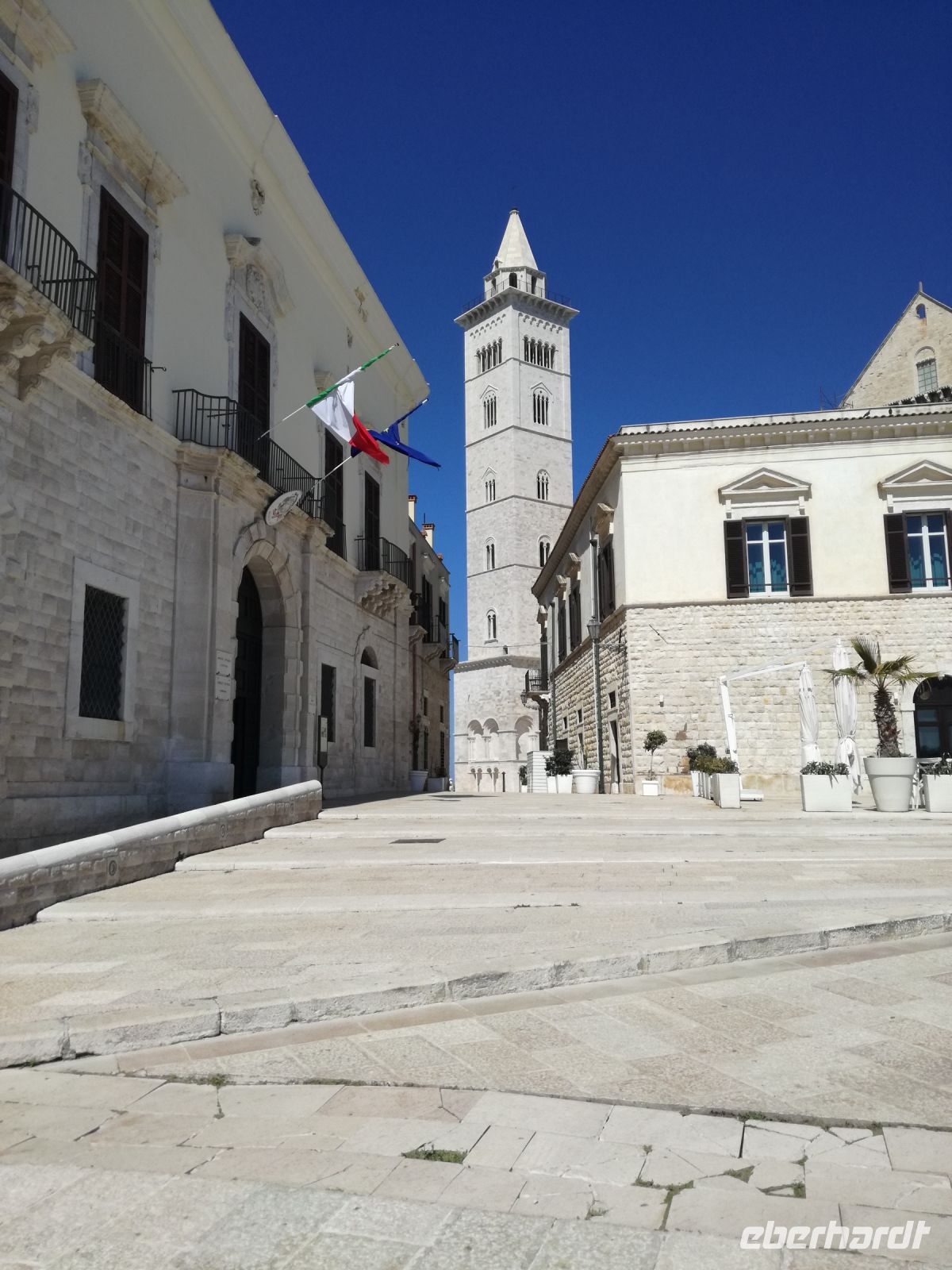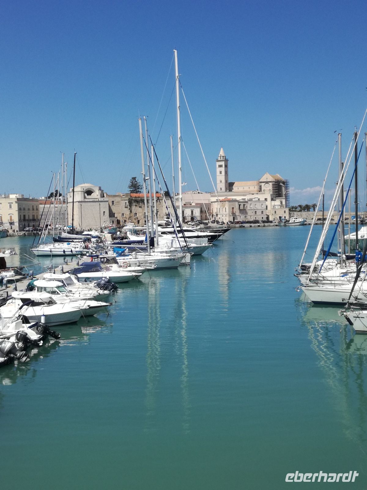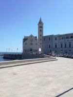 In der Hafenstadt Trani genießt man schon einen Hauch von Luxus, auch wenn das Leben erst im Frühlingserwachen ist . Das Städtchen mit seinen 70.000 Einwohnern liegt direkt am Meer und war durch seine strategische Lage wichtigstes Schiffahrts- und Handelszentrum Apuliens. Grau weiß gekalkt aus dem Naturstein Pietra Tranese sind die Häuser in der Altstadt Und auch die Kathedrale und geben ein imposantes Bild ab. Mondän ragt die Kathedrale San Nicola Pellegrino am Meer empor, eine Wallfahrtskirche, die wir auch besichtigen. Sie wurde im 13.Jahrhundert fertig gestellt und ist eines der perfektesten Beispiele romanischer Baukunst Apuliens.