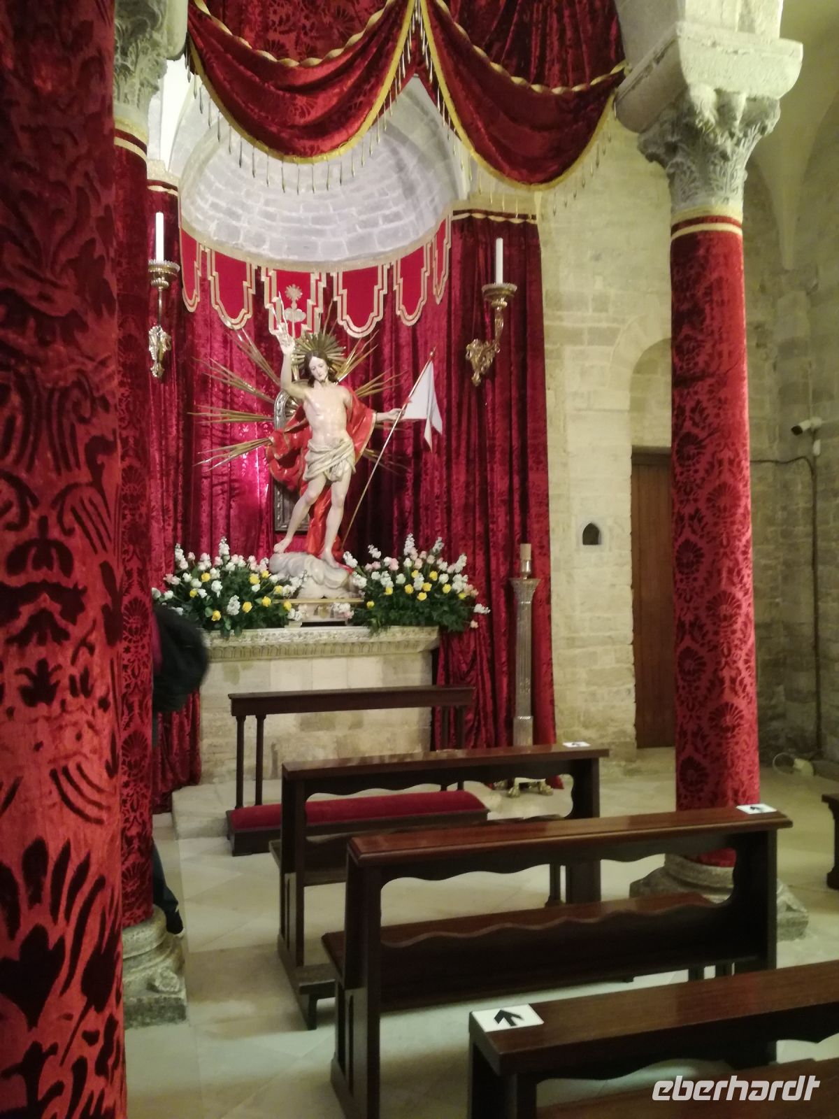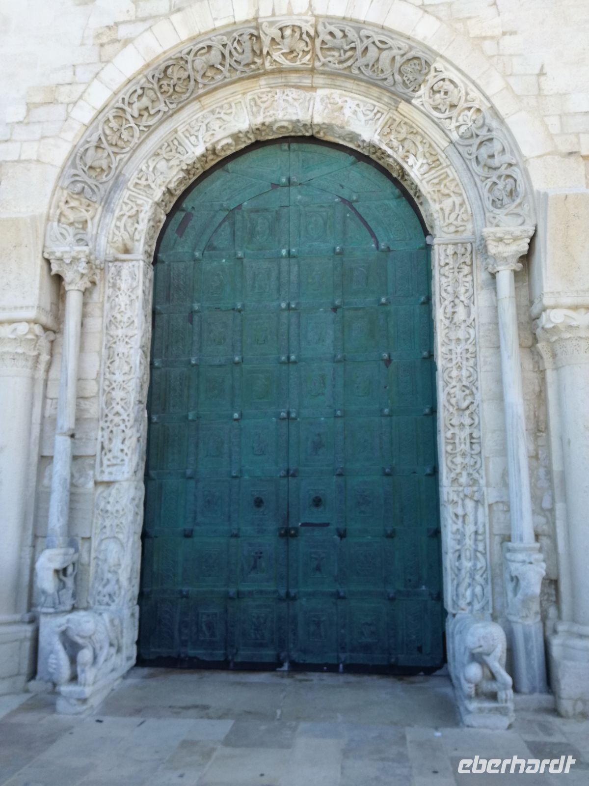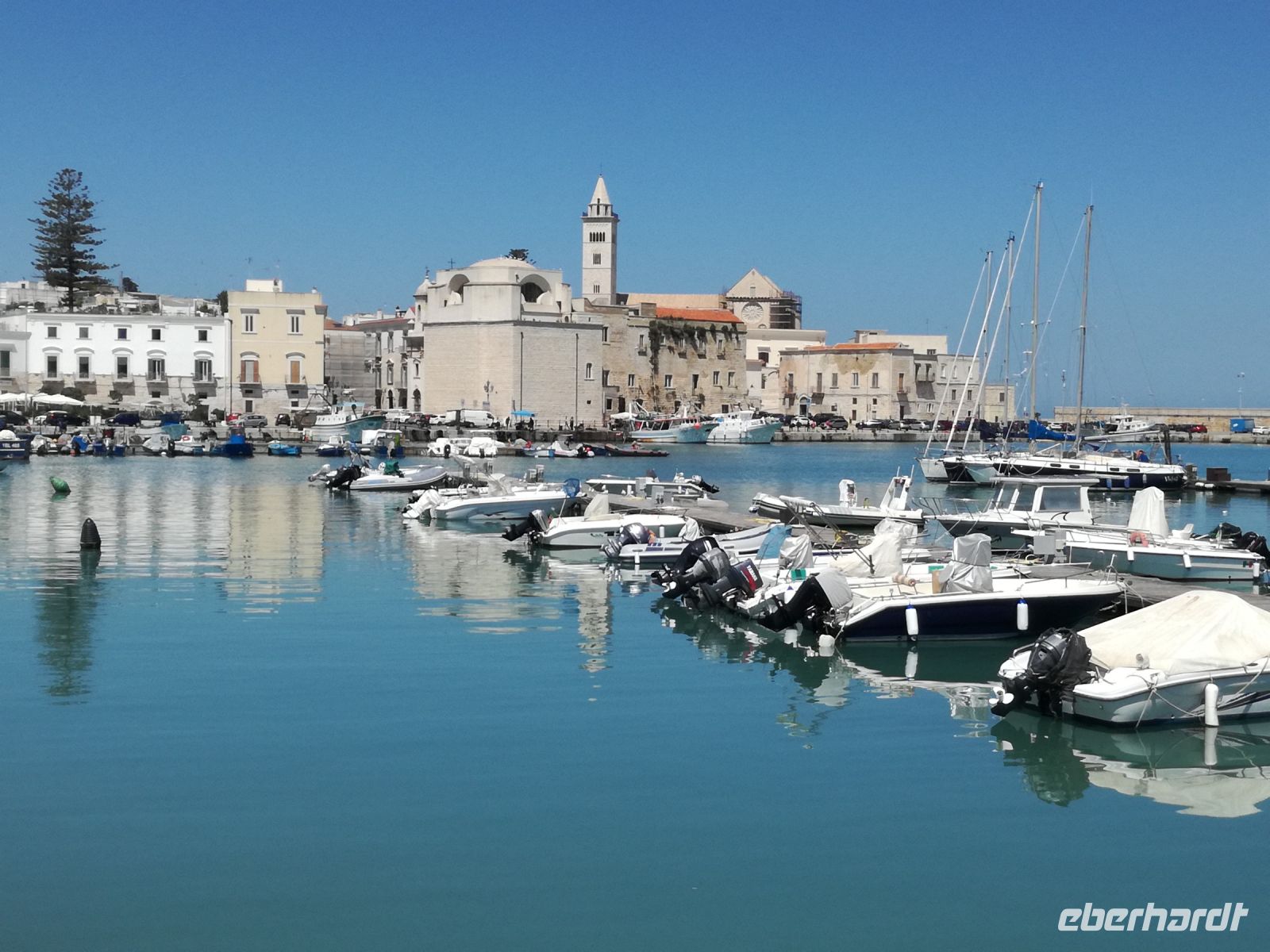 In der Hafenstadt Trani genießt man schon einen Hauch von Luxus, auch wenn das Leben erst im Frühlingserwachen ist . Das Städtchen mit seinen 70.000 Einwohnern liegt direkt am Meer und war durch seine strategische Lage wichtigstes Schiffahrts- und Handelszentrum Apuliens. Grau weiß gekalkt aus dem Naturstein Pietra Tranese sind die Häuser in der Altstadt Und auch die Kathedrale und geben ein imposantes Bild ab. Mondän ragt die Kathedrale San Nicola Pellegrino am Meer empor, eine Wallfahrtskirche, die wir auch besichtigen. Sie wurde im 13.Jahrhundert fertig gestellt und ist eines der perfektesten Beispiele romanischer Baukunst Apuliens.