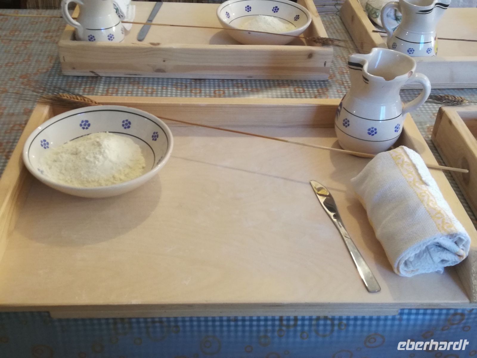 Eine Masseria, italienisch auch Masseri ist ein Gutshof. Heute werden wir ganz im ländlichen unterwegs sein und dürfen auch etwas später am Vormittag losfahren. Erst einmal sind wir angetan von den vielen riesigen Olivenbäumen dem wunderschönen Kräutergarten mit Orangenbäumen. Dann geht’s für uns ans Werk. Liebevoll ist für jeden ein Brettchen mit Zutaten vorbereitet in dessen Ergebnis wir Öhrchennudeln herstellen sollen. Schnell ein Schürzchen um , dass bei den großen Männern eher wie ein Lendenschurz aussieht und dann geht es auch schon los mit Kneten. Mit strengen Gesichtern arbeiten wir unter strenger Aufsicht hartnäckig an der richtigen Konsistenz des Teigs. Zu viel Wasser ? zu viel Mehl? irgendwie haut es doch nie hin. Nun noch die Öhrchenform abschnipsen. Nein, es ist alles Andere als ein Öhrchen, aber macht unheimlich Spaß.