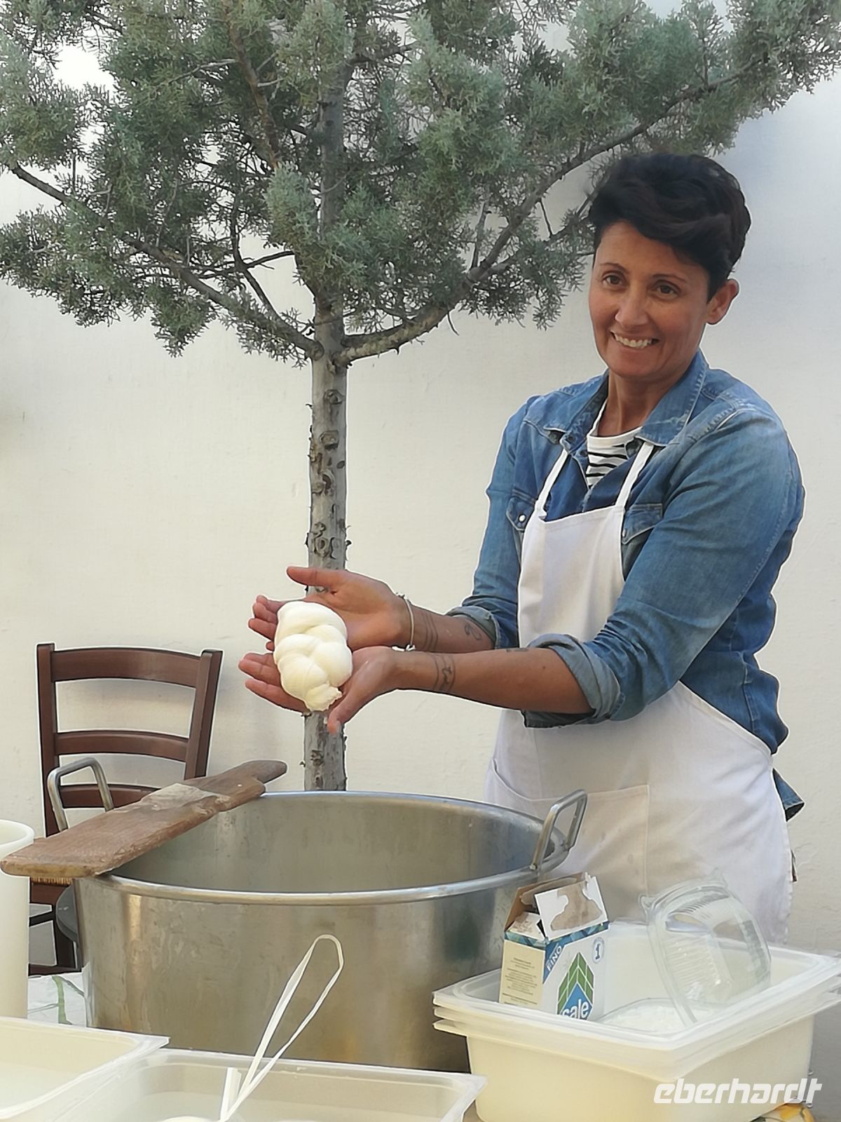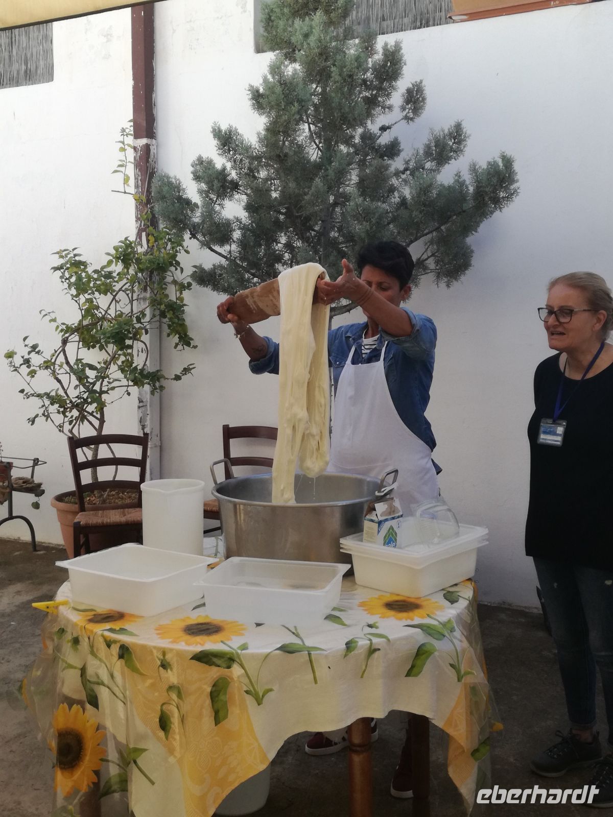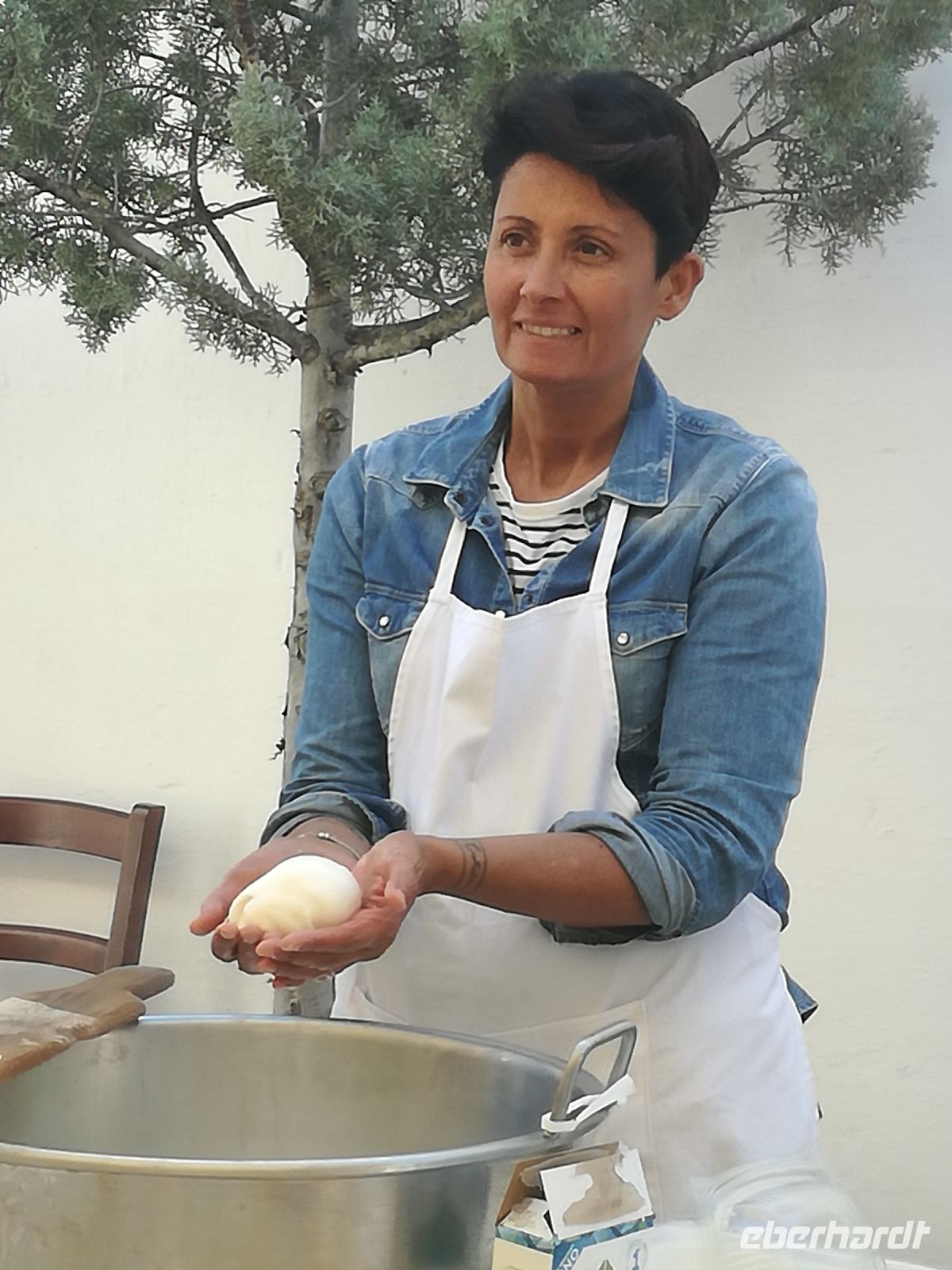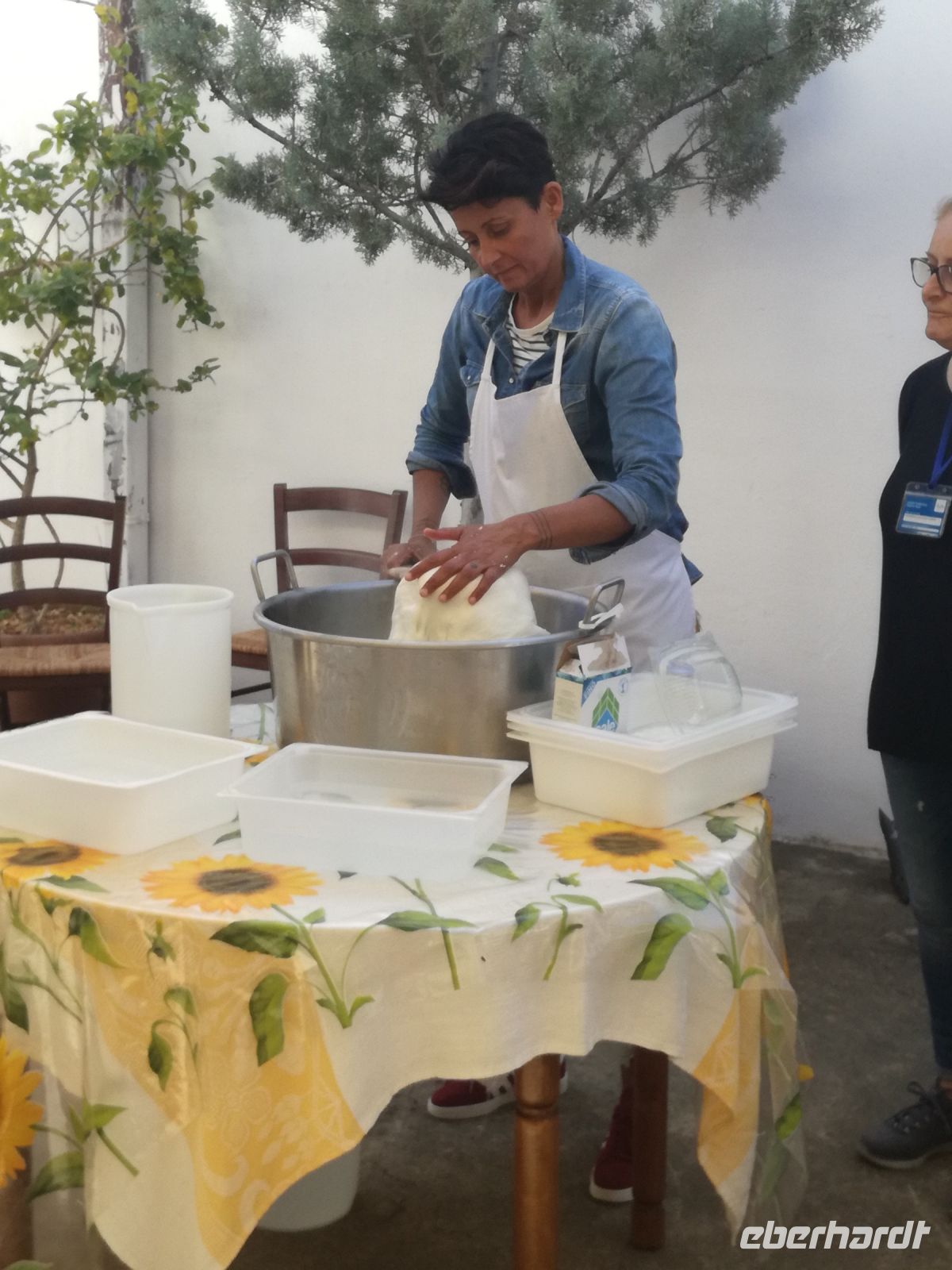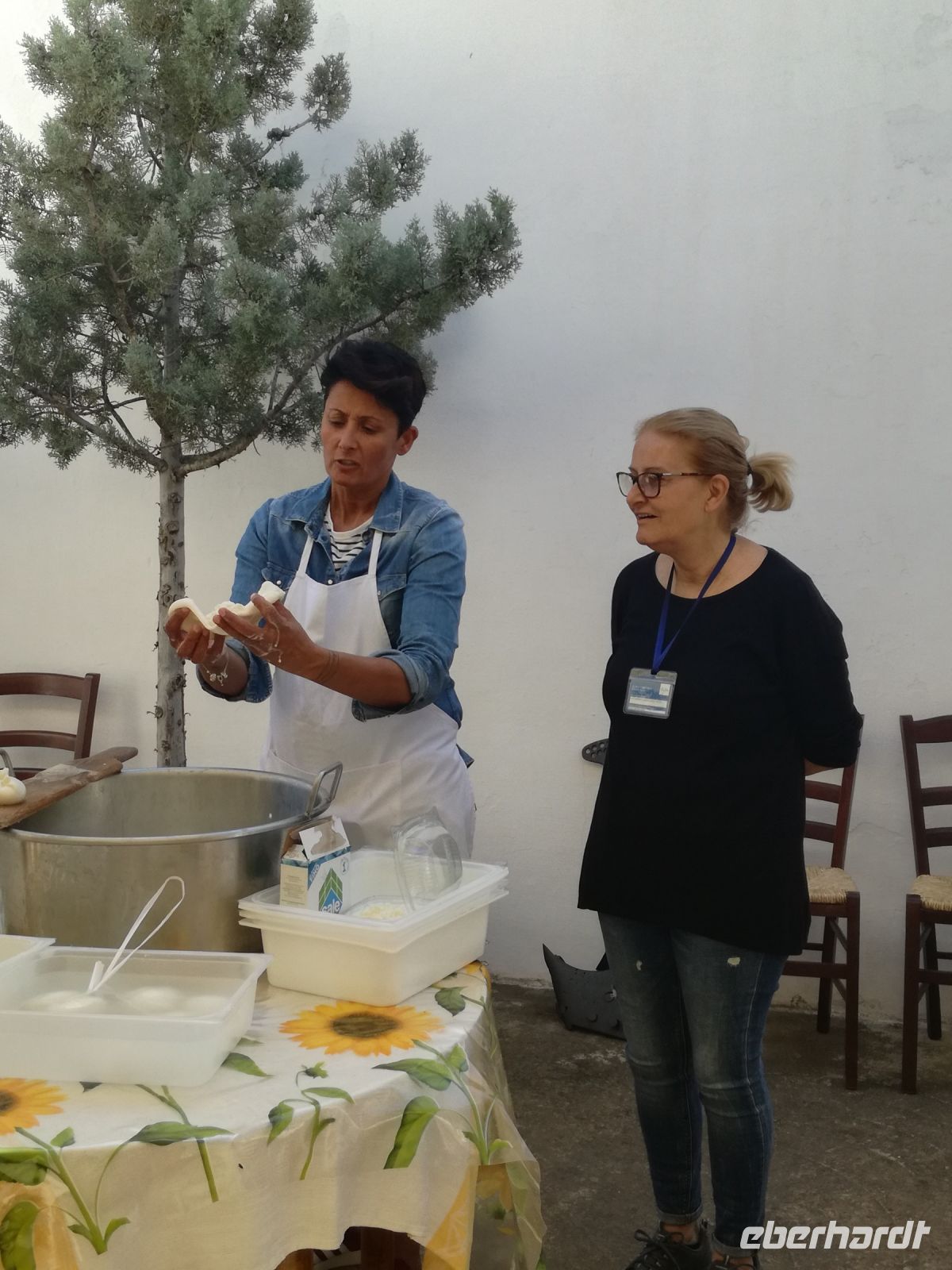 Die anschließende demonstrierte Mozarella Herstellung ist eine Augenweide. Da beherrscht jemand sein Fach, dreht Zöpfe aus der Mozarella-Masse und demonstriert die Herstellung einer Burrata. Nun haben wir genug gesehen, wir werden zu Tisch gebeten. Erleichterung bei Einigen, dass sie ihre selbst hergestellten Öhrchen nicht essen müssen?Wir erleben einen schönen Nachmittag in den Gemäuern der Masseria bei einem leckeren Essen. Jetzt kommen die Spezialitäten Apuliens auf den Tisch, Pasta, Buratta, Copocollo….und dazu viel Wein. Ein wunderschöner Nachmittag geht zu Ende.