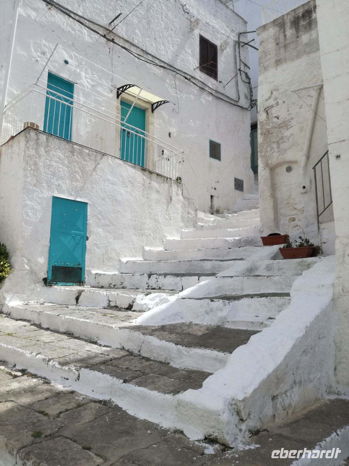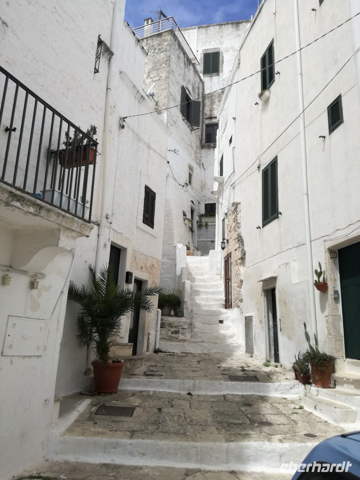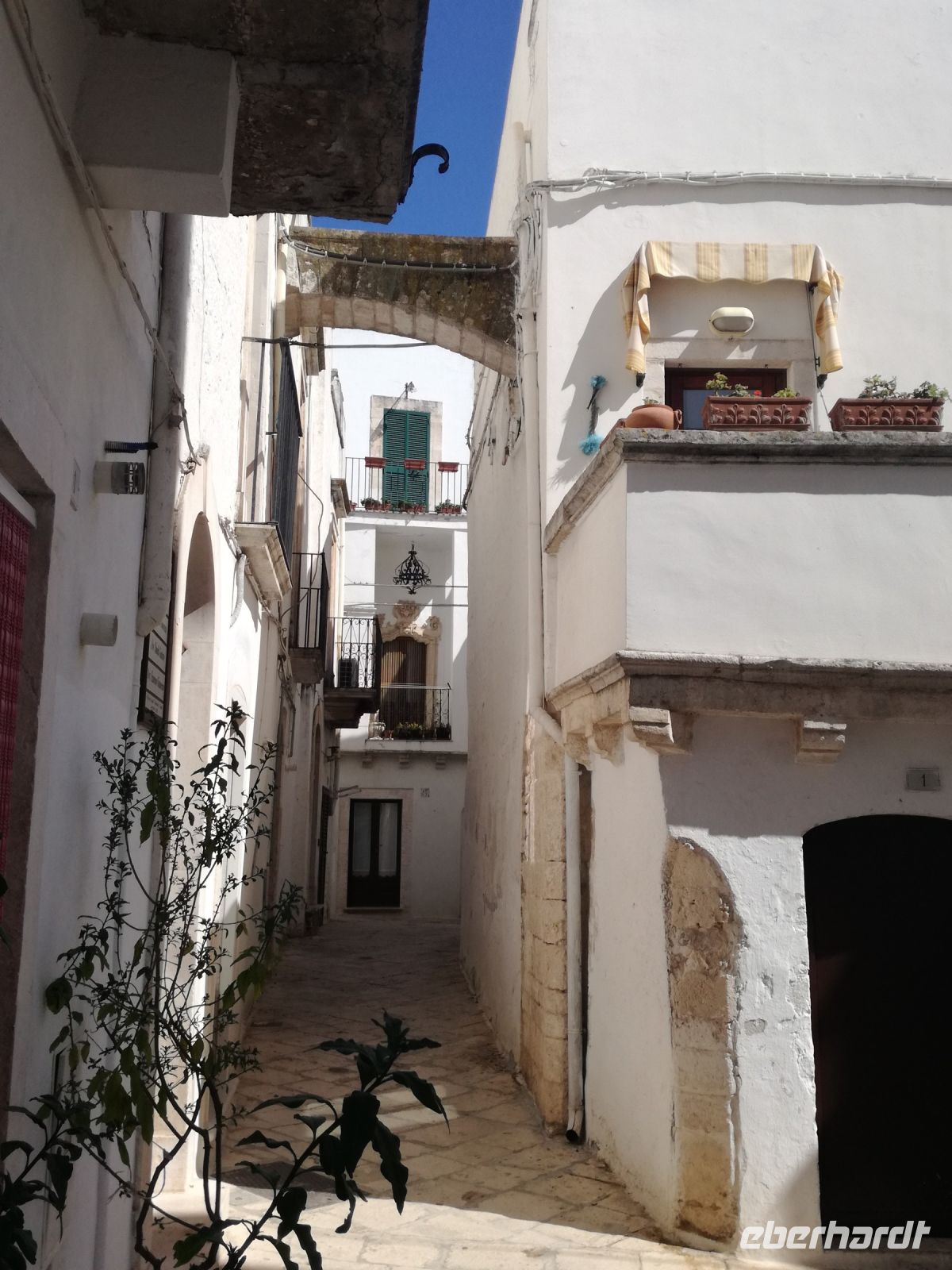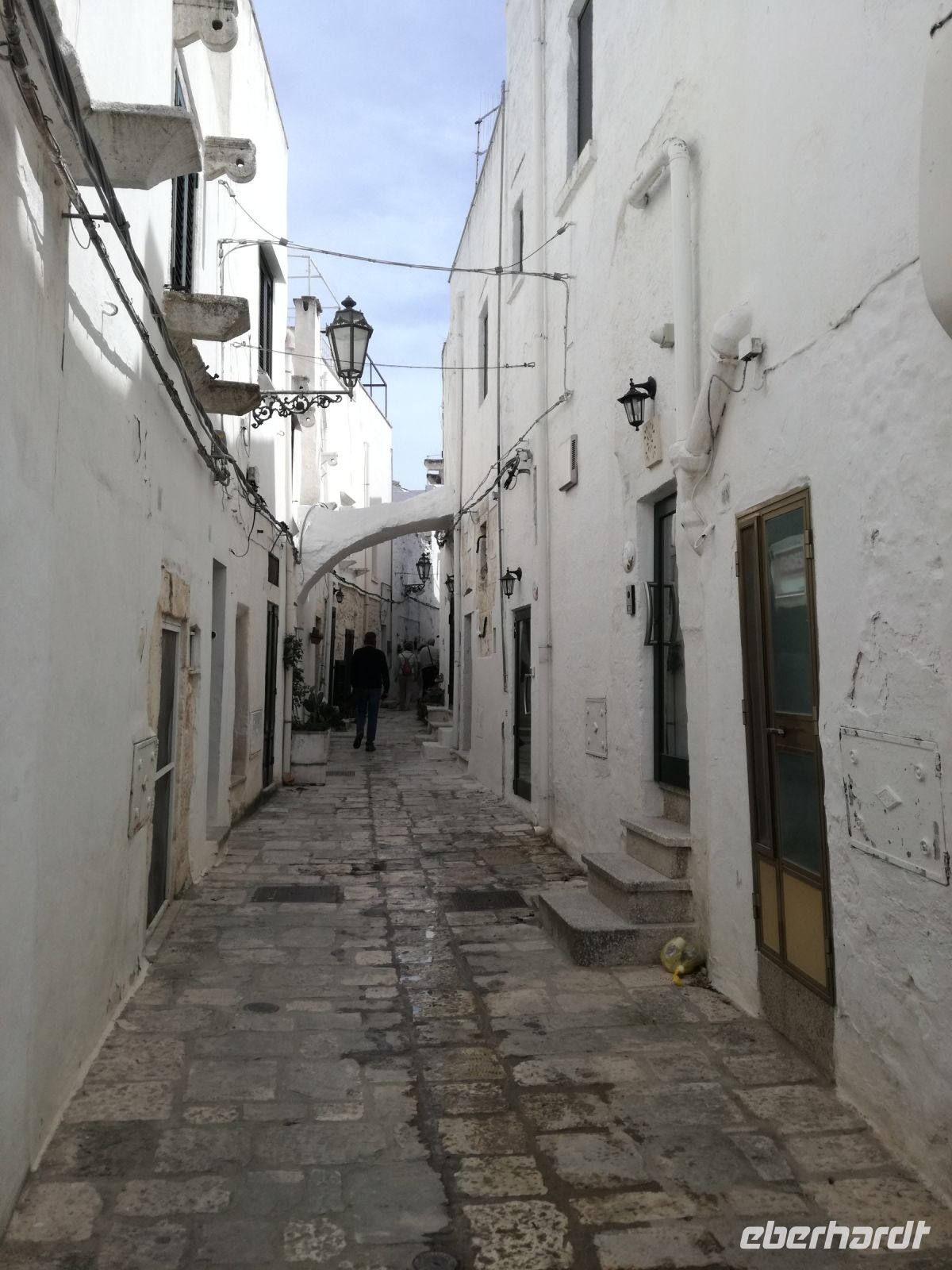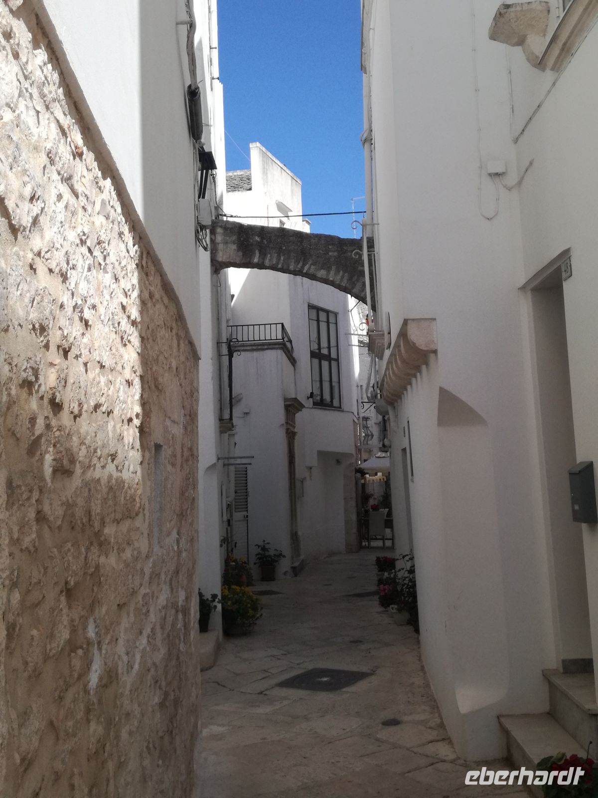 Am Nachmittag besuchen wir Ostuni, die weiße Stadt auf 3 Hügeln. Ostuni ist ein Ort für Verliebte, ganz in weiß gehalten mit wunderschönen Gassen und Piazzas. Wir lassen uns treiben und nehmen in den Gassen endlose Fotomotive mit. Weiß und sauber leuchten die Häuser im Kontrast zum blauen Himmel. Mirella erklärt uns, dass die Bögen zwischen den Häusern dazu dienten, bei Gefahr in ein anderes Haus zu klettern.