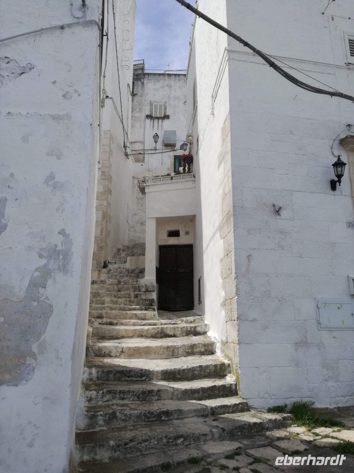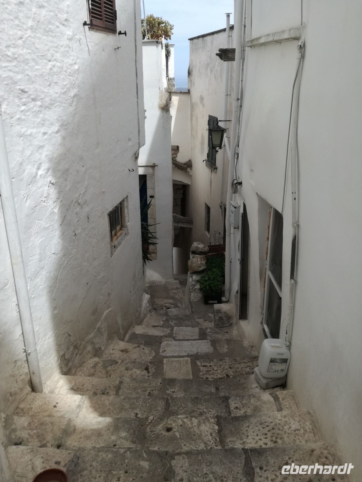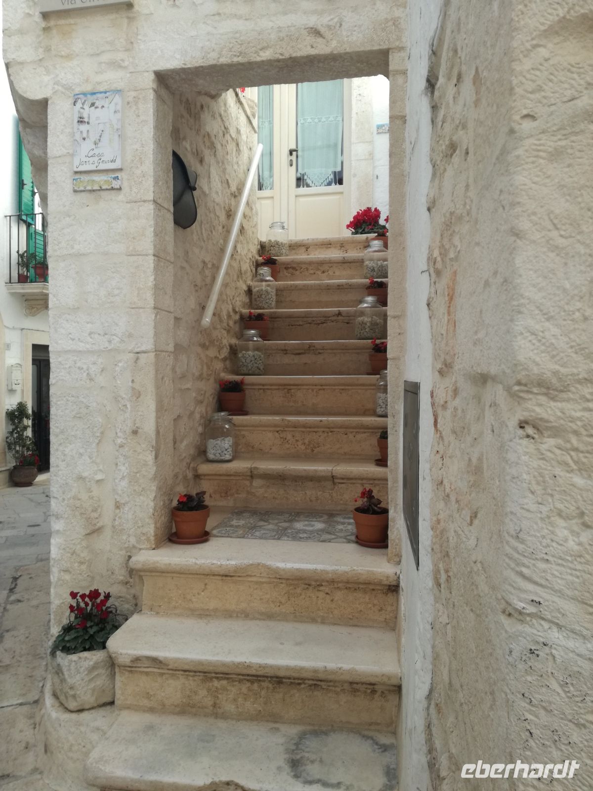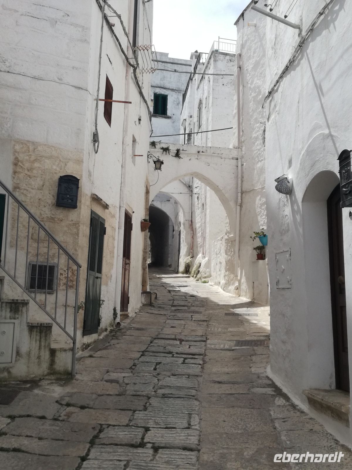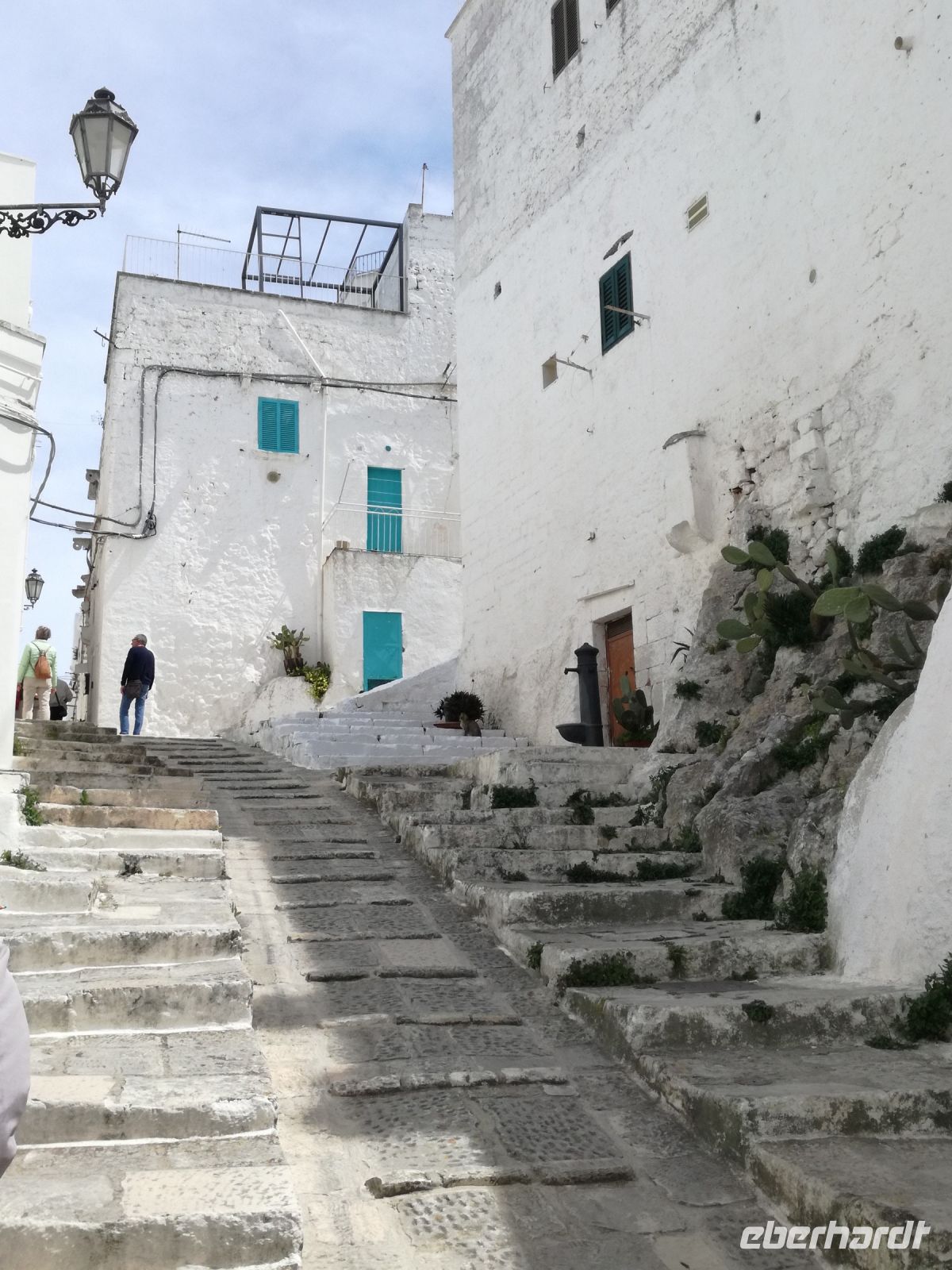 Am Nachmittag besuchen wir Ostuni, die weiße Stadt auf 3 Hügeln. Ostuni ist ein Ort für Verliebte, ganz in weiß gehalten mit wunderschönen Gassen und Piazzas. Wir lassen uns treiben und nehmen in den Gassen endlose Fotomotive mit. Weiß und sauber leuchten die Häuser im Kontrast zum blauen Himmel. Mirella erklärt uns, dass die Bögen zwischen den Häusern dazu dienten, bei Gefahr in ein anderes Haus zu klettern.