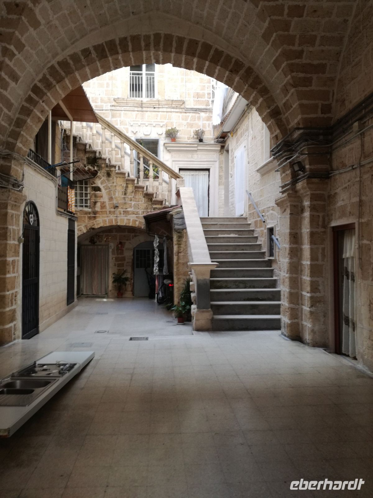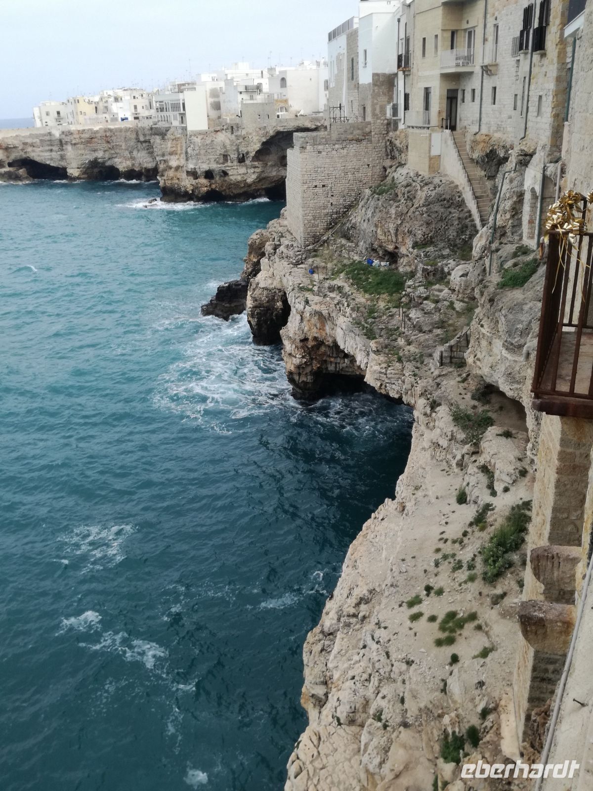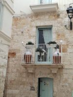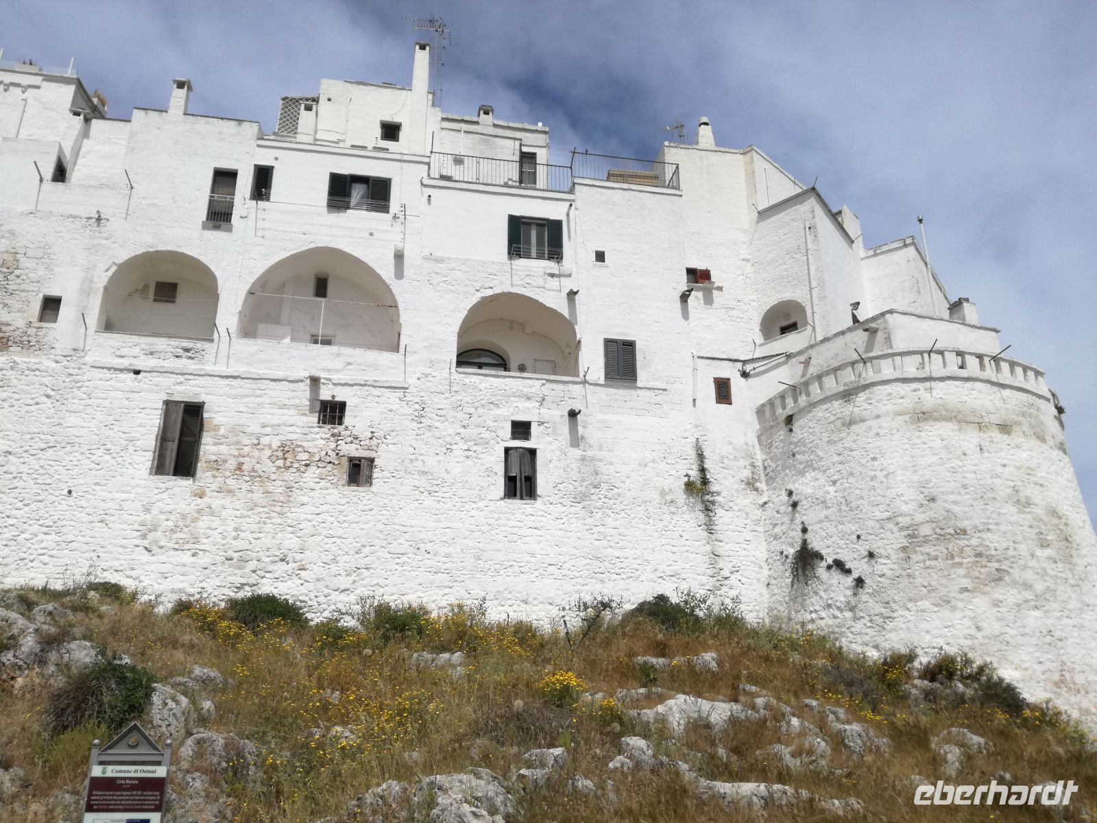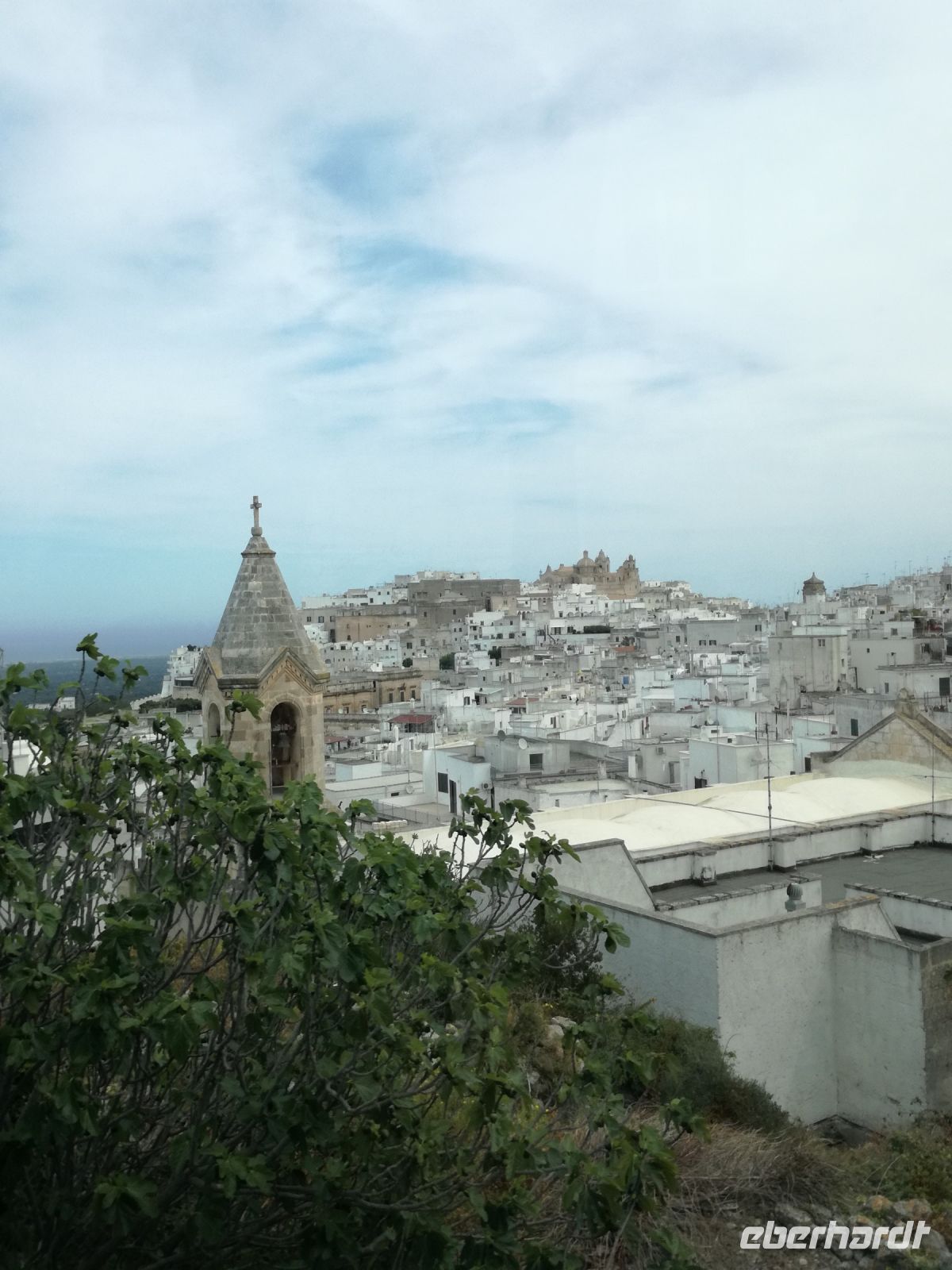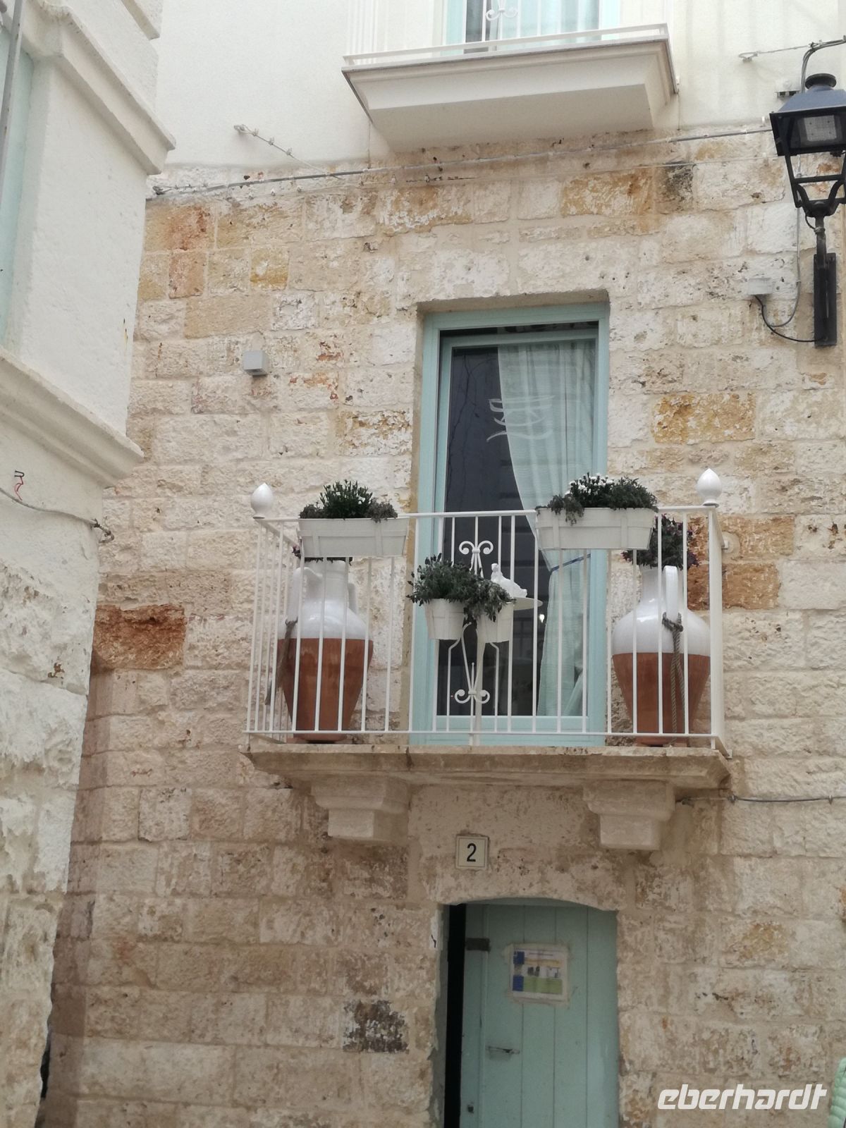 Am Nachmittag besuchen wir Ostuni, die weiße Stadt auf 3 Hügeln. Ostuni ist ein Ort für Verliebte, ganz in weiß gehalten mit wunderschönen Gassen und Piazzas. Wir lassen uns treiben und nehmen in den Gassen endlose Fotomotive mit. Weiß und sauber leuchten die Häuser im Kontrast zum blauen Himmel. Mirella erklärt uns, dass die Bögen zwischen den Häusern dazu dienten, bei Gefahr in ein anderes Haus zu klettern.