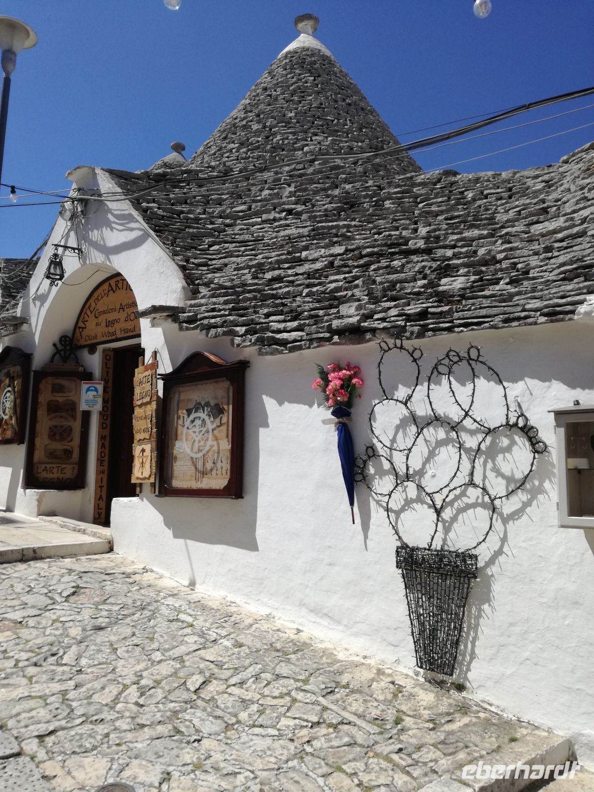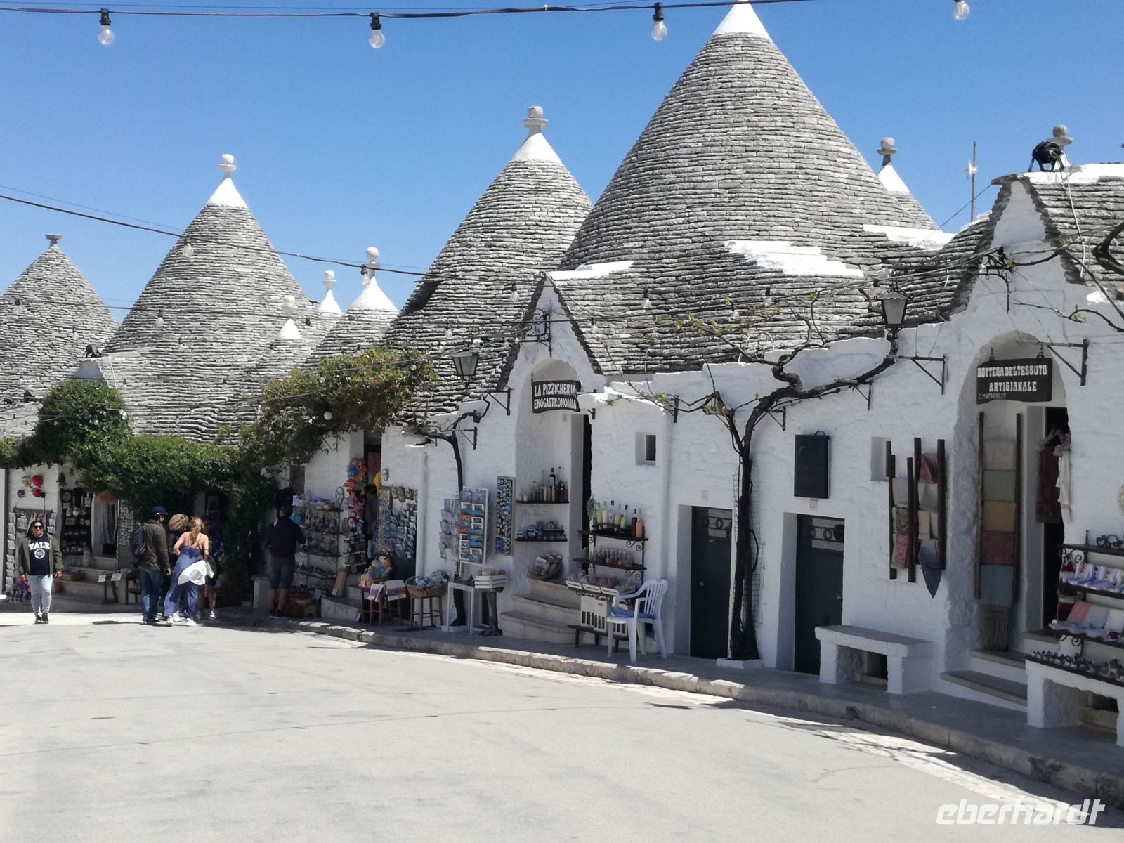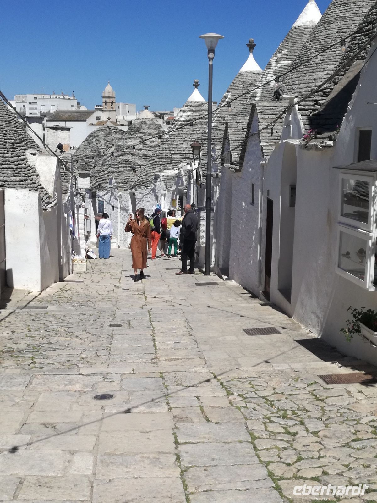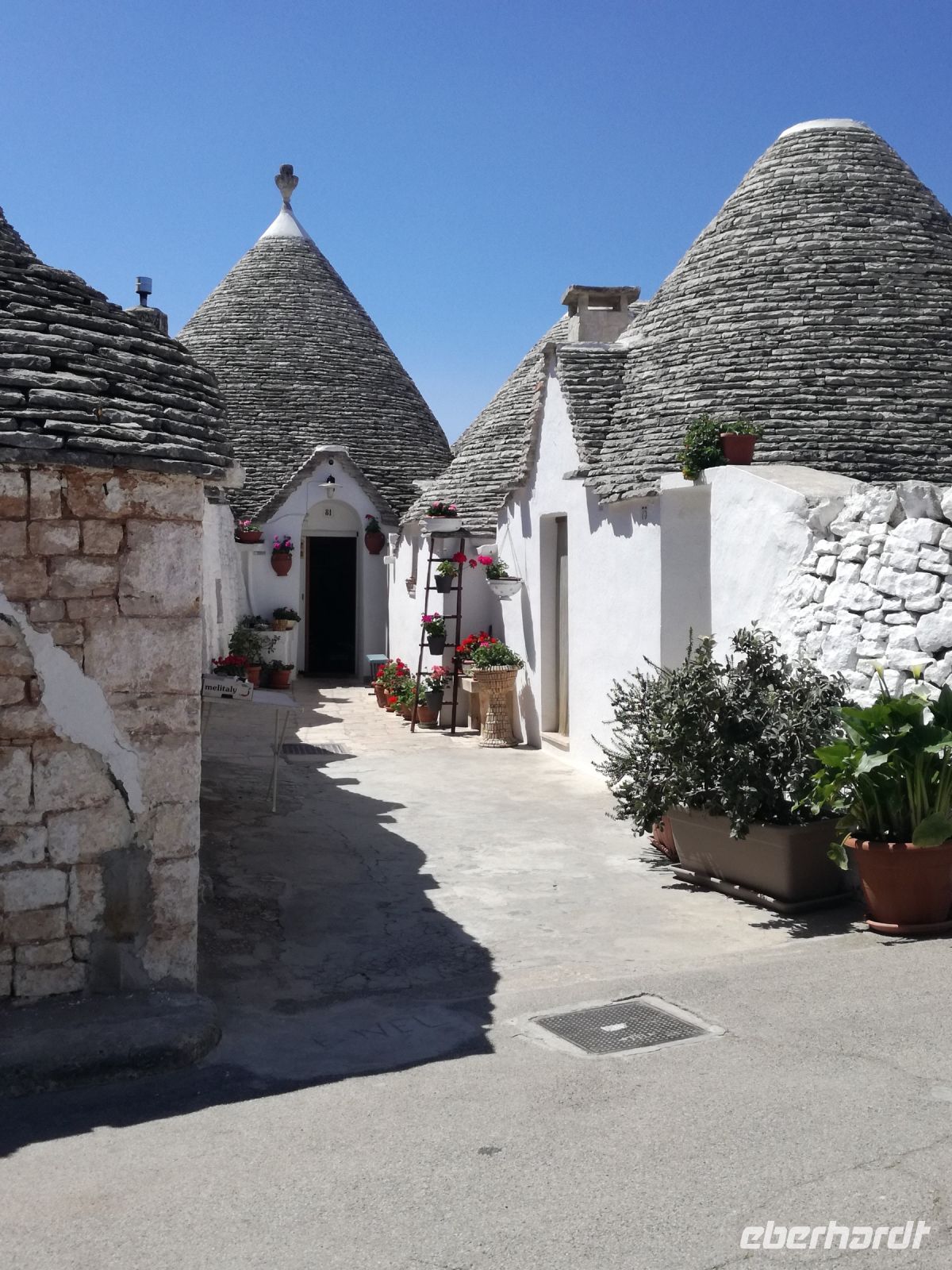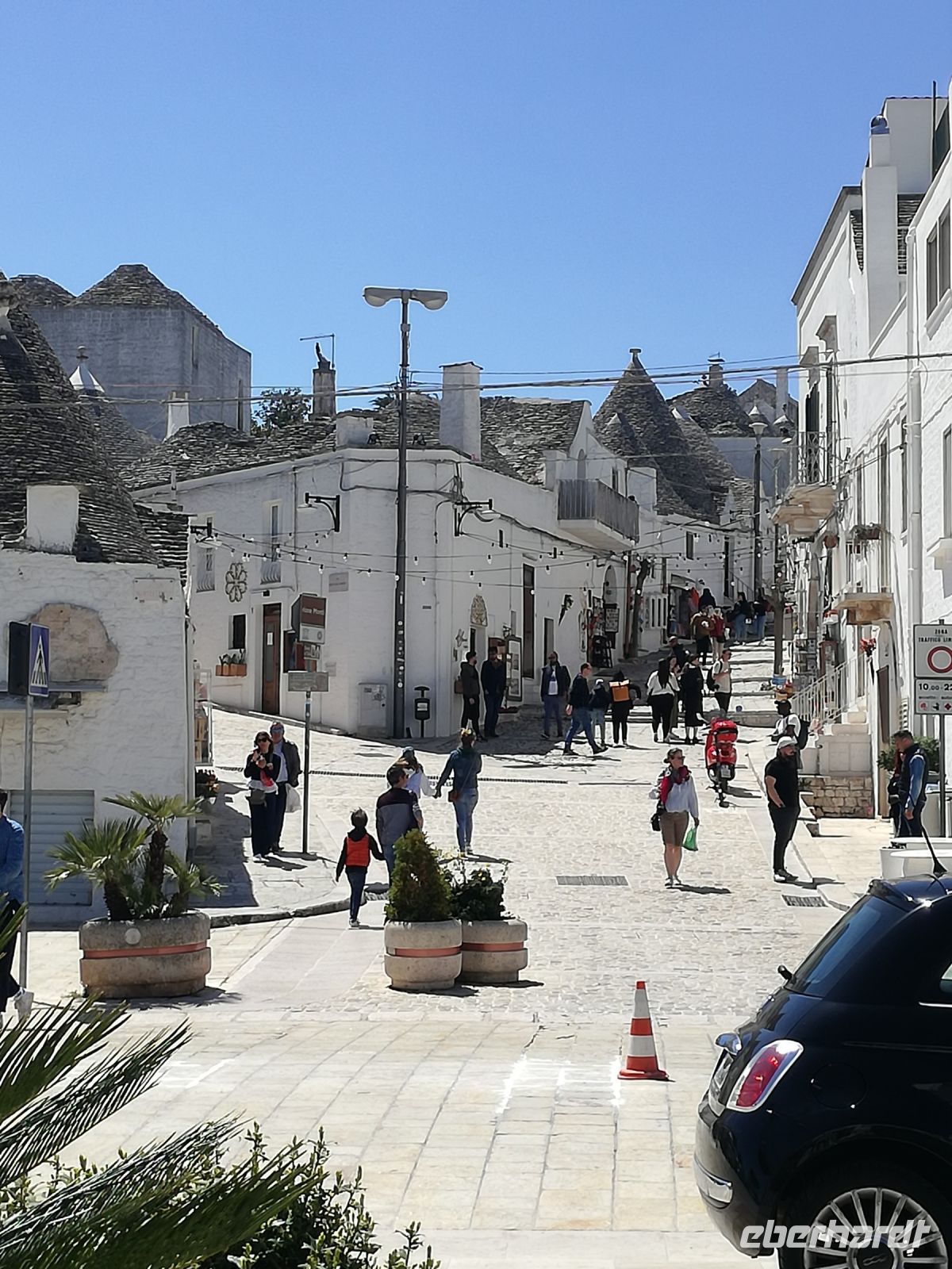 Schon die Altstadt, in der kaum noch Einwohner leben, ist eine Augenweide. Die weißen Trullis unter blauem Himmel, kaum biegt man um eine Ecke entdeckt man neue Formen, blumengeschmückte Häuser. Der Blick auf die vielen Dächer der Neustadt fasziniert derart, man könnte endlos verweilen. Auf den Steindächern befinden sich meist christliche Symbole und am Zipfel des Daches befindet sich oft ein symbolischer Schlussstein, der Zippus oder auch eine Kugel. Wir machen eine Mittagspause auf der Piazza del Popolo, die die Stadt in alte und neue Stadt teilt. Die neue Stadt ist alles Andere als schlicht. In vielen Trullihäusern sind kleine Läden, Restaurants, die Häuser sind geschmückt und laden die Touristen zum Bummel ein.