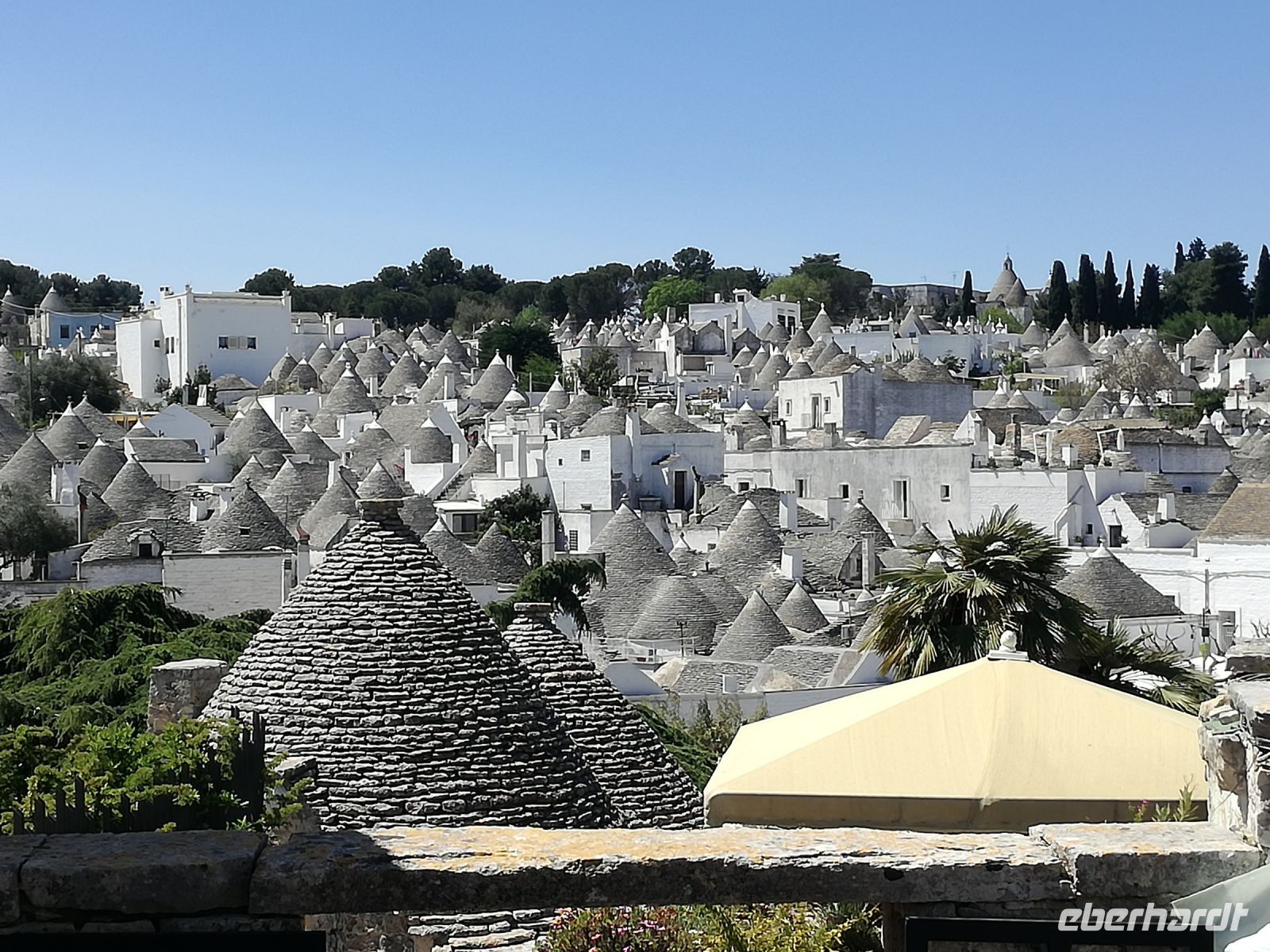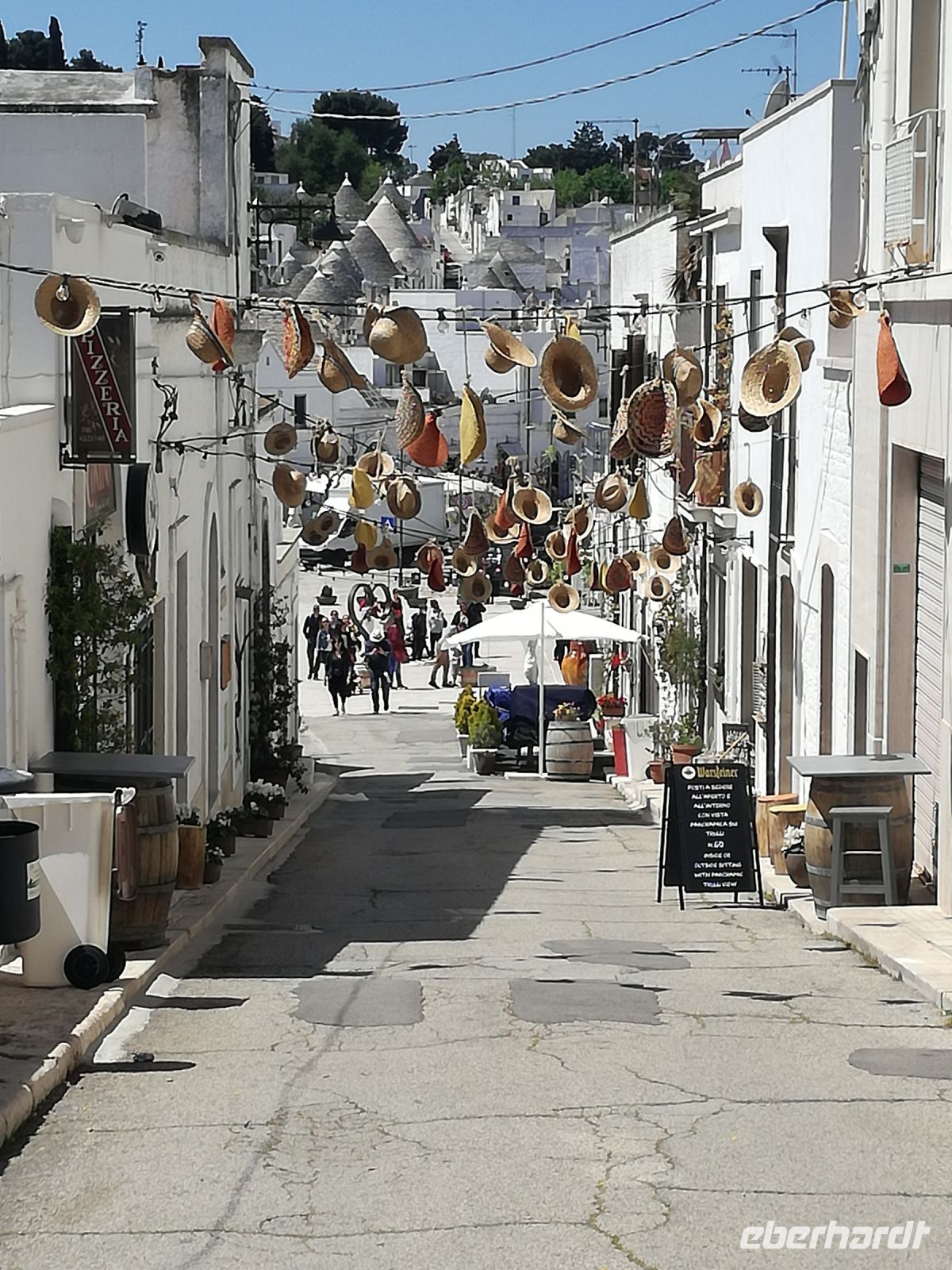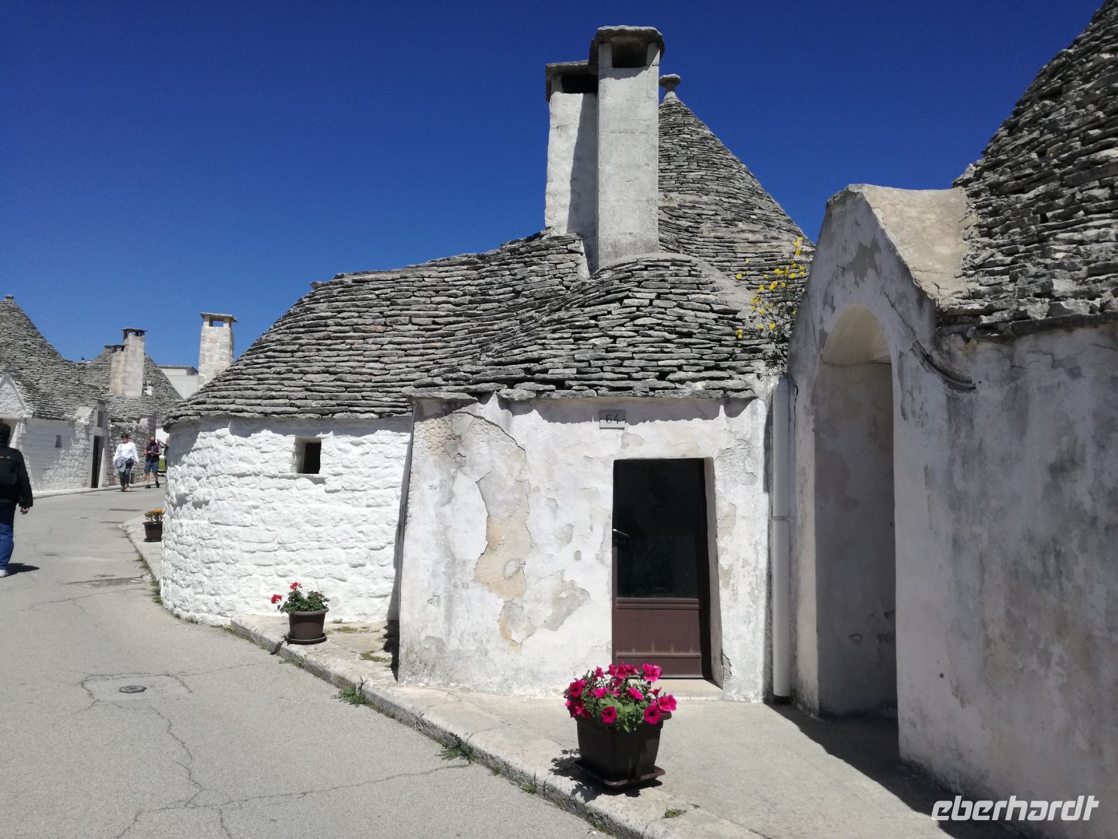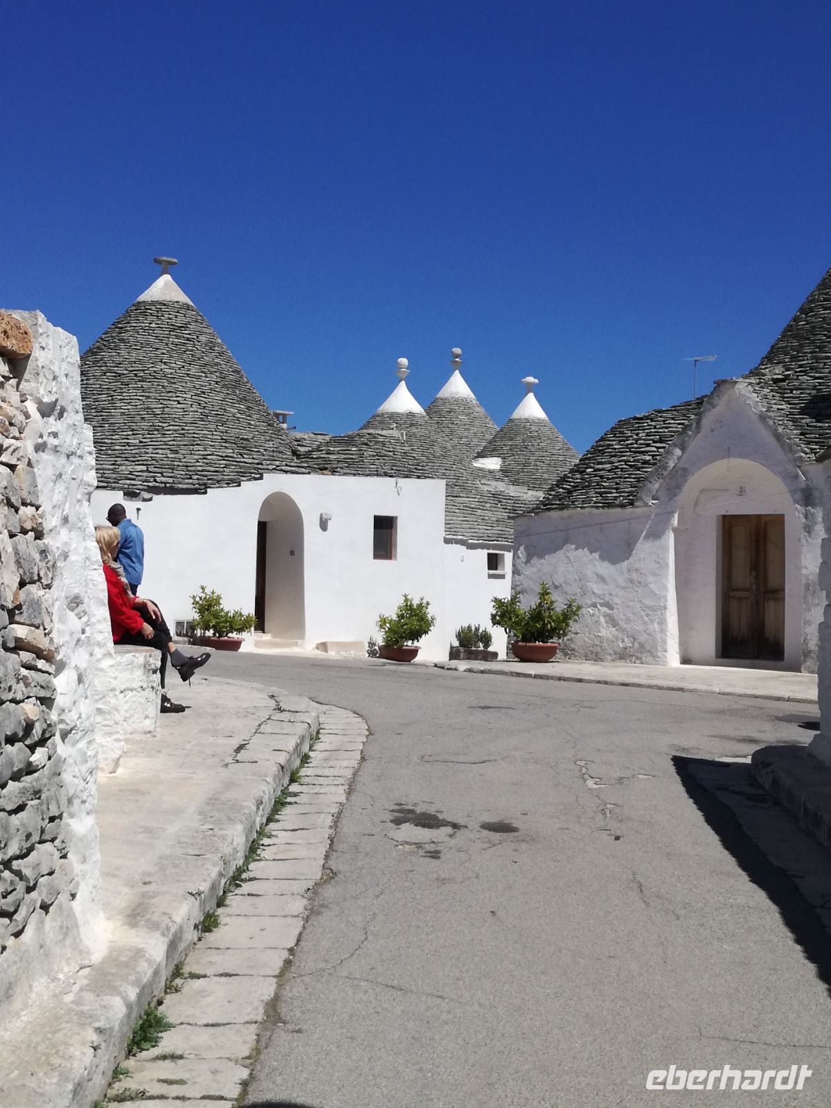 Schon die Altstadt, in der kaum noch Einwohner leben, ist eine Augenweide. Die weißen Trullis unter blauem Himmel, kaum biegt man um eine Ecke entdeckt man neue Formen, blumengeschmückte Häuser. Der Blick auf die vielen Dächer der Neustadt fasziniert derart, man könnte endlos verweilen. Auf den Steindächern befinden sich meist christliche Symbole und am Zipfel des Daches befindet sich oft ein symbolischer Schlussstein, der Zippus oder auch eine Kugel. Wir machen eine Mittagspause auf der Piazza del Popolo, die die Stadt in alte und neue Stadt teilt. Die neue Stadt ist alles Andere als schlicht. In vielen Trullihäusern sind kleine Läden, Restaurants, die Häuser sind geschmückt und laden die Touristen zum Bummel ein.