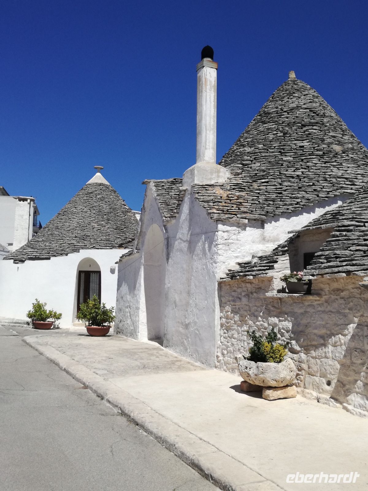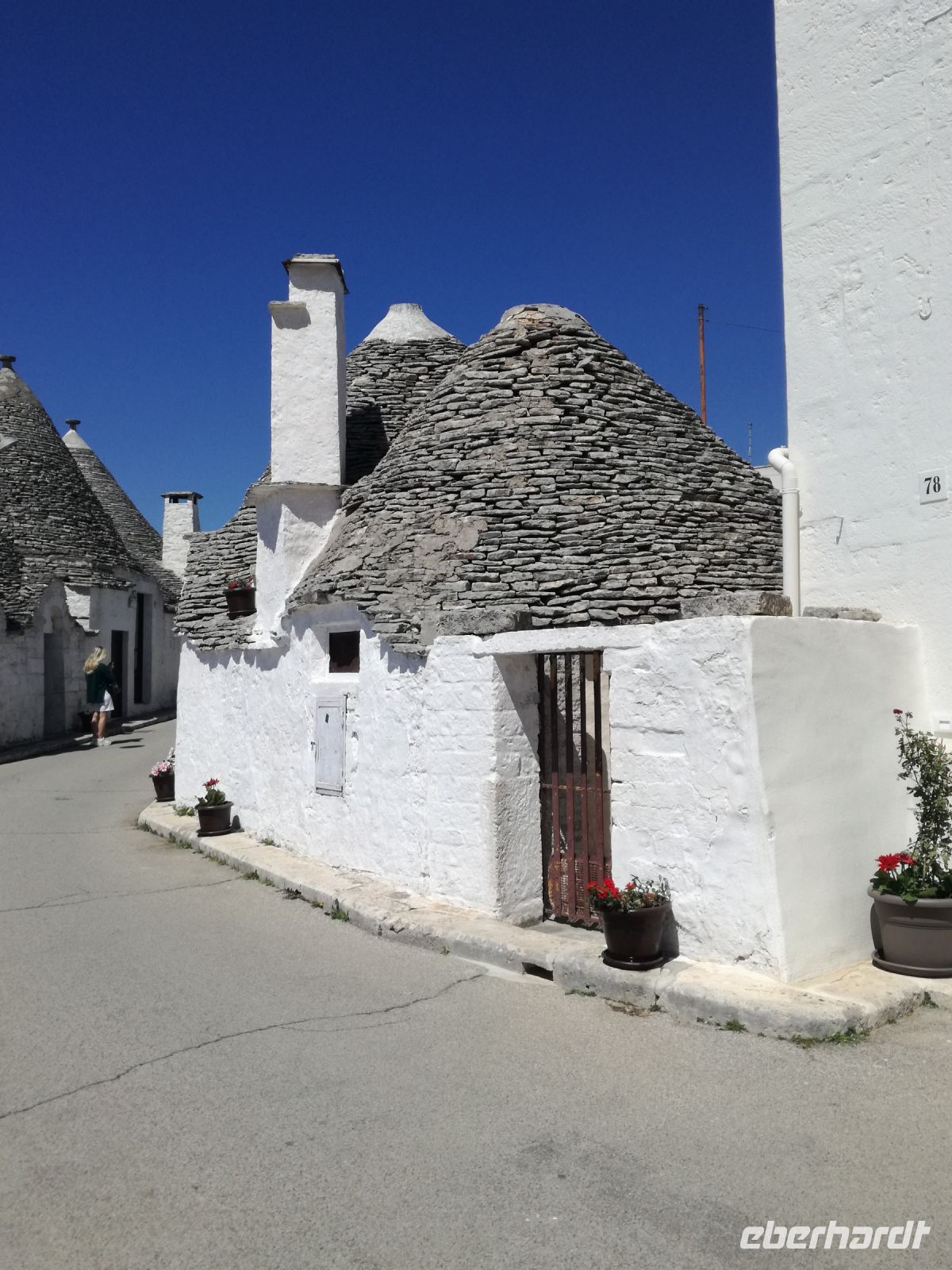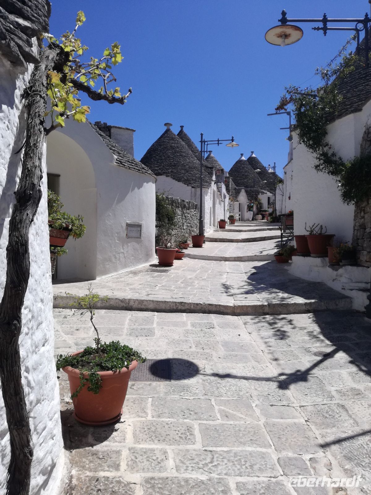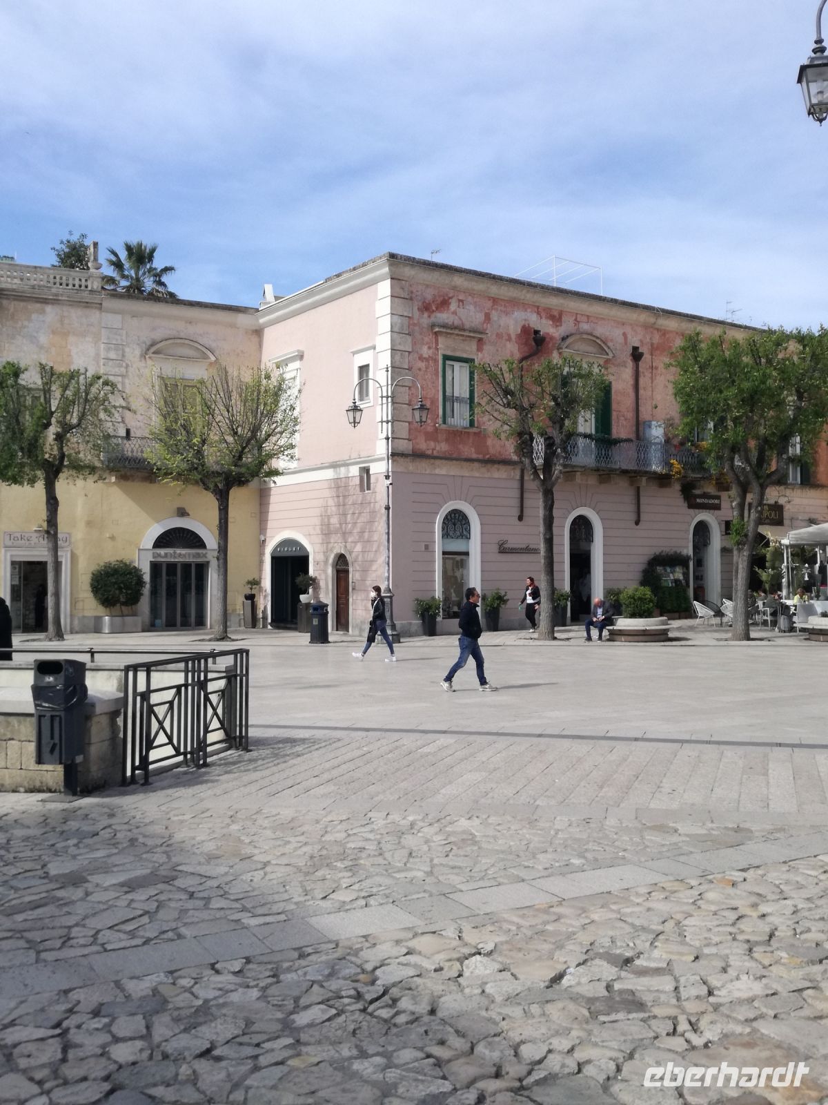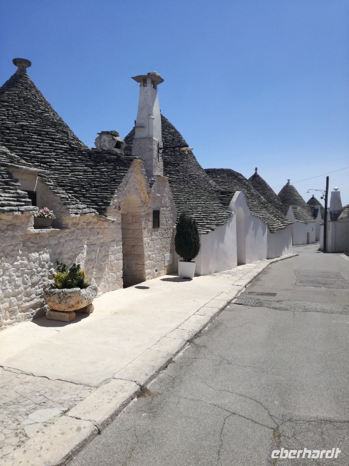 Schon die Altstadt, in der kaum noch Einwohner leben, ist eine Augenweide. Die weißen Trullis unter blauem Himmel, kaum biegt man um eine Ecke entdeckt man neue Formen, blumengeschmückte Häuser. Der Blick auf die vielen Dächer der Neustadt fasziniert derart, man könnte endlos verweilen. Auf den Steindächern befinden sich meist christliche Symbole und am Zipfel des Daches befindet sich oft ein symbolischer Schlussstein, der Zippus oder auch eine Kugel. Wir machen eine Mittagspause auf der Piazza del Popolo, die die Stadt in alte und neue Stadt teilt. Die neue Stadt ist alles Andere als schlicht. In vielen Trullihäusern sind kleine Läden, Restaurants, die Häuser sind geschmückt und laden die Touristen zum Bummel ein.