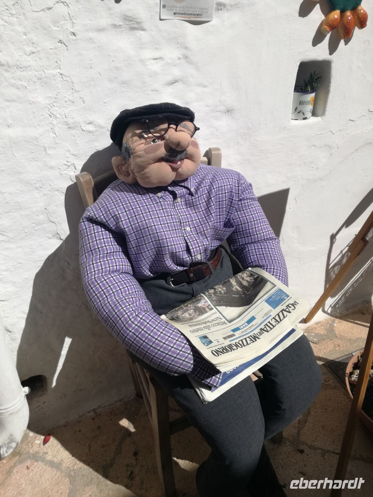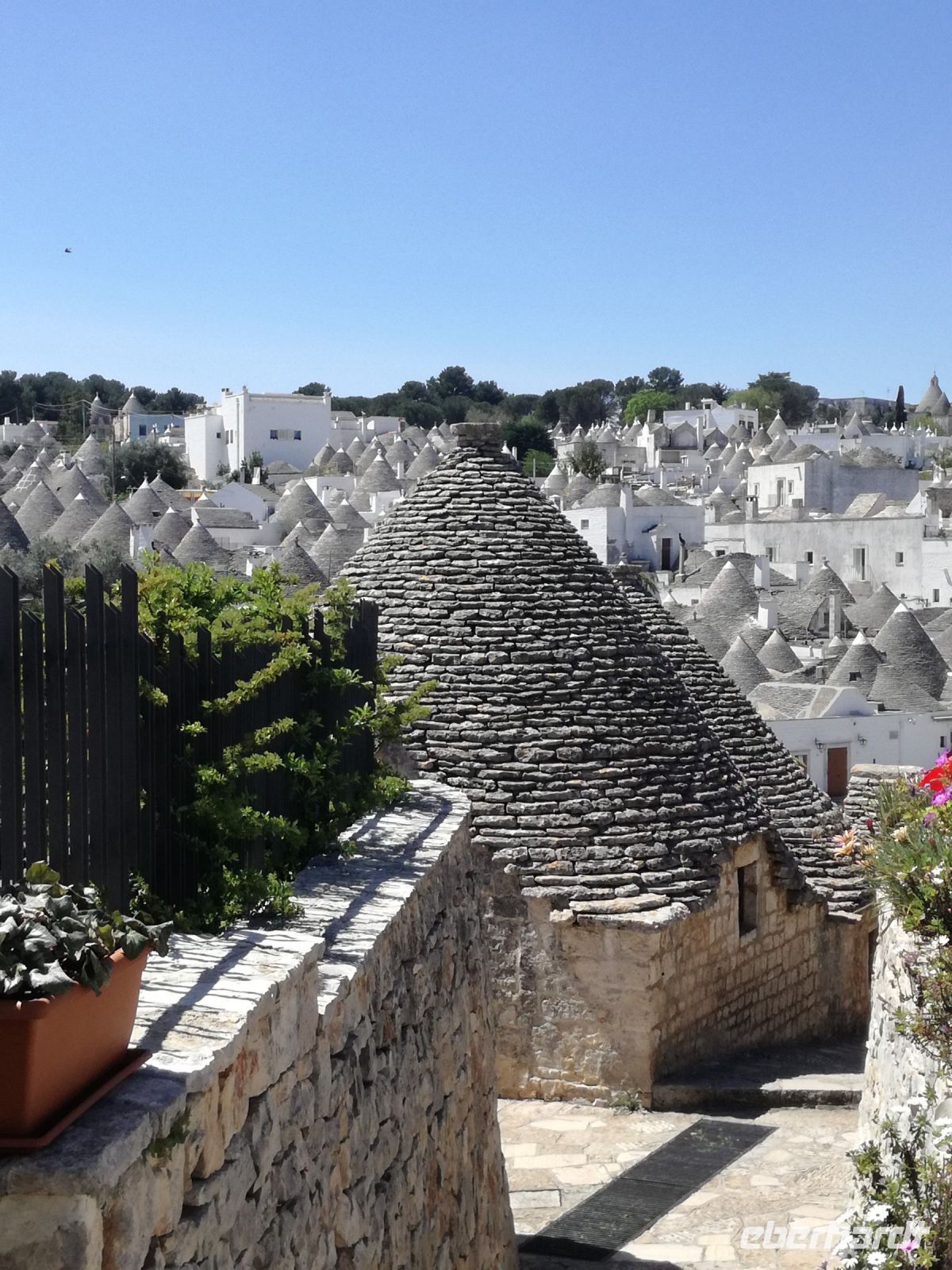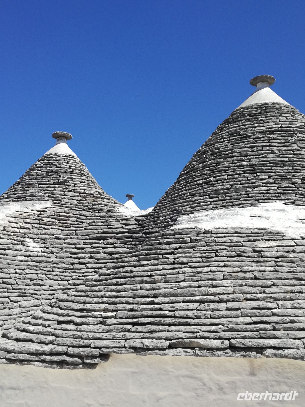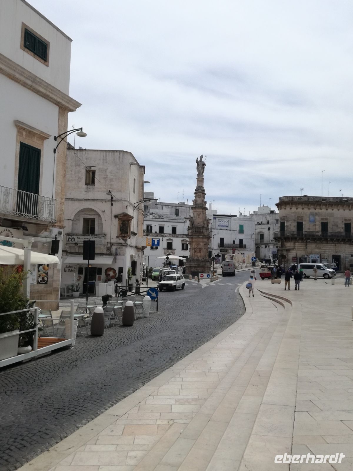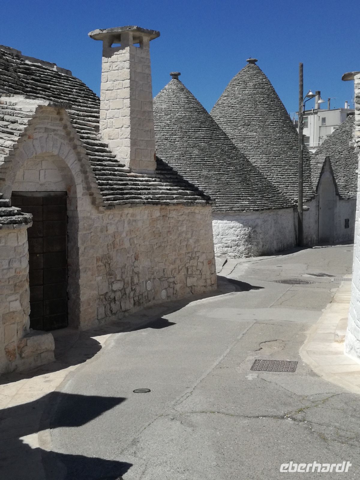Schon die Altstadt, in der kaum noch Einwohner leben, ist eine Augenweide. Die weißen Trullis unter blauem Himmel, kaum biegt man um eine Ecke entdeckt man neue Formen, blumengeschmückte Häuser. Der Blick auf die vielen Dächer der Neustadt fasziniert derart, man könnte endlos verweilen. Auf den Steindächern befinden sich meist christliche Symbole und am Zipfel des Daches befindet sich oft ein symbolischer Schlussstein, der Zippus oder auch eine Kugel. Wir machen eine Mittagspause auf der Piazza del Popolo, die die Stadt in alte und neue Stadt teilt. Die neue Stadt ist alles Andere als schlicht. In vielen Trullihäusern sind kleine Läden, Restaurants, die Häuser sind geschmückt und laden die Touristen zum Bummel ein.