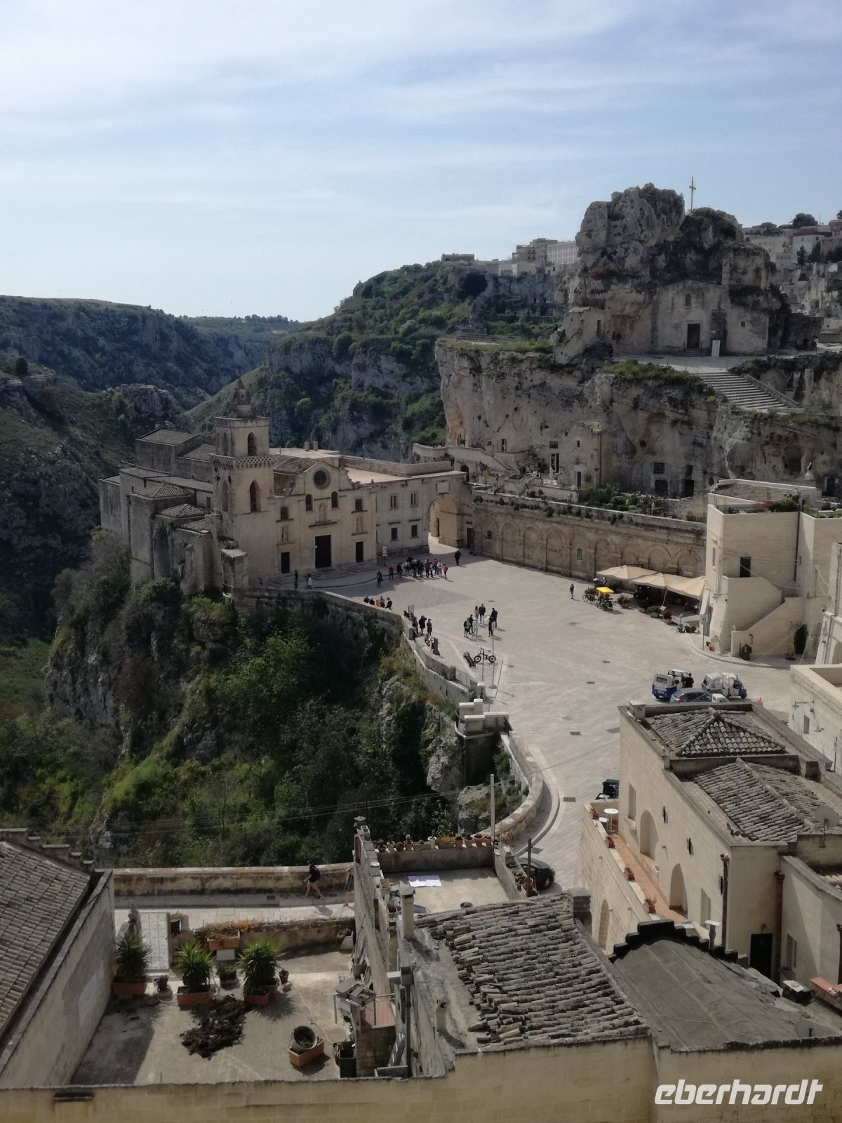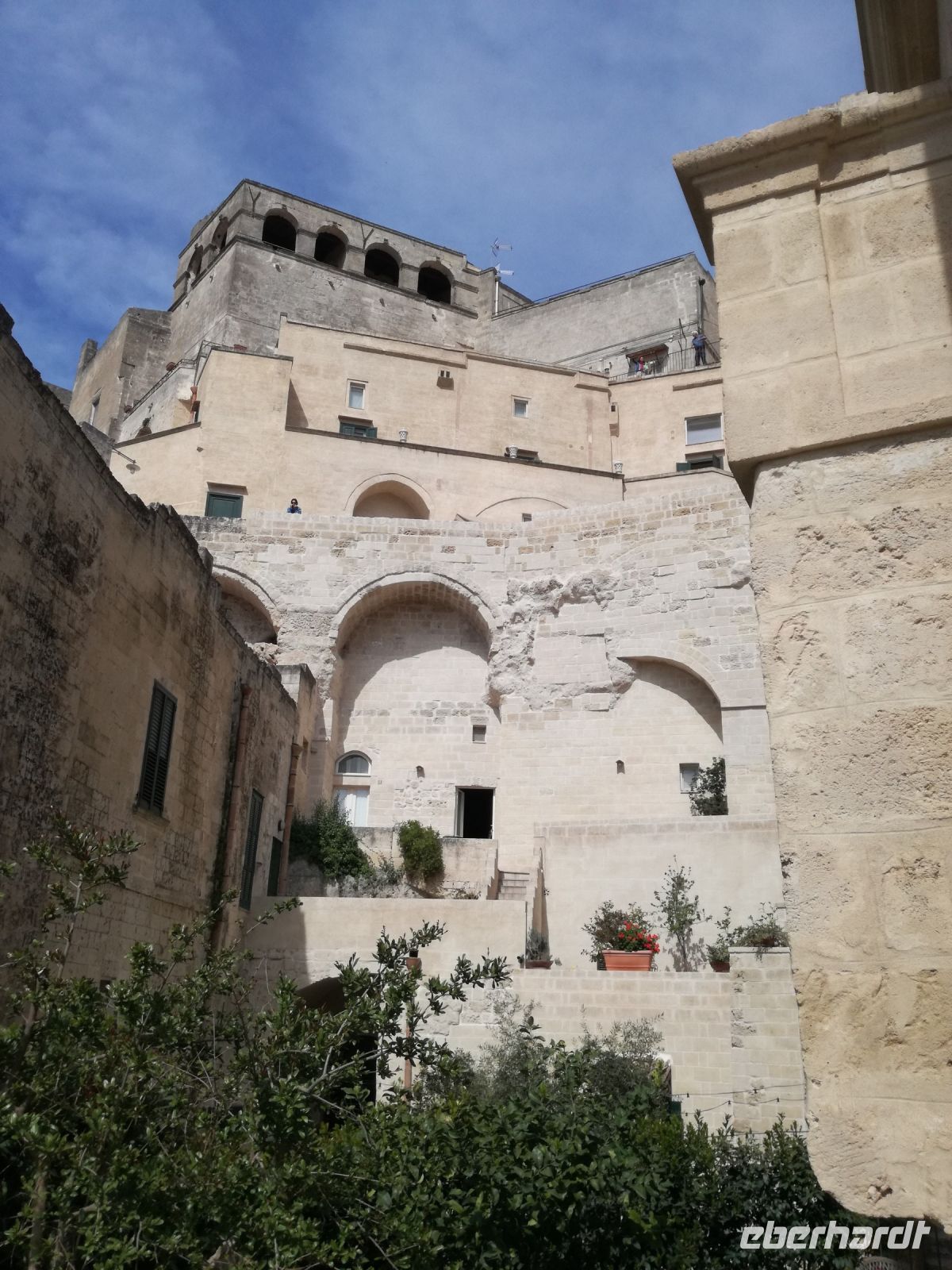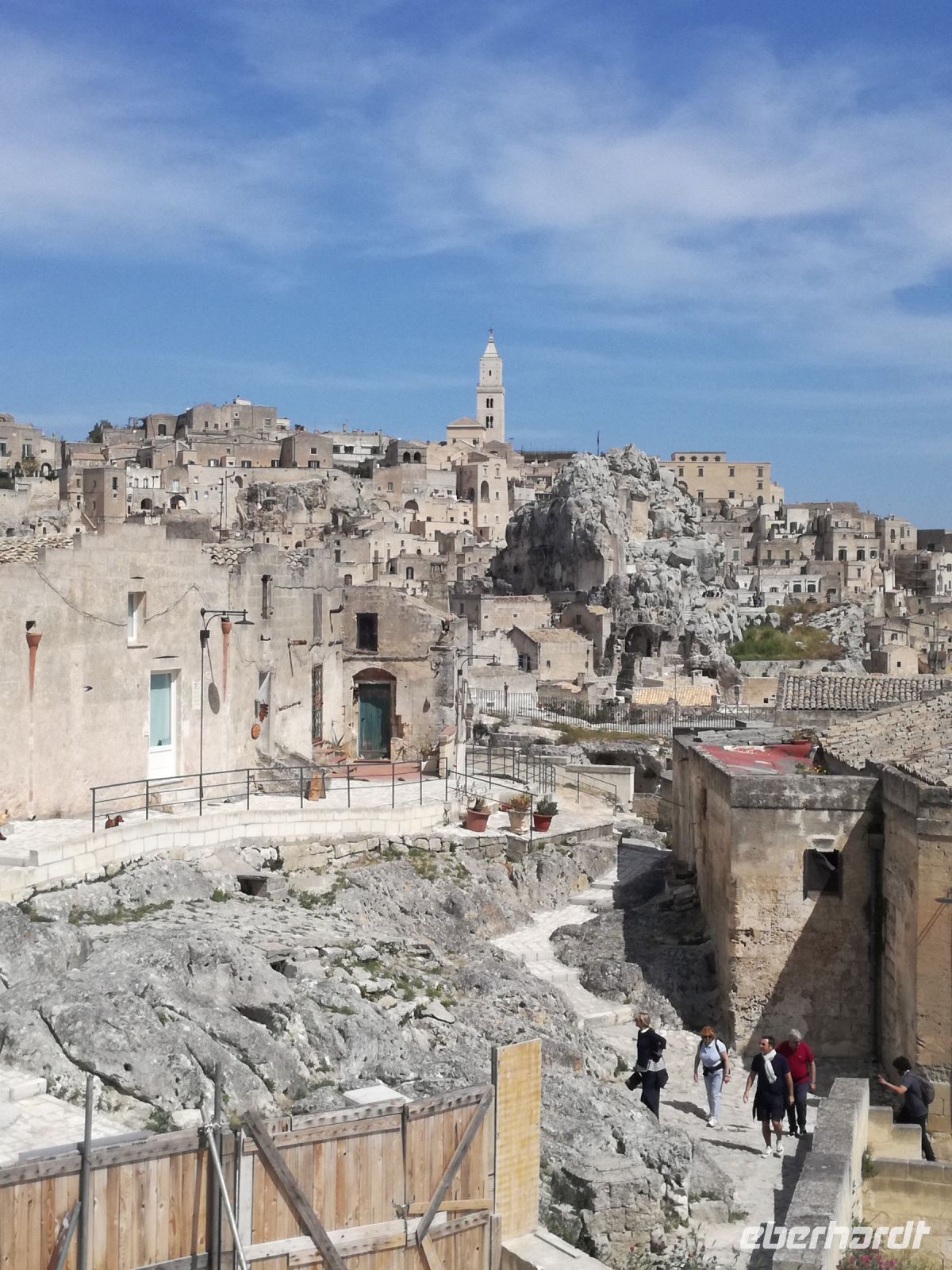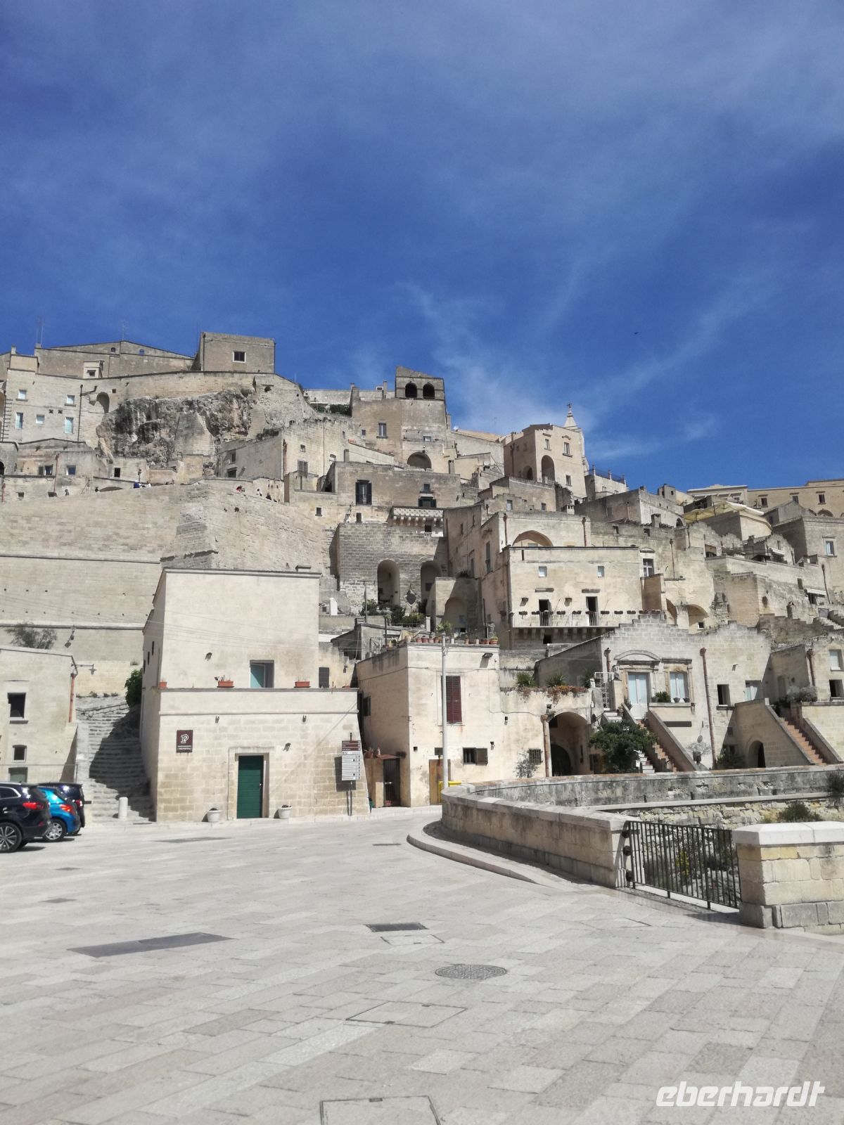 Schon die Anfahrt zu der auf Tuffstein gebauten Stadt bietet einen phantastischen Anblick. Matera ist die berühmteste Höhlenstadt der Welt und seit 1993 Weltkulturerbe. Im frühen Mittelalter wurden Höhlenbehausungen in die steilen Tuffsteinwände gehauen, in denen die Menschen seit Jahrhunderten lebten. Erst um 1950 räumte man die Wohnungen auf Grund unerträglicher hygienischer Zustände, denn sogar das Vieh lebte mit in den feuchten Wohnungen. Die Bewohner wurden in Sozialwohnungen umgesiedelt und die "Sassi" (Höhlenwohnungen) mehr oder weniger beschlagnahmt.