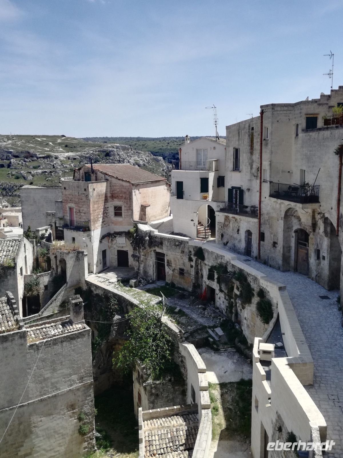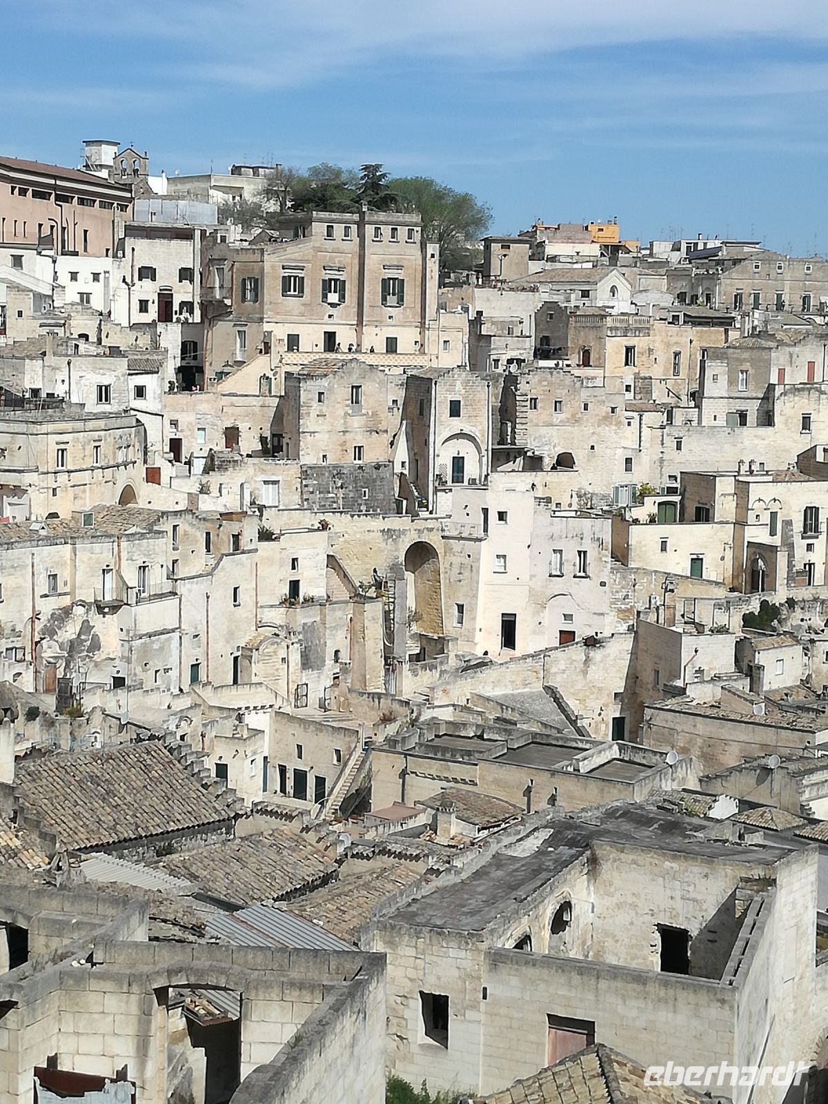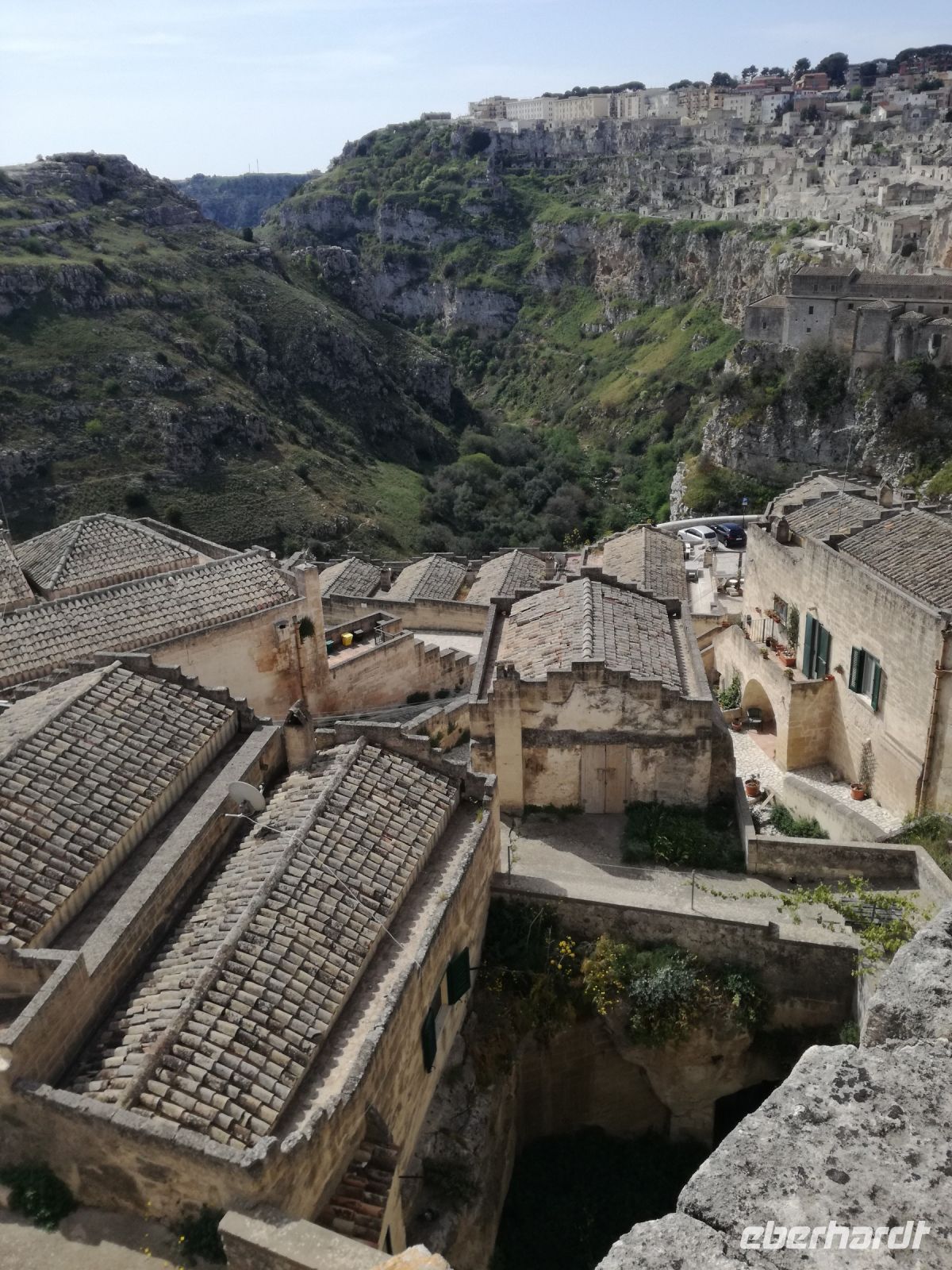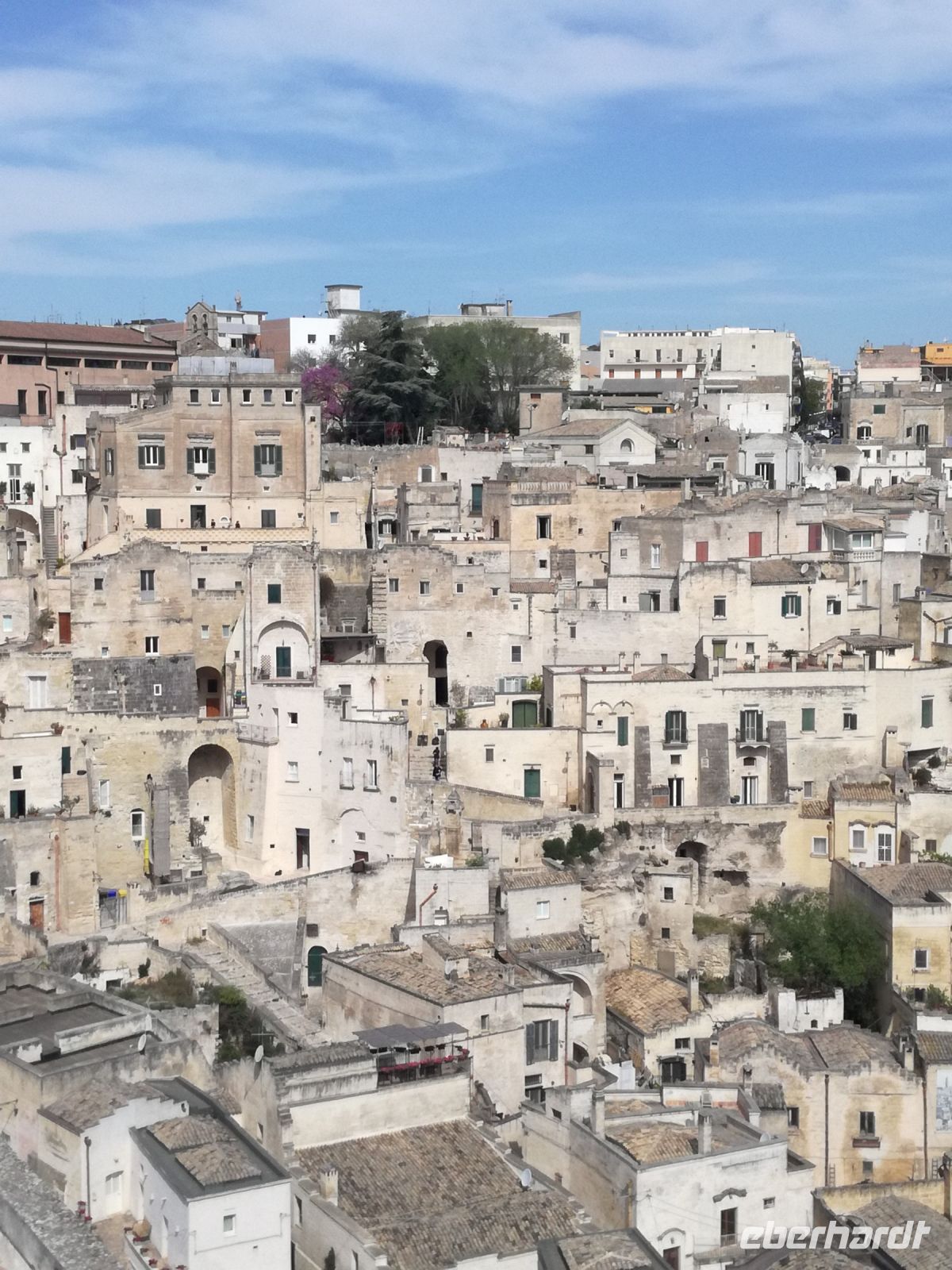 Schon die Anfahrt zu der auf Tuffstein gebauten Stadt bietet einen phantastischen Anblick. Matera ist die berühmteste Höhlenstadt der Welt und seit 1993 Weltkulturerbe. Im frühen Mittelalter wurden Höhlenbehausungen in die steilen Tuffsteinwände gehauen, in denen die Menschen seit Jahrhunderten lebten. Erst um 1950 räumte man die Wohnungen auf Grund unerträglicher hygienischer Zustände, denn sogar das Vieh lebte mit in den feuchten Wohnungen. Die Bewohner wurden in Sozialwohnungen umgesiedelt und die "Sassi" (Höhlenwohnungen) mehr oder weniger beschlagnahmt.