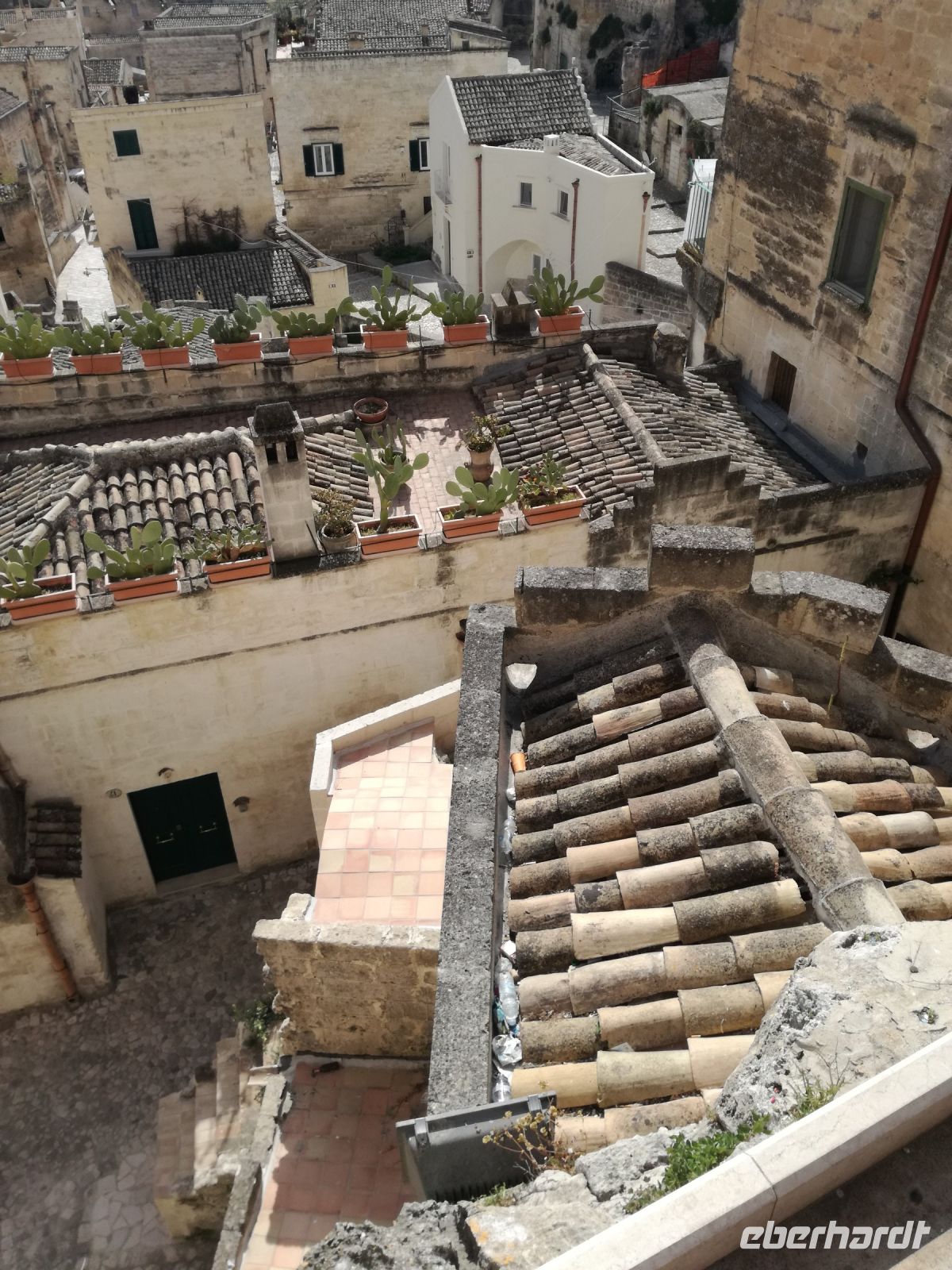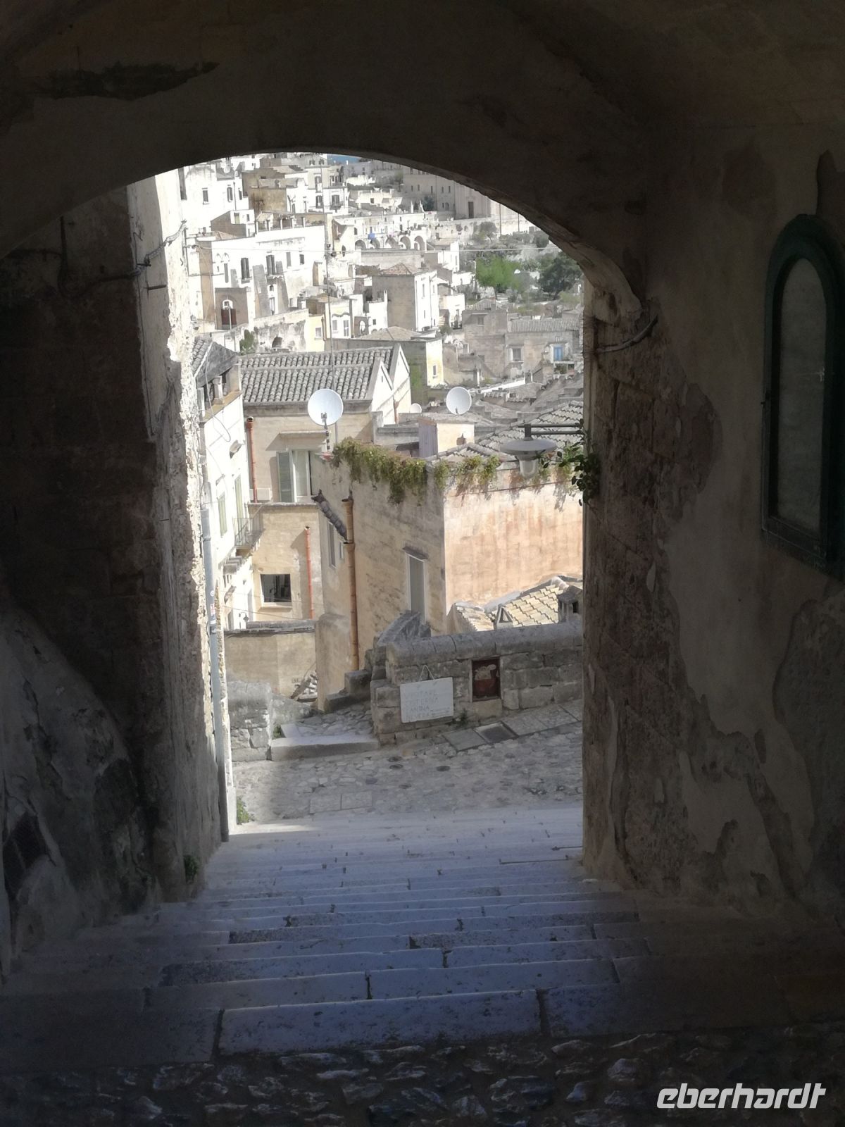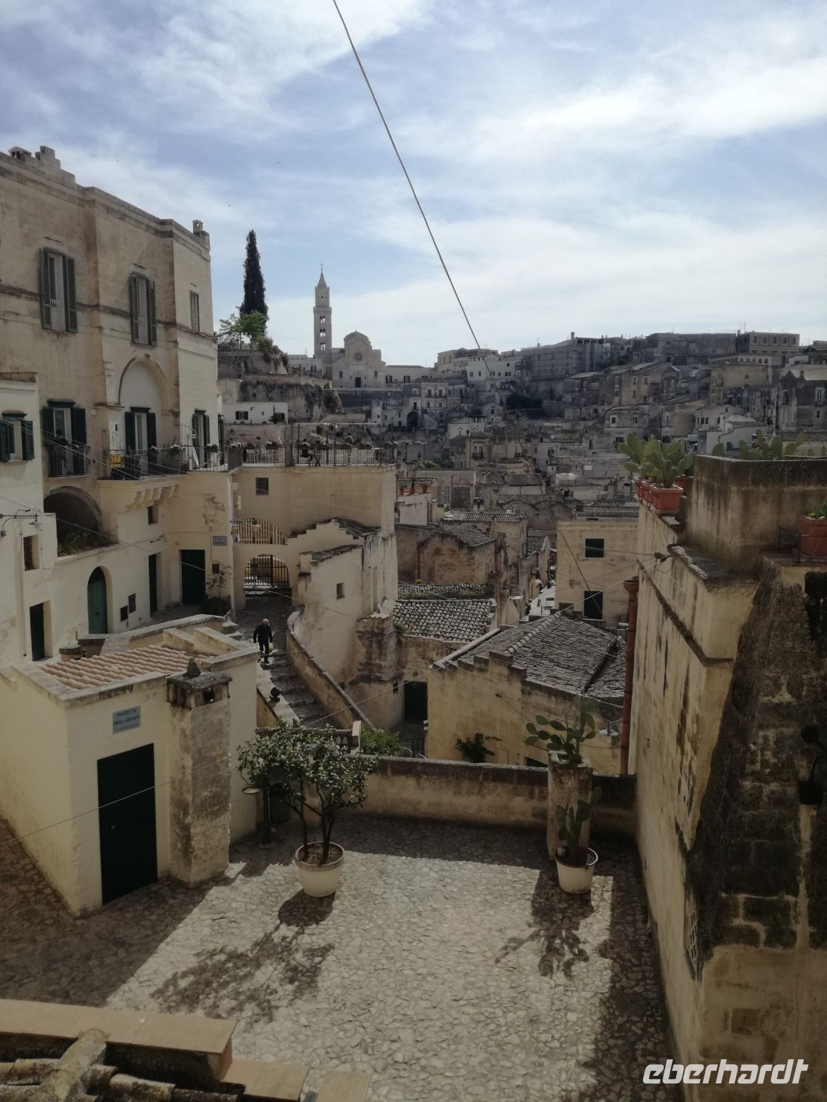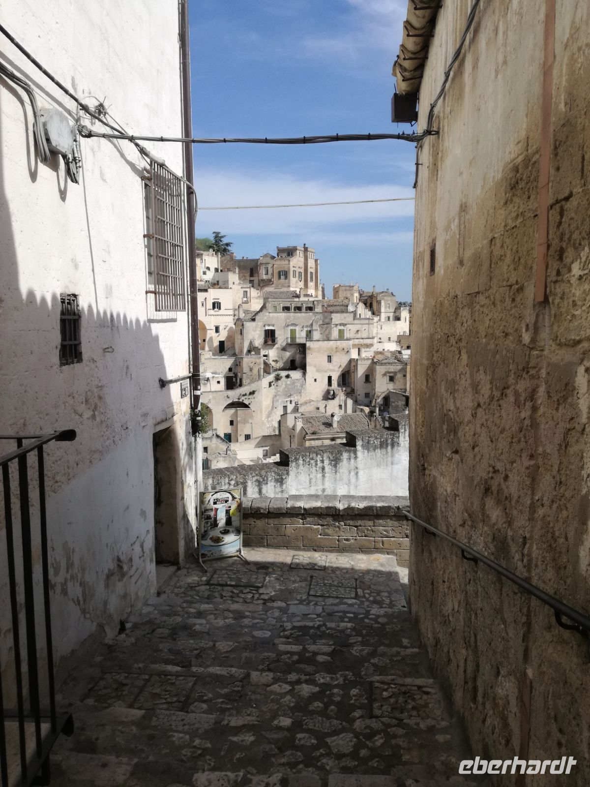 Schon die Anfahrt zu der auf Tuffstein gebauten Stadt bietet einen phantastischen Anblick. Matera ist die berühmteste Höhlenstadt der Welt und seit 1993 Weltkulturerbe. Im frühen Mittelalter wurden Höhlenbehausungen in die steilen Tuffsteinwände gehauen, in denen die Menschen seit Jahrhunderten lebten. Erst um 1950 räumte man die Wohnungen auf Grund unerträglicher hygienischer Zustände, denn sogar das Vieh lebte mit in den feuchten Wohnungen. Die Bewohner wurden in Sozialwohnungen umgesiedelt und die "Sassi" (Höhlenwohnungen) mehr oder weniger beschlagnahmt.