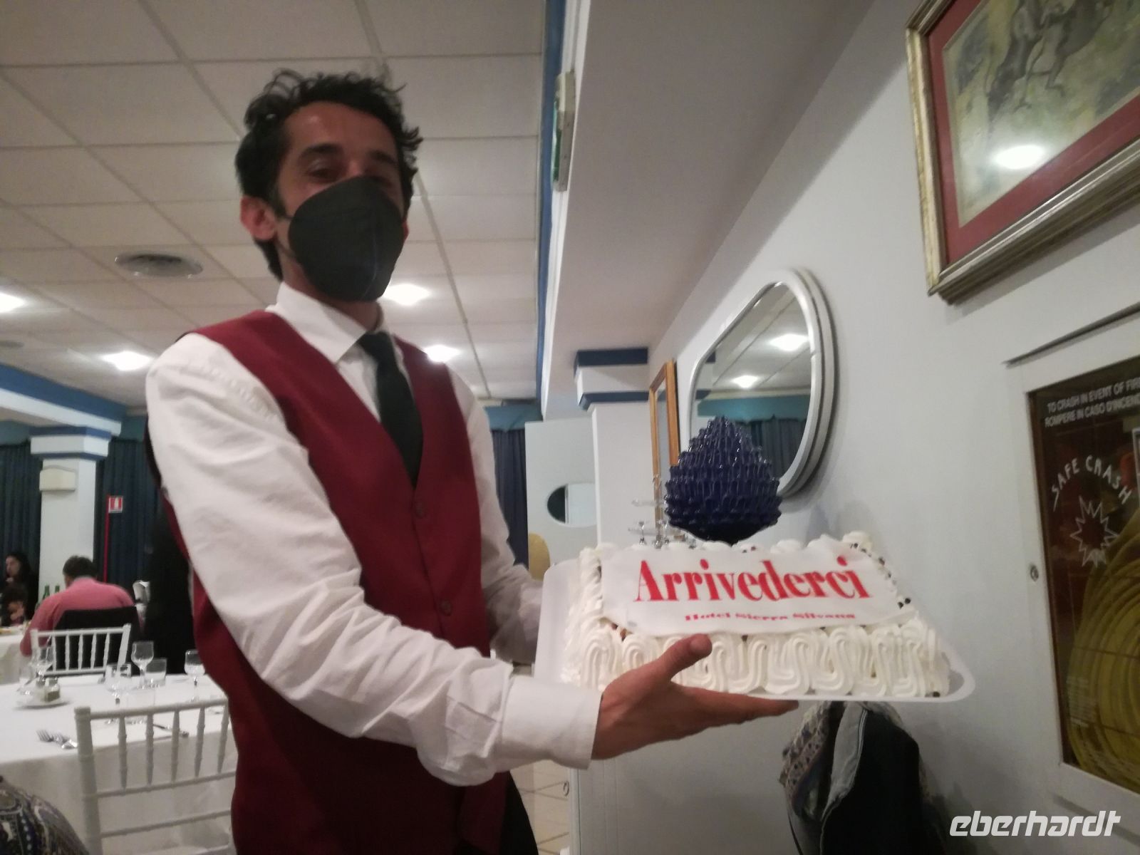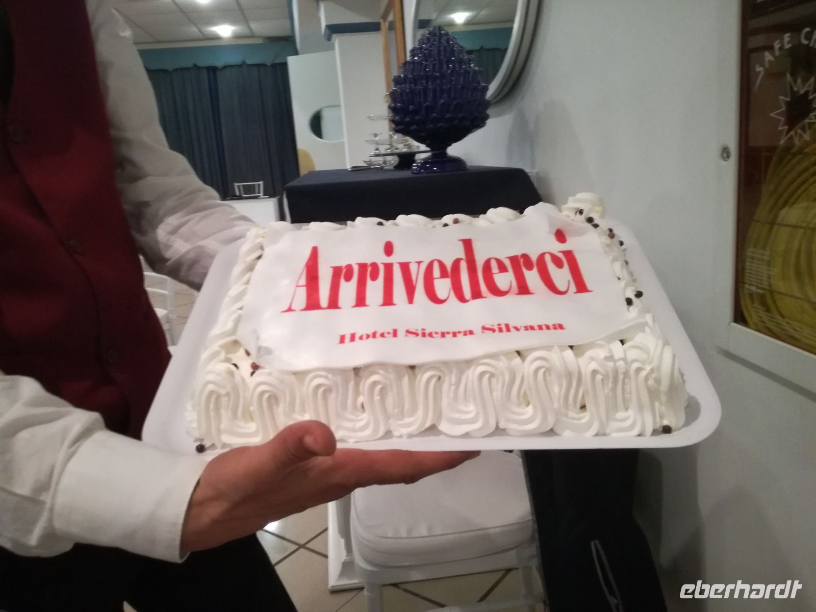 Auch das Hotel hat großes Lob verdient, hat man doch im Restaurant extra eine Torte liebevoll für uns kreiert. Arrividerci heißt es.