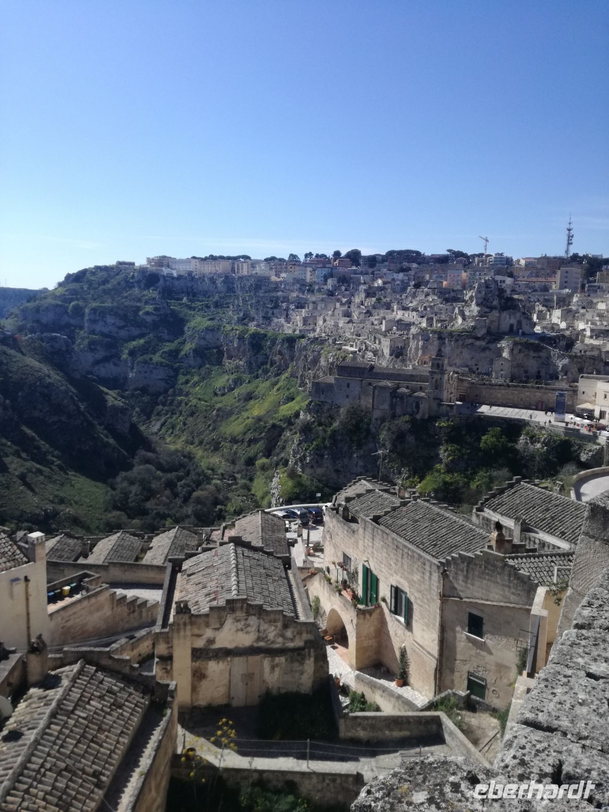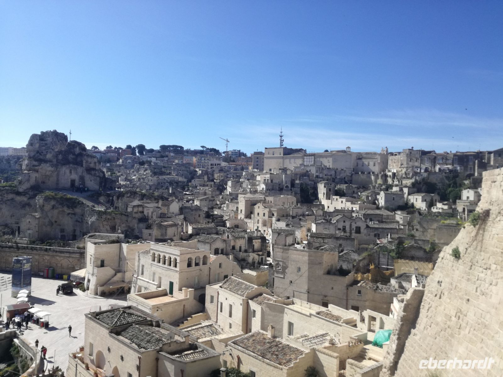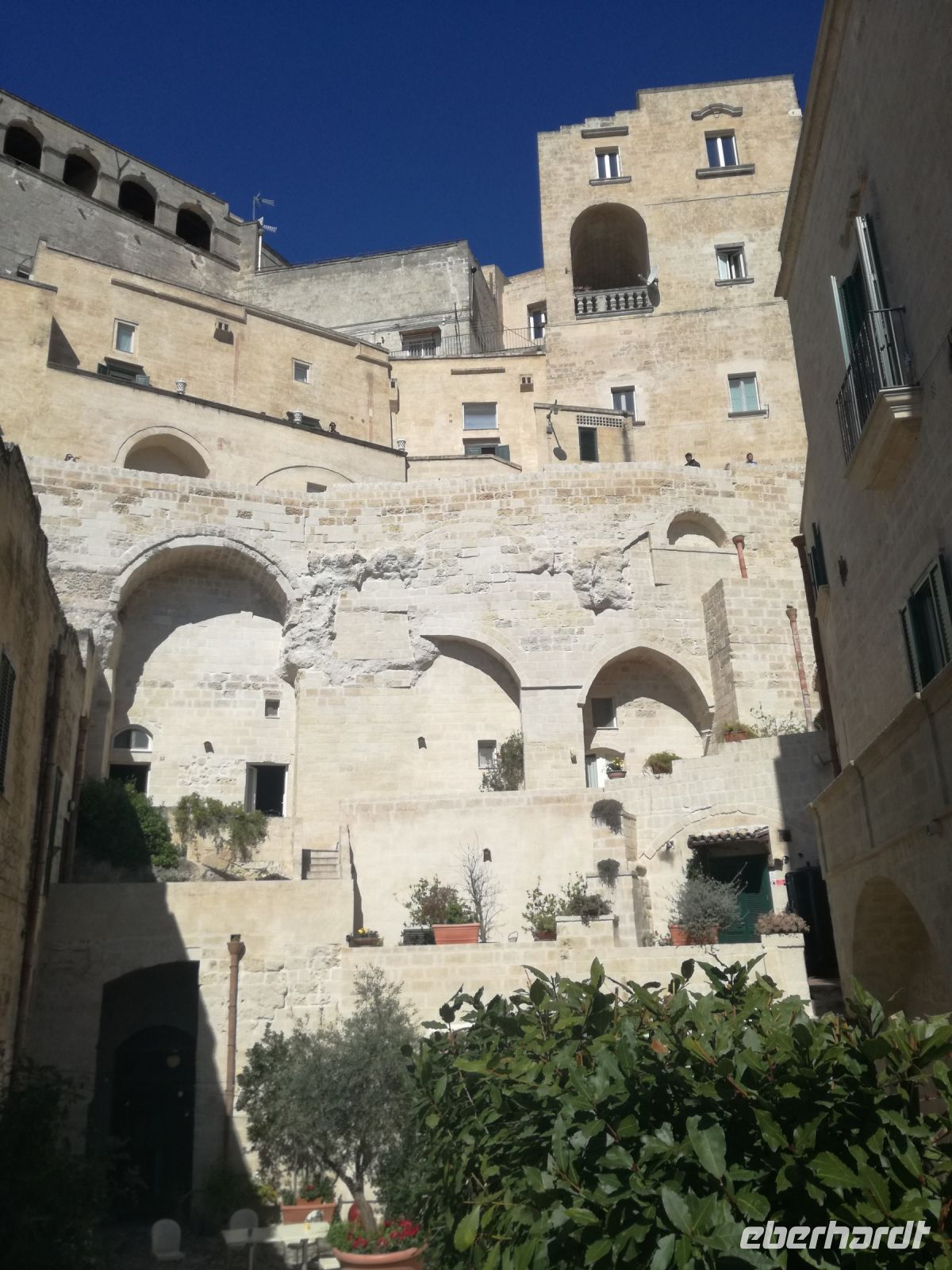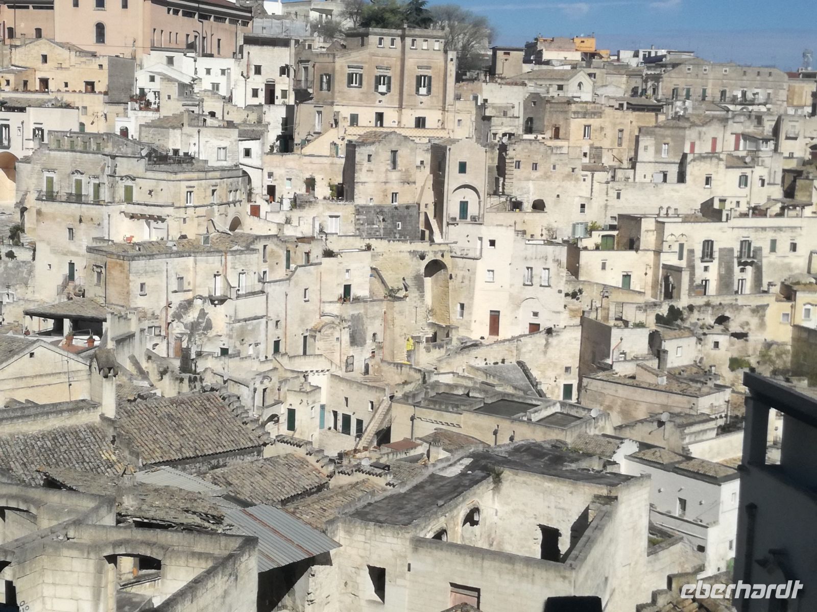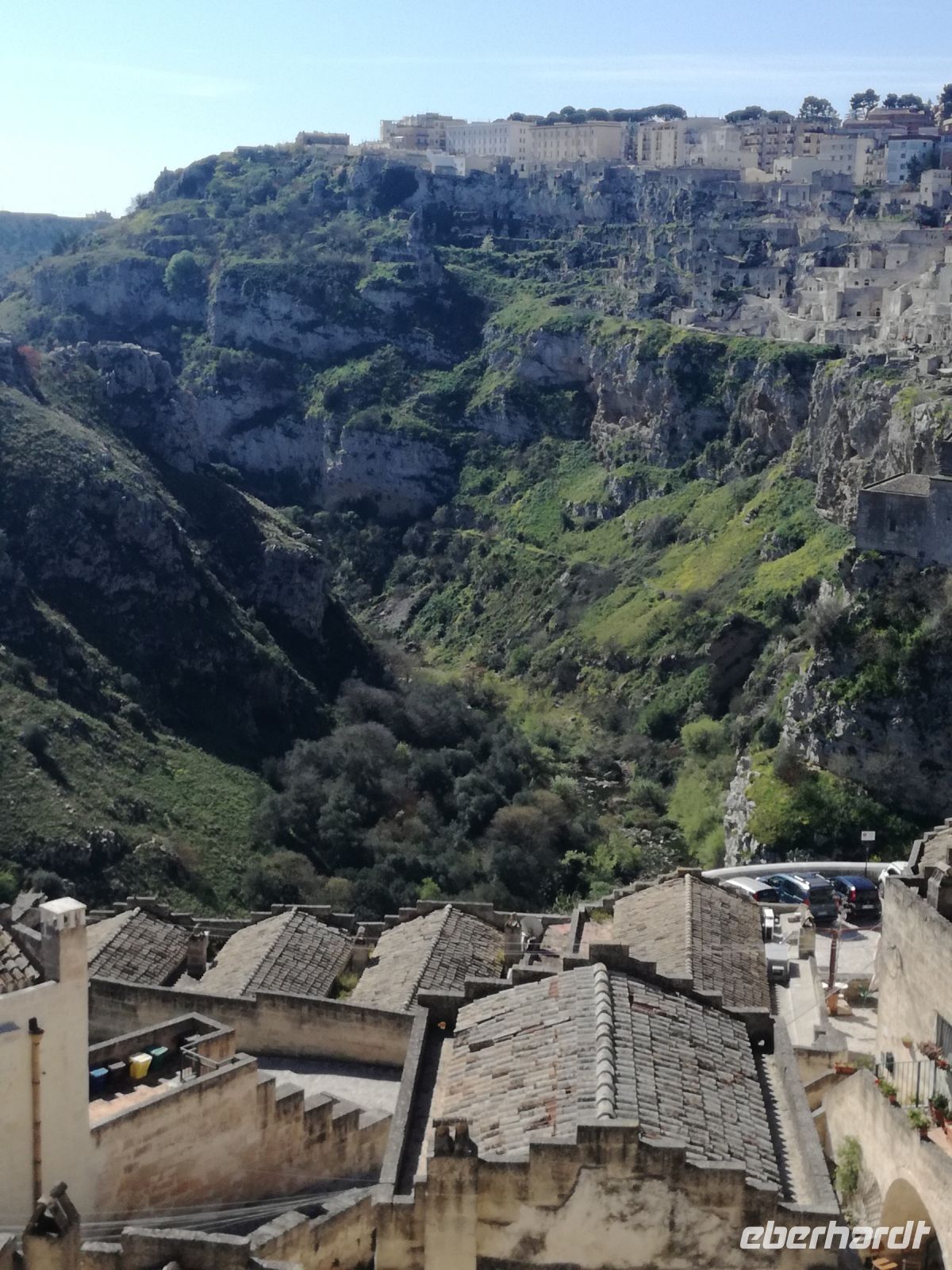 Vielleicht der Höhepunkt der Reise ? Für mich auf alle Fälle. Nach einer Stunde Fahrt und vielen Erklärungen von Mirella zu dieser geschichtsträchtigen Stadt erreichen wir Matera, 2019 zur Kulturhauptstadt ernannt. Überwältigend ist das Panorama dieser Stadt von verschiedenen Plattformen aus. Man muss sie in ihrer Größe und Schönheit erfassen, mit ihren verschachtelten Häusern mutet sie ein bißchen wie eine Spielzeugstadt an. Matera ist Kulisse zahlreicher Spielfilme, wie dem 2004 von Mel Gibson gedrehten Film „Die Passion Christi“. Entlang diesem Weg erreichen wir quer durch die Stadt die Sassi. So werden die Höhlenwohnungen der einst ansässigen Bevölkerung genannt. Anfang des 19. Jahrhunderts erlangte die Stadt noch einmal tragischen Ruhm, nachdem der italienische Arzt Carlo Levi die Zustände in den Sassi anprangerte. Diese hat er in seinem Buch "Christus kam nur bis Eboli" niedergeschrieben. Noch um 1950 lebten in den Sassi Menschen unter unwürdigen und vor allem unhygienischen Verhältnissen, was schließlich die Beschlagnahmung der Höhlenwohnungen 1952 zur Folge hatte. Matera war der Schandfleck Italiens und die unhaltbaren Zustände das Resultat der Vernachlässigung des Südens. Die Menschen wurden schließlich umgesiedelt.