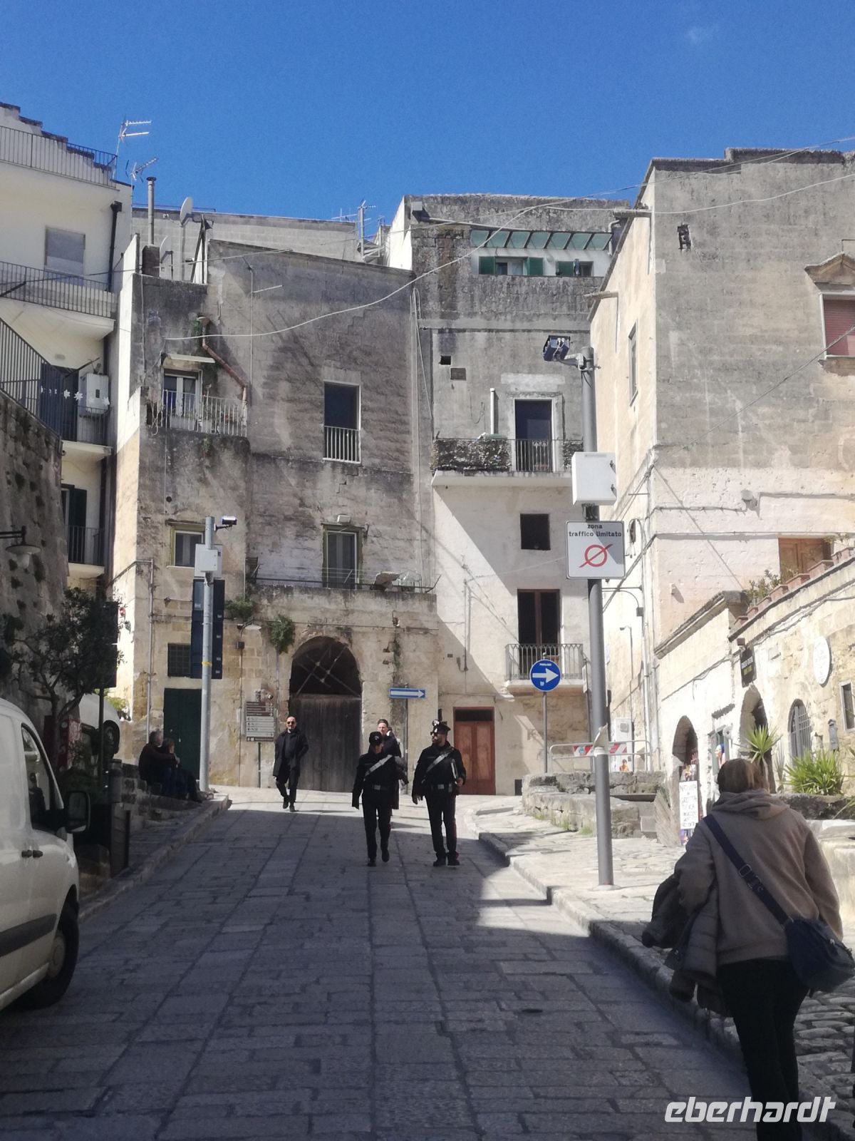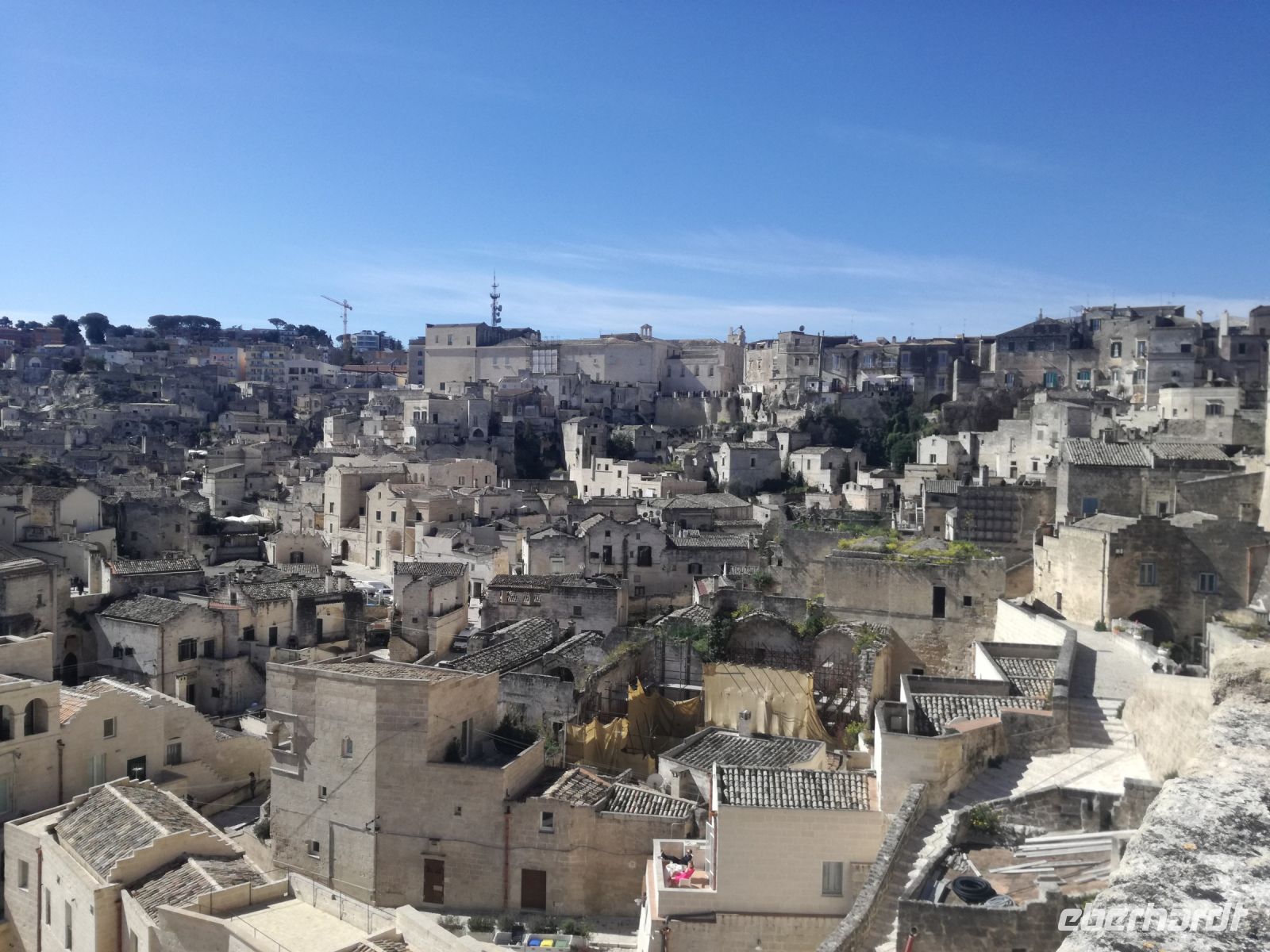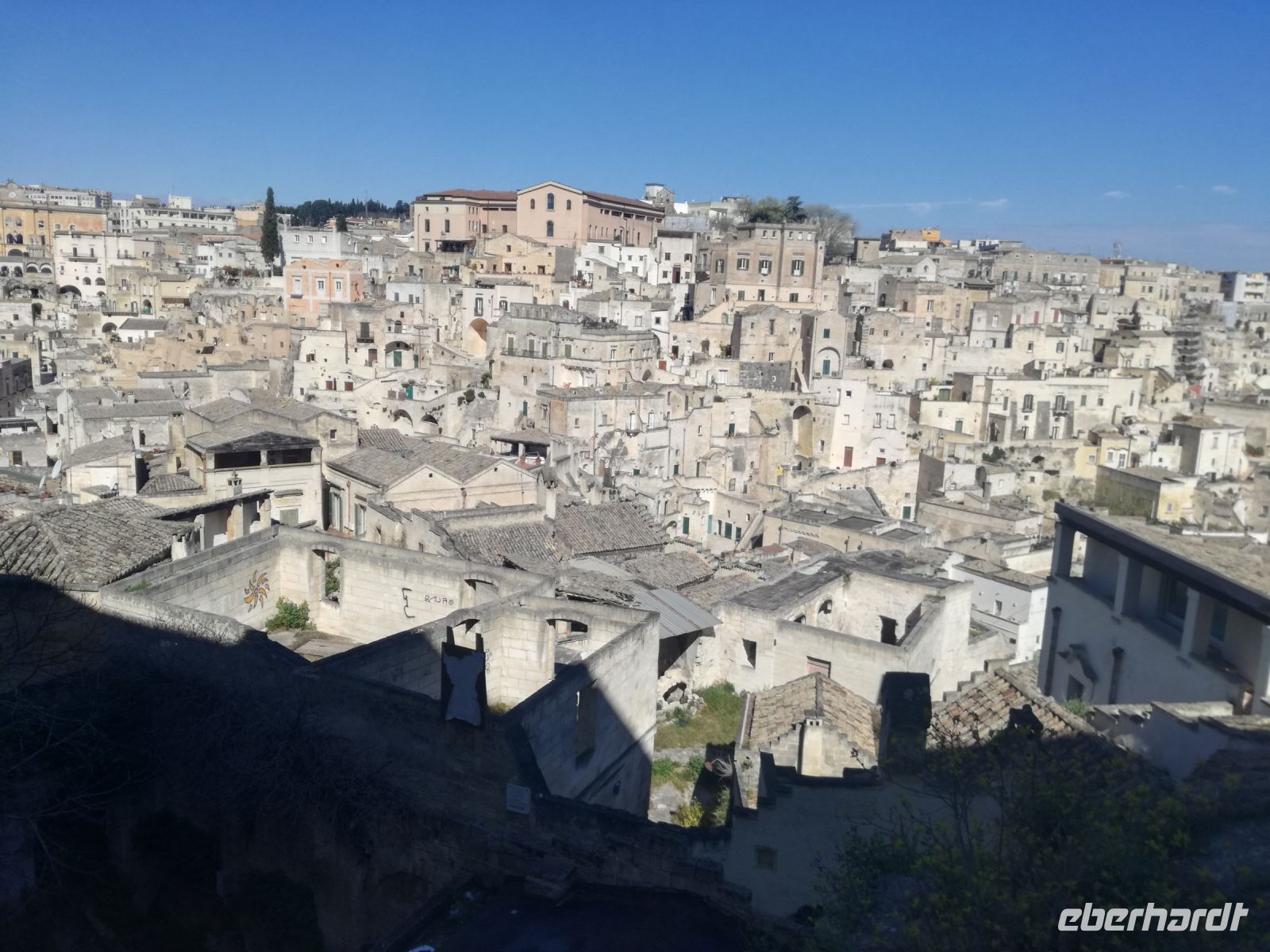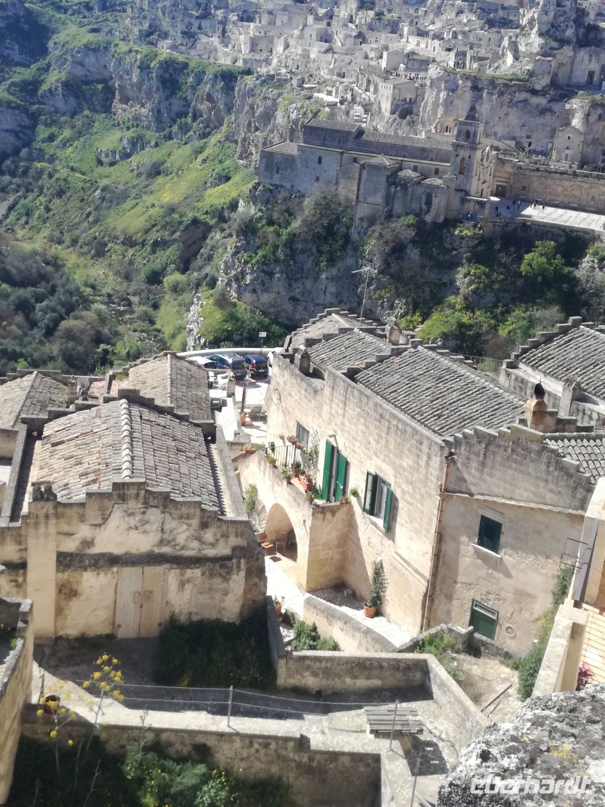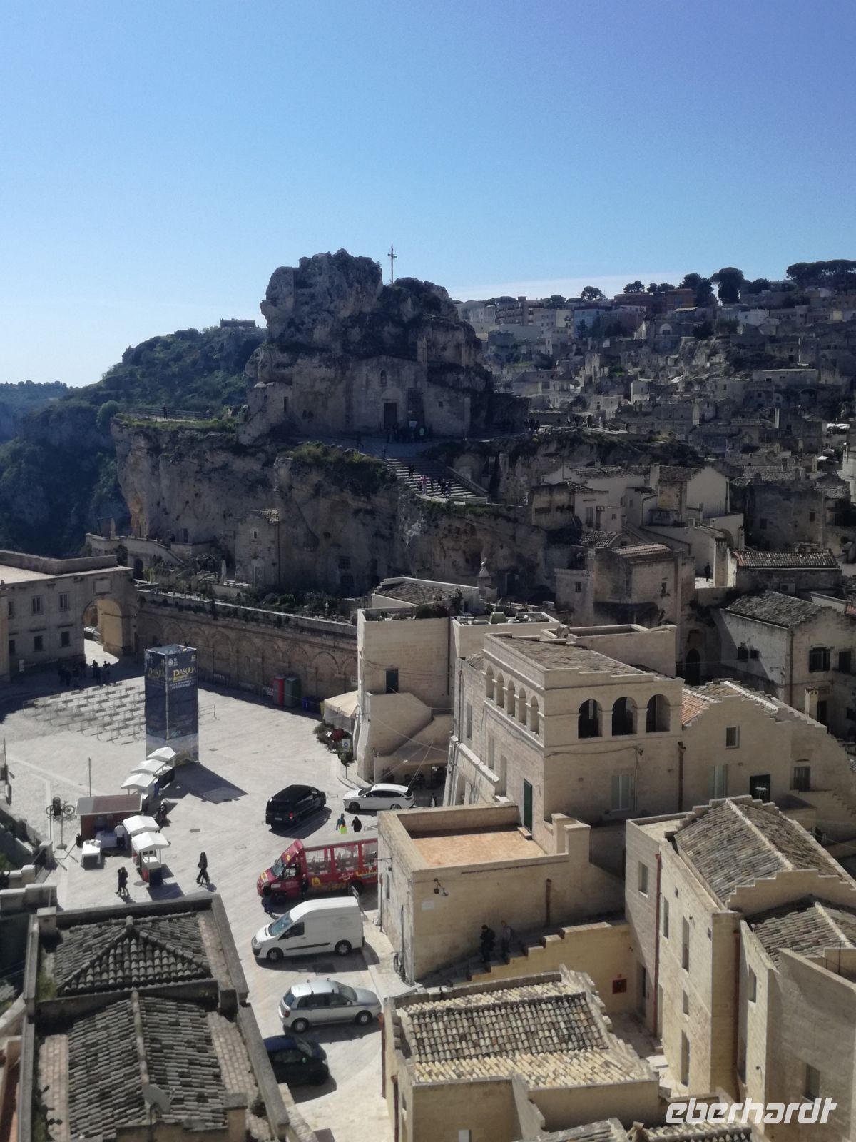 Vielleicht der Höhepunkt der Reise ? Für mich auf alle Fälle. Nach einer Stunde Fahrt und vielen Erklärungen von Mirella zu dieser geschichtsträchtigen Stadt erreichen wir Matera, 2019 zur Kulturhauptstadt ernannt. Überwältigend ist das Panorama dieser Stadt von verschiedenen Plattformen aus. Man muss sie in ihrer Größe und Schönheit erfassen, mit ihren verschachtelten Häusern mutet sie ein bißchen wie eine Spielzeugstadt an. Matera ist Kulisse zahlreicher Spielfilme, wie dem 2004 von Mel Gibson gedrehten Film „Die Passion Christi“. Entlang diesem Weg erreichen wir quer durch die Stadt die Sassi. So werden die Höhlenwohnungen der einst ansässigen Bevölkerung genannt. Anfang des 19. Jahrhunderts erlangte die Stadt noch einmal tragischen Ruhm, nachdem der italienische Arzt Carlo Levi die Zustände in den Sassi anprangerte. Diese hat er in seinem Buch "Christus kam nur bis Eboli" niedergeschrieben. Noch um 1950 lebten in den Sassi Menschen unter unwürdigen und vor allem unhygienischen Verhältnissen, was schließlich die Beschlagnahmung der Höhlenwohnungen 1952 zur Folge hatte. Matera war der Schandfleck Italiens und die unhaltbaren Zustände das Resultat der Vernachlässigung des Südens. Die Menschen wurden schließlich umgesiedelt.