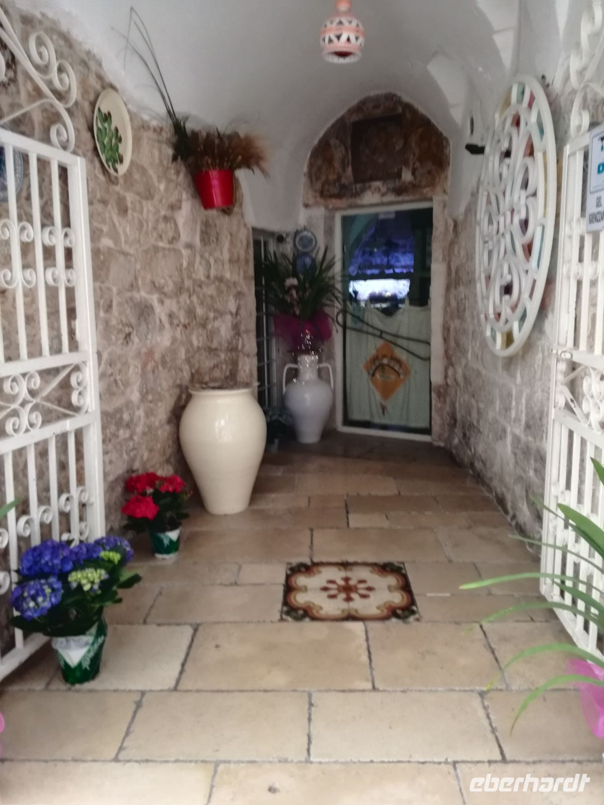 Natürlich sind wir hungrig und dürfen zum Mittagsmahl eintreten. Das Ambiente in den Gemäuern der Masseria paßt wunderbar. 10 Gänge zählen wir: Oliven, gegrillte Zuchini, den berühmten Burrata, Copocolla, Saubohnencreme. Dazu gibt es gute Weine , wie den Primitivo, der eines der Markenweine Apuliens ist. Wir erleben einen schönen Nachmittag und schlendern anschließend noch durch das Örtchen Locorotondo. Mirella macht mit uns einen wunderschönen Spaziergang durch enge Gassen mit den markanten Torbögen. Das Wetter spielt mit und unsere eifrigen Fotografen haben ihre Freude.