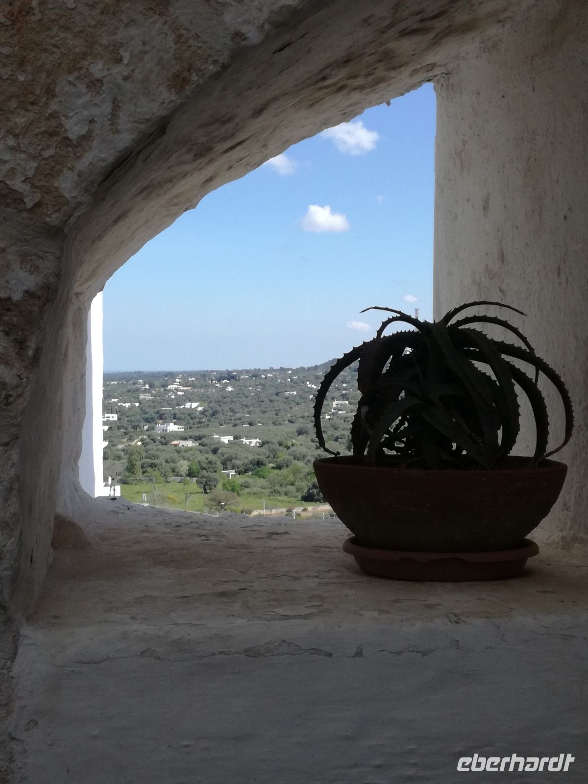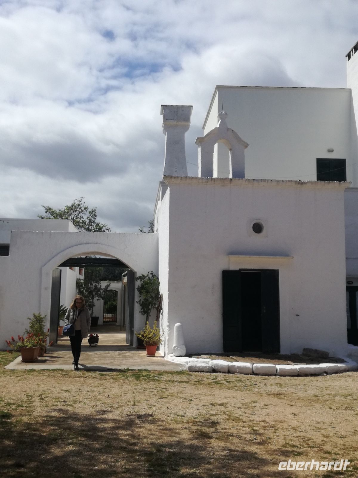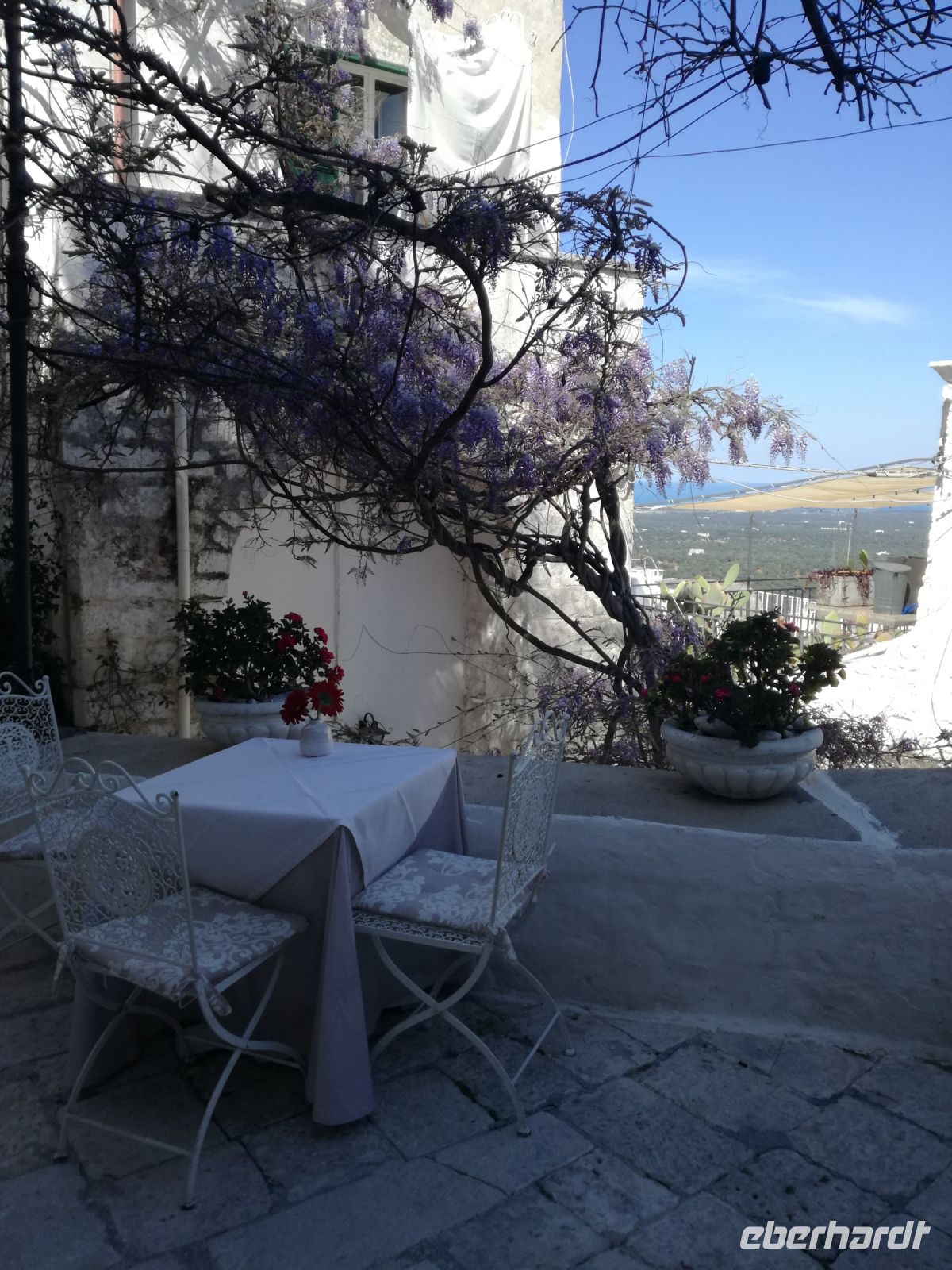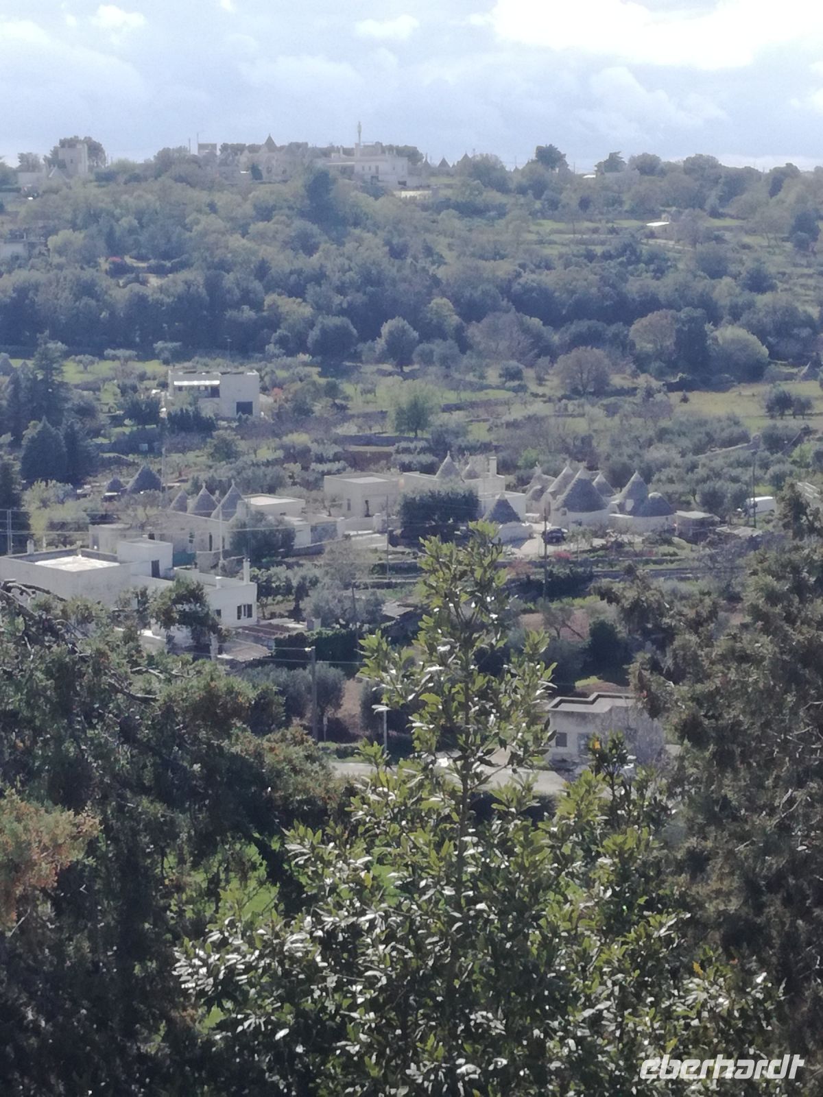 da wir erst gegen 11 Uhr zur Masseria starten, führt uns Mirella noch durch den Ort und zeigt uns die vielen nachgebauten Trullihäuser, aber auch Herrenhäuser, die im Sommer von ihren Besitzern aufgesucht werden. Ziel des Rundgangs ist ein Plateau, von dem aus wir einen schönen Blick auf den Küstenort Fasano haben.