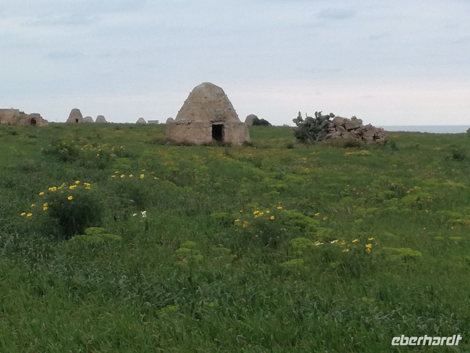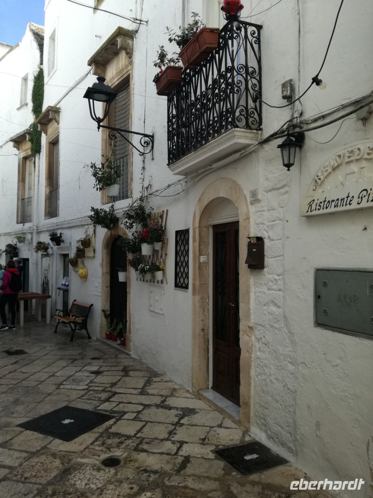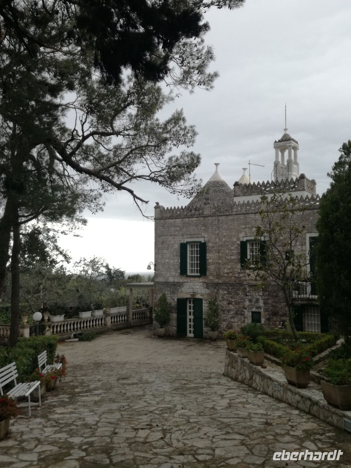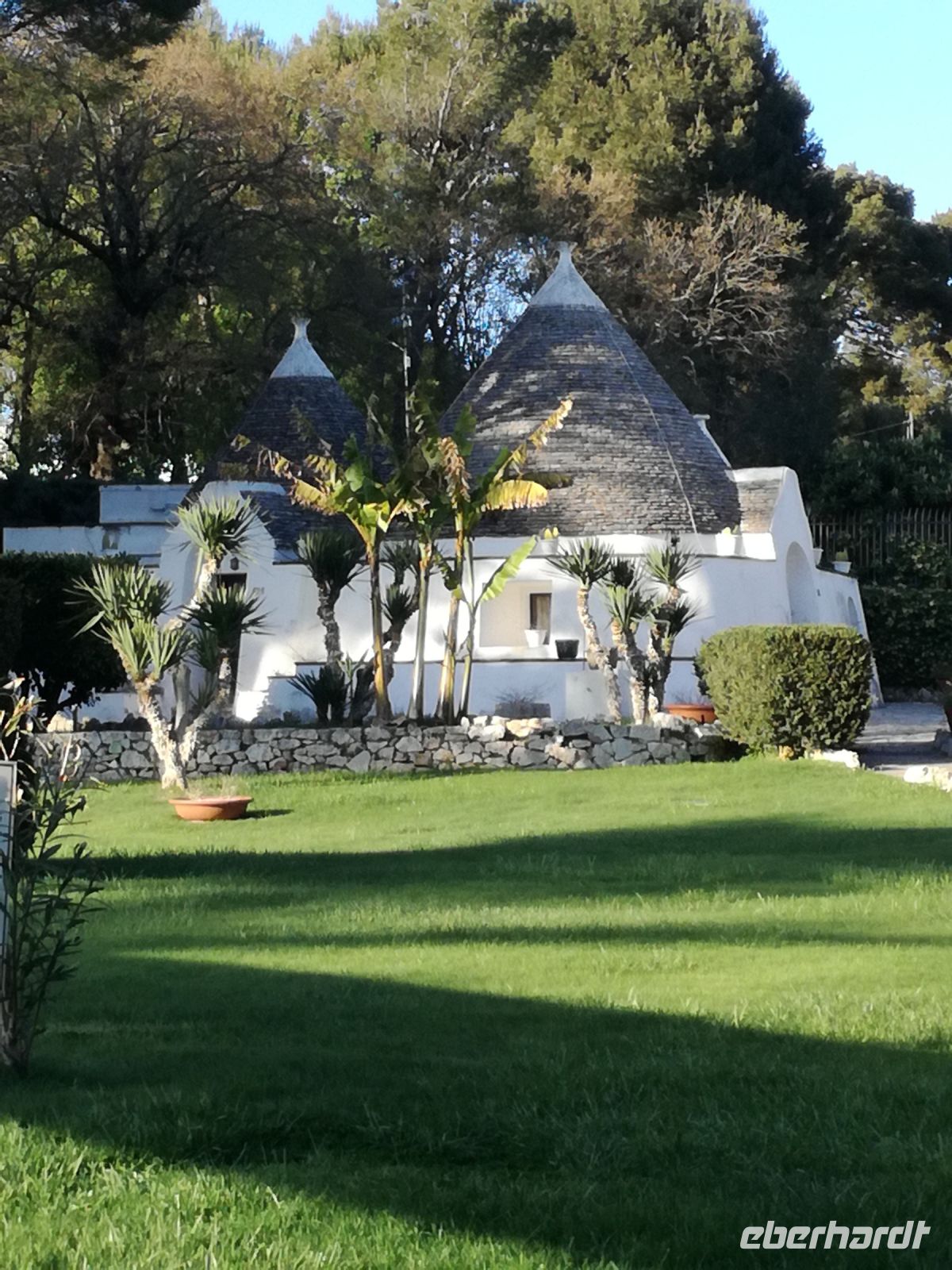 da wir erst gegen 11 Uhr zur Masseria starten, führt uns Mirella noch durch den Ort und zeigt uns die vielen nachgebauten Trullihäuser, aber auch Herrenhäuser, die im Sommer von ihren Besitzern aufgesucht werden. Ziel des Rundgangs ist ein Plateau, von dem aus wir einen schönen Blick auf den Küstenort Fasano haben.