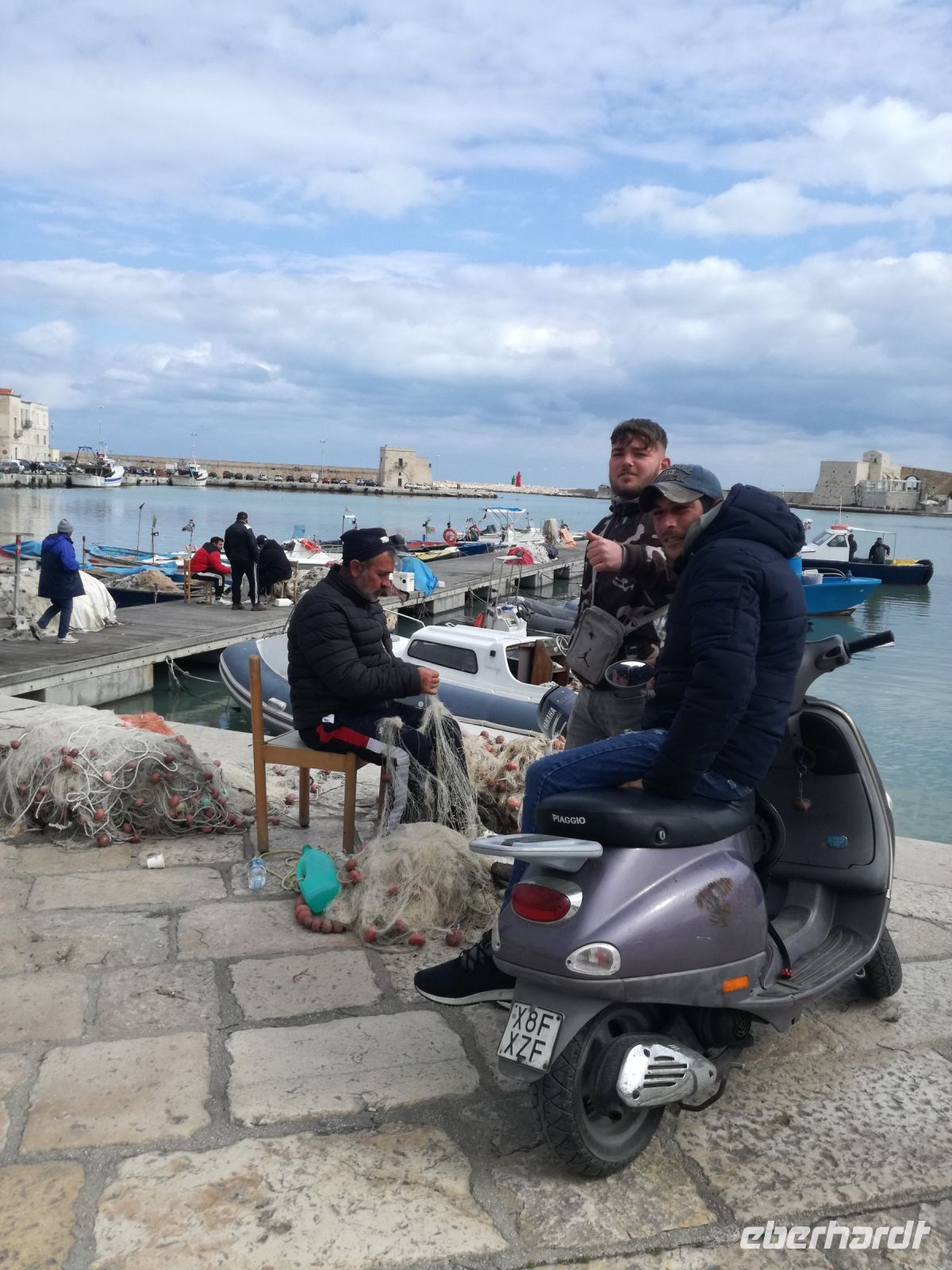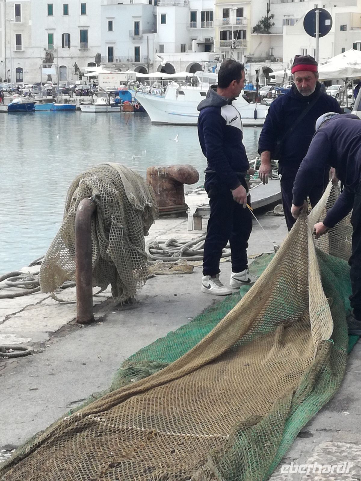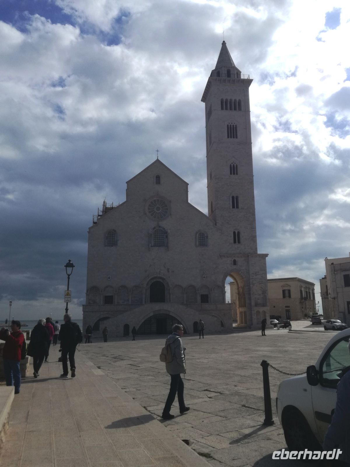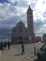 Das Hafenstädtchen Trani mit seinen 70000 Einwohnern liegt direkt am Meer und war durch seine strategische Lage wichtigstes Schiffahrts und Handelszentrum Apuliens. Mondän ragt die Wallfahrtskirche San Nicola Pellegrino am Meer empor. Sie wurde im 13.Jahrundert fertig gestellt und ist eines der perfektesten Beispiele romanischer Baukunst. Wir besichtigen die Kathedrale und schauen später den Fischern beim Verkauf und flicken der Fischernetze zu. Es geht noch richtig urig hier am Hafen zu.
