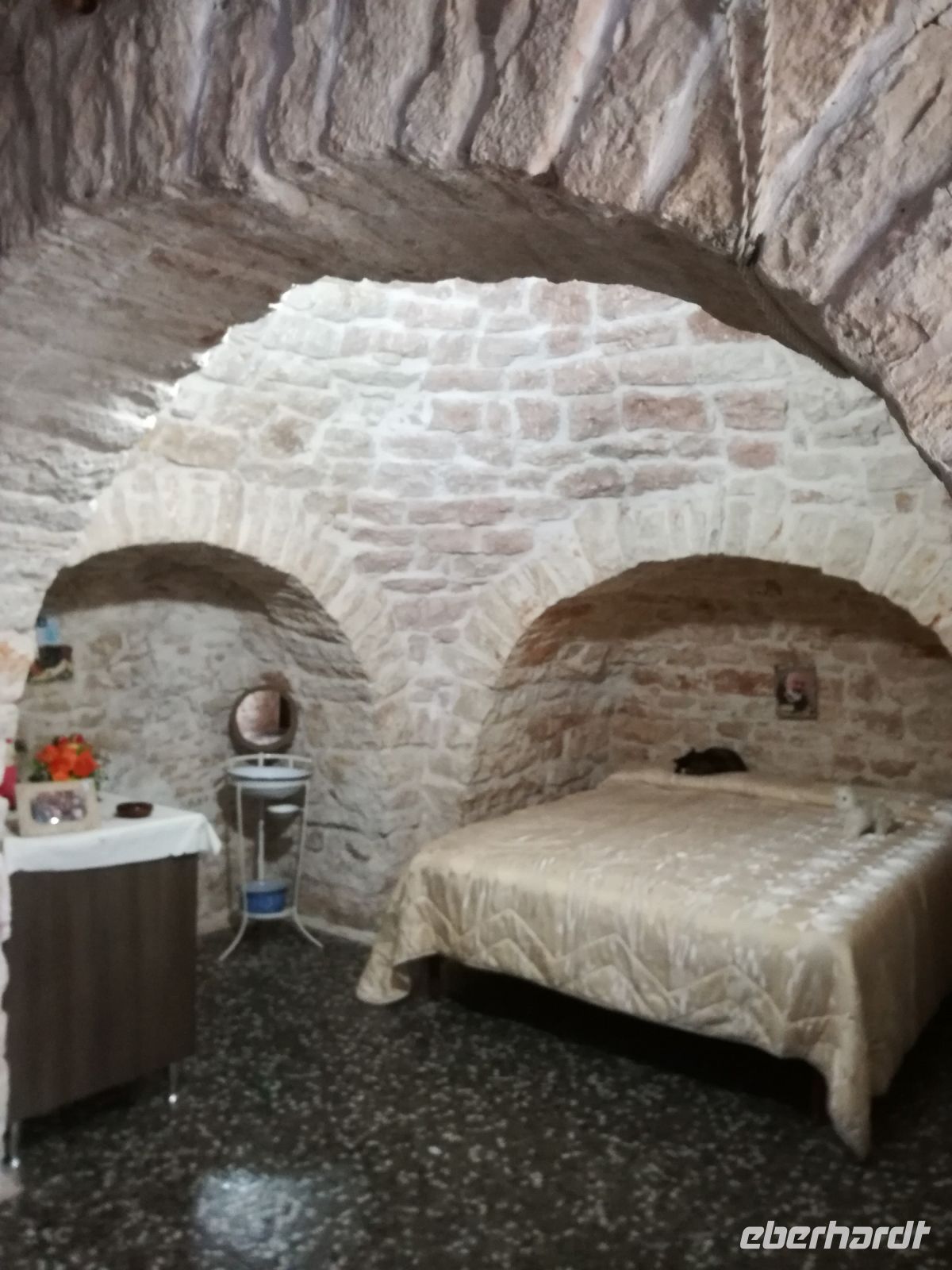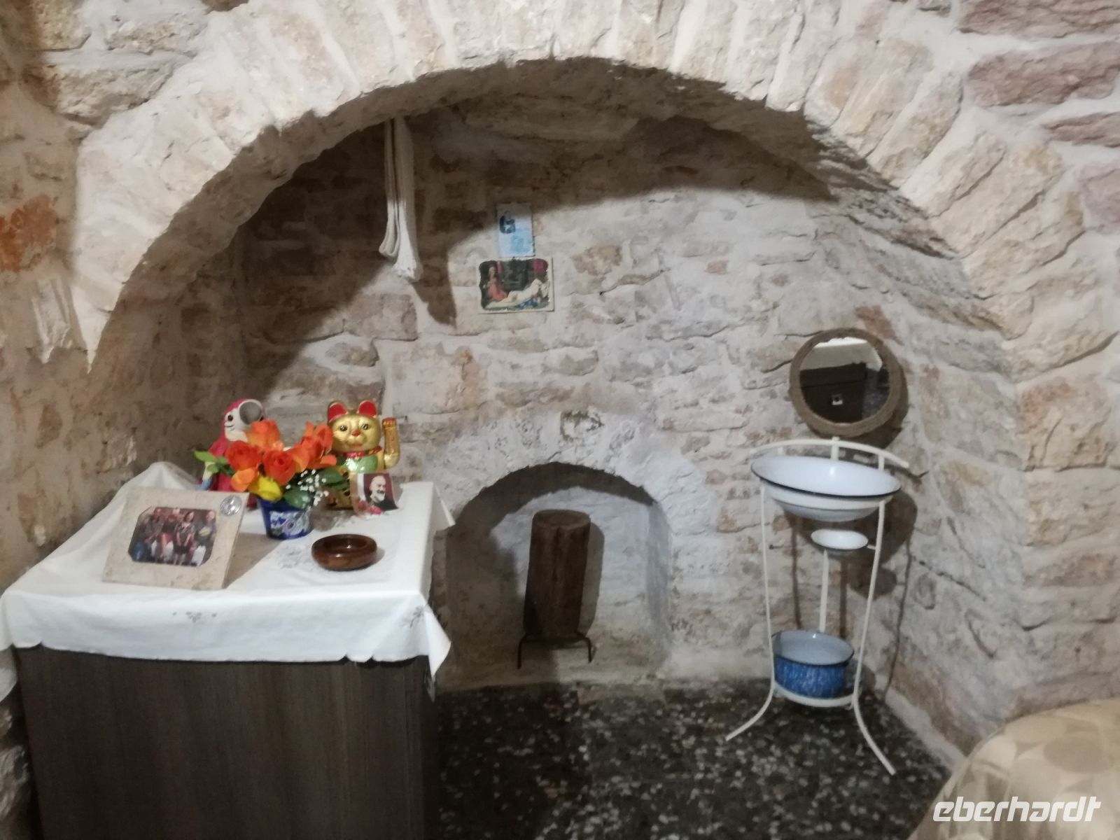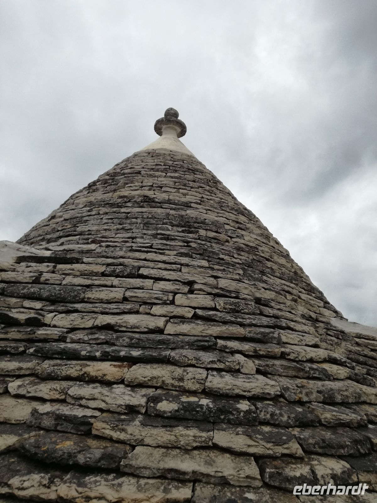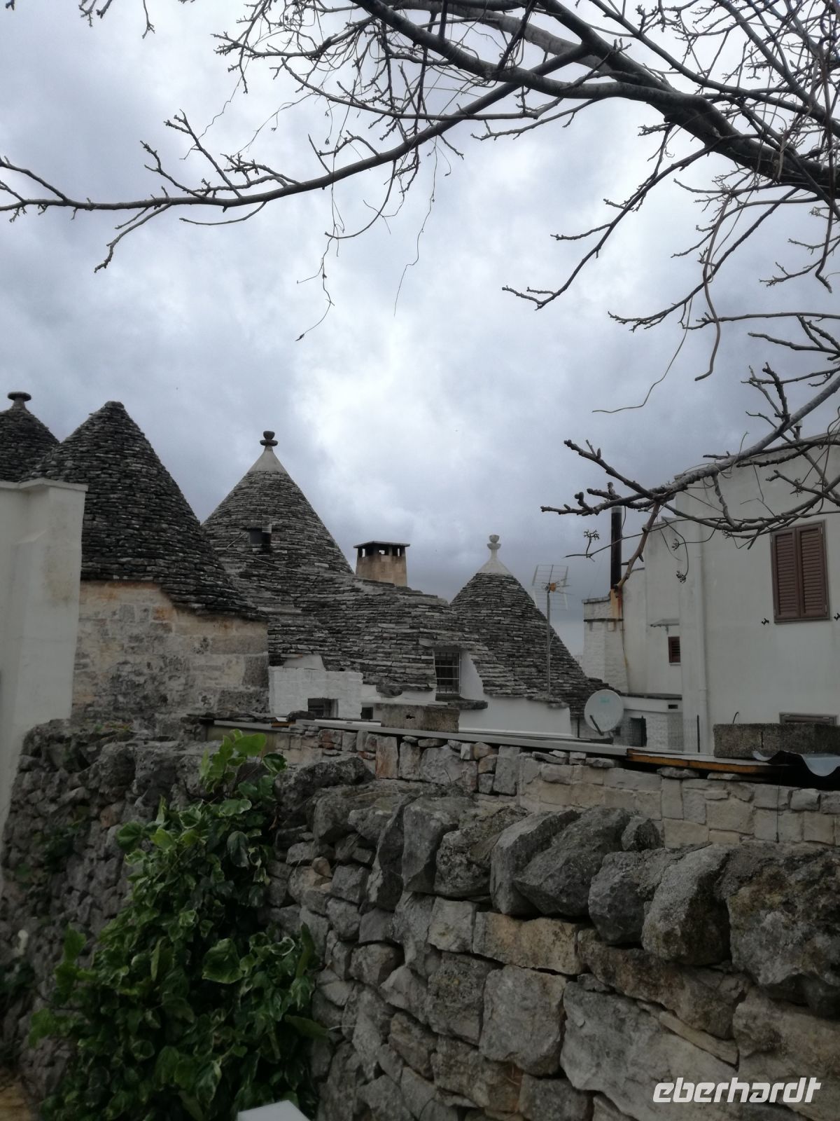 Weiter fahren wir nach Alberobello, in die Stadt der Trullihäuser. 1000 Trullis gibt es in der Neustadt und 400 in der Altstadt. Nach einer kleinen Mittagspause, aber schwieriger Suche nach einem Cafe, beginnen wir mit der Besichtigung, zuerst die Neustadt. Hier ist noch Farbe auf den Fotos, weil die Sonne ganz zaghaft ab und zu blinzelt. Unzählige Trullis, Rundhäuser meist in weiß mit einem grauen Kegeldach schmücken die Neustadt. Sie werden auch als lustige Zipfelmützen wahr genommen und dienen als herrliche Kulisse für Geschäfte und Restaurants. Die Trullis sind in Trockenbauweise entstanden, auf den Steindächern befinden sich meist christliche Symbole. Unser Spaziergang (oder rennen wir schon ?) führt uns weiter in die Altstadt, von Regen begleitet. Wir werfen einen Blick in das Innere eines Trullihauses und dann wieder nach draußen. Es gibt keinen Grund mehr, hinaus zu gehen…das Wasser rinnt…auf den Straßen… in den Schuhen…Schade, Alberobello unter blauem Himmel bleibt uns verwehrt. Uns retten nur noch der Bus und die heiße Badewanne !