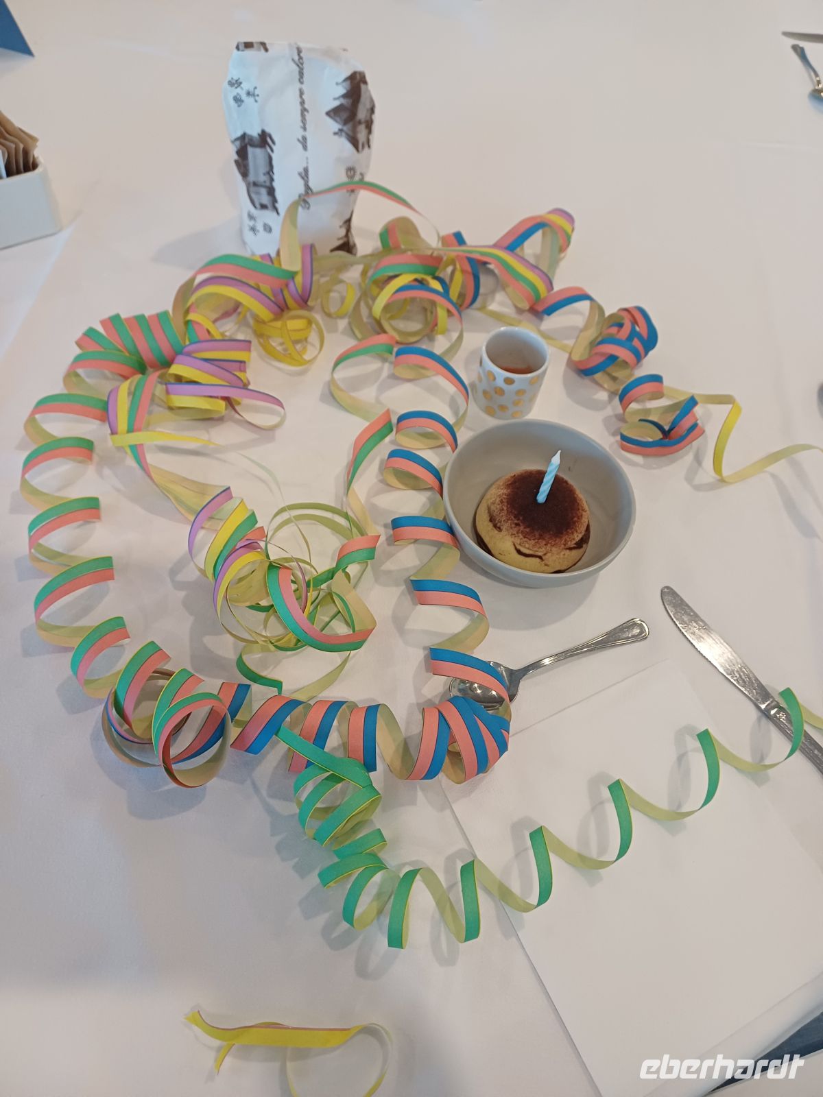 Heute haben wir in der Gruppe ein Geburtstagskind -deshalb gibt es ein "Happy birthday", einen festlich gedeckten Tisch und Tiramisu.