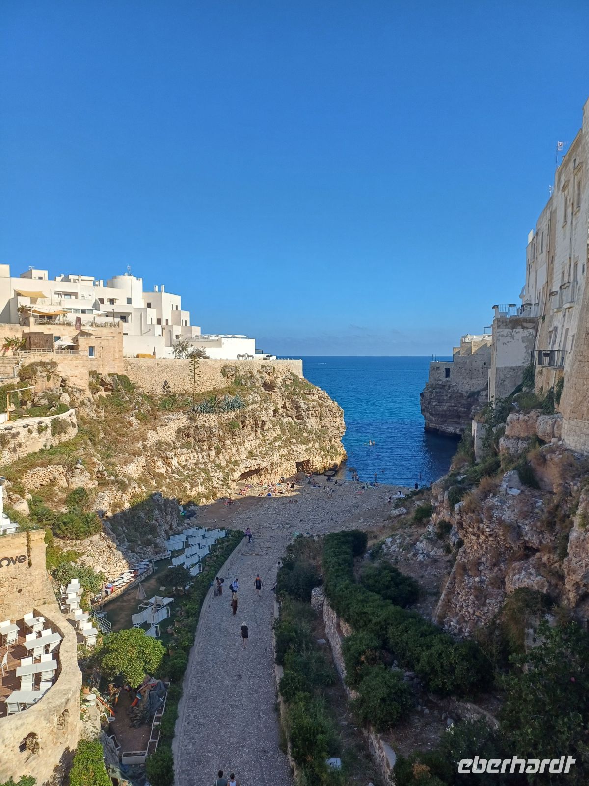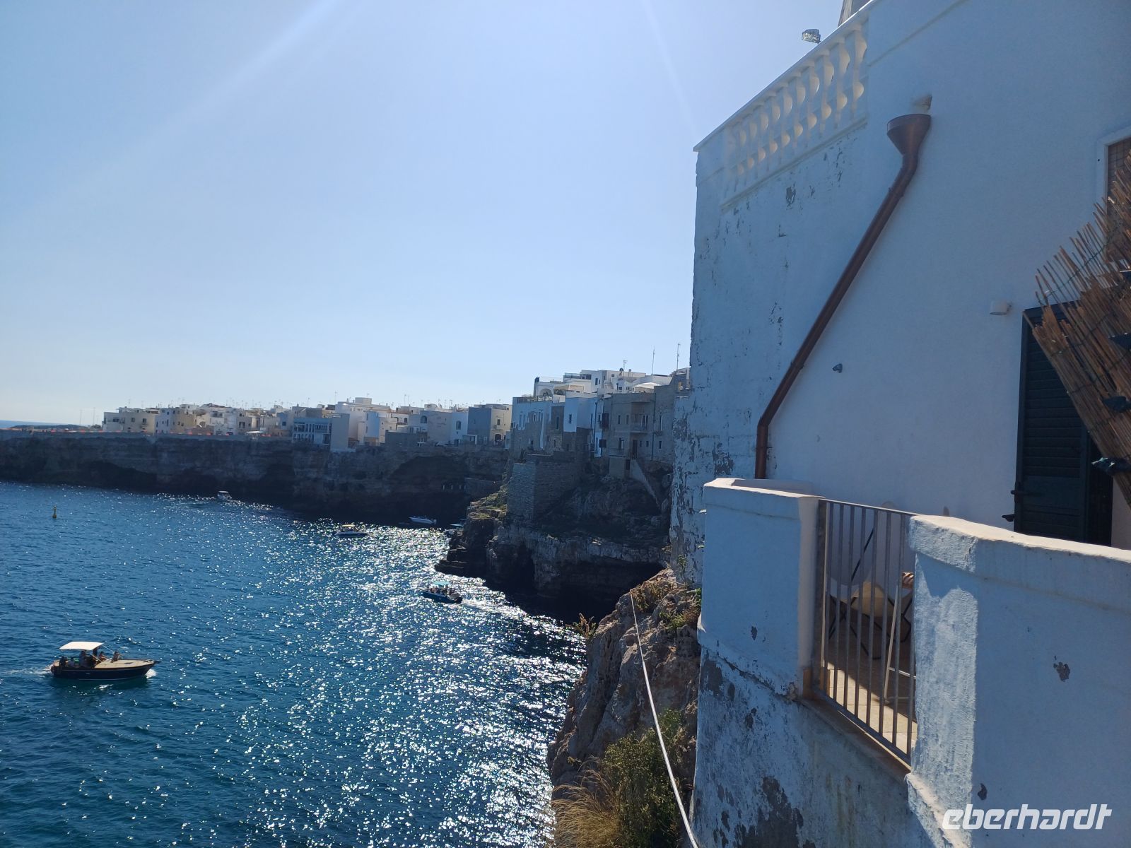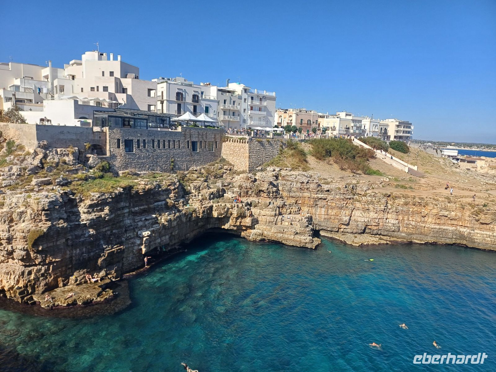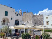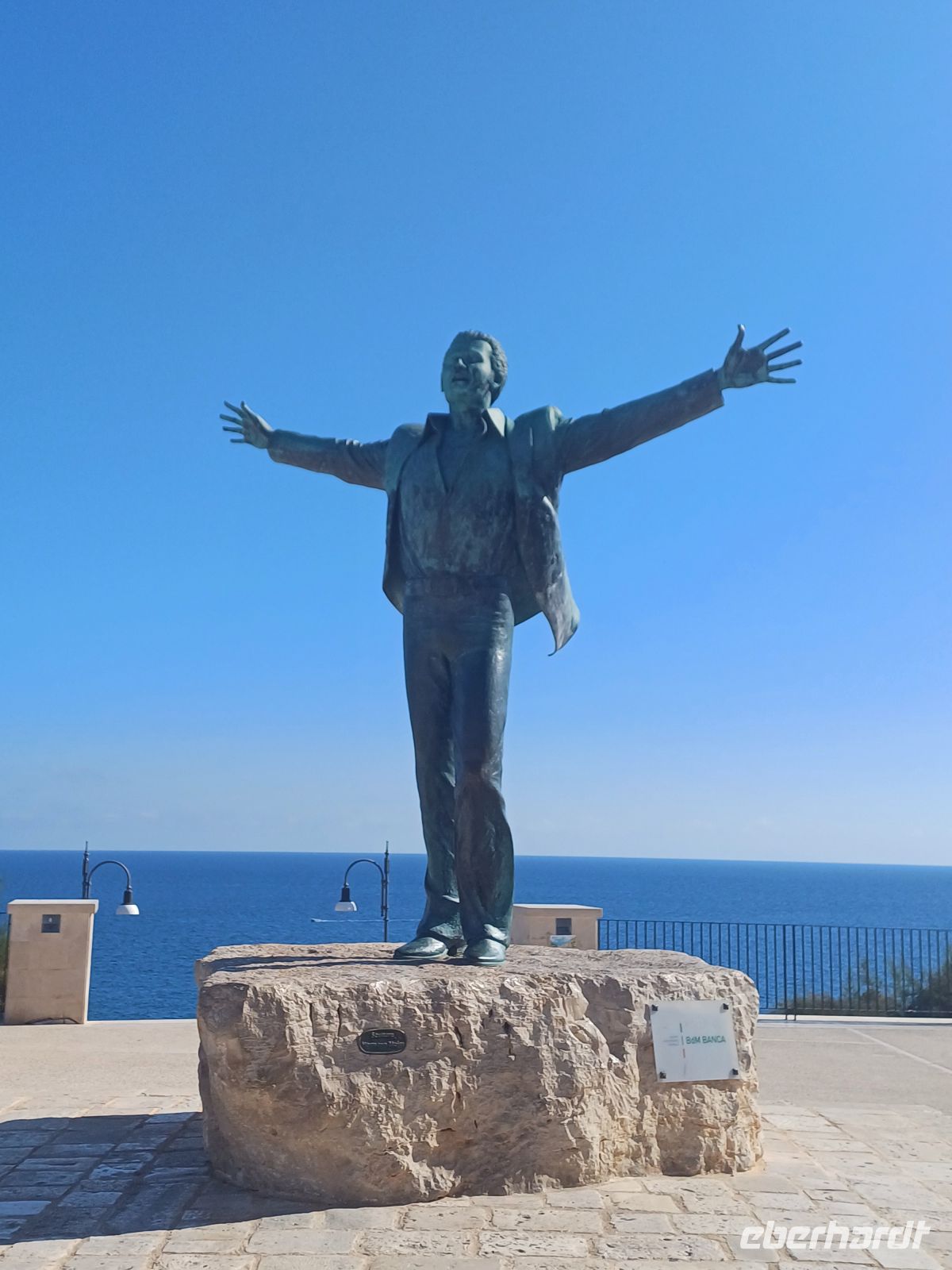Unser Reisebus führt uns heute ins bezaubernde Städtchen „Polignano a Mare“, der Ort hat eine jahrtausendalte Geschichte von der Bronzezeit bis zu den Römern. Der Blick auf „Polignano a Mare“ ist atemberaubend, auf dem löchrigen Kalkfelssporn stehen die weiß gekalkten Häuser. Beim Spaziergang durch die Gassen bekommen wir einen Eindruck vom süditalienischen Leben, einige Gäste besuchen die Cafes oder probieren Eis. Der Sohn der Stadt steht präsent in der Stadt, der Sänger Domenico Modugno, bekannt durch seinen Hit: Volare