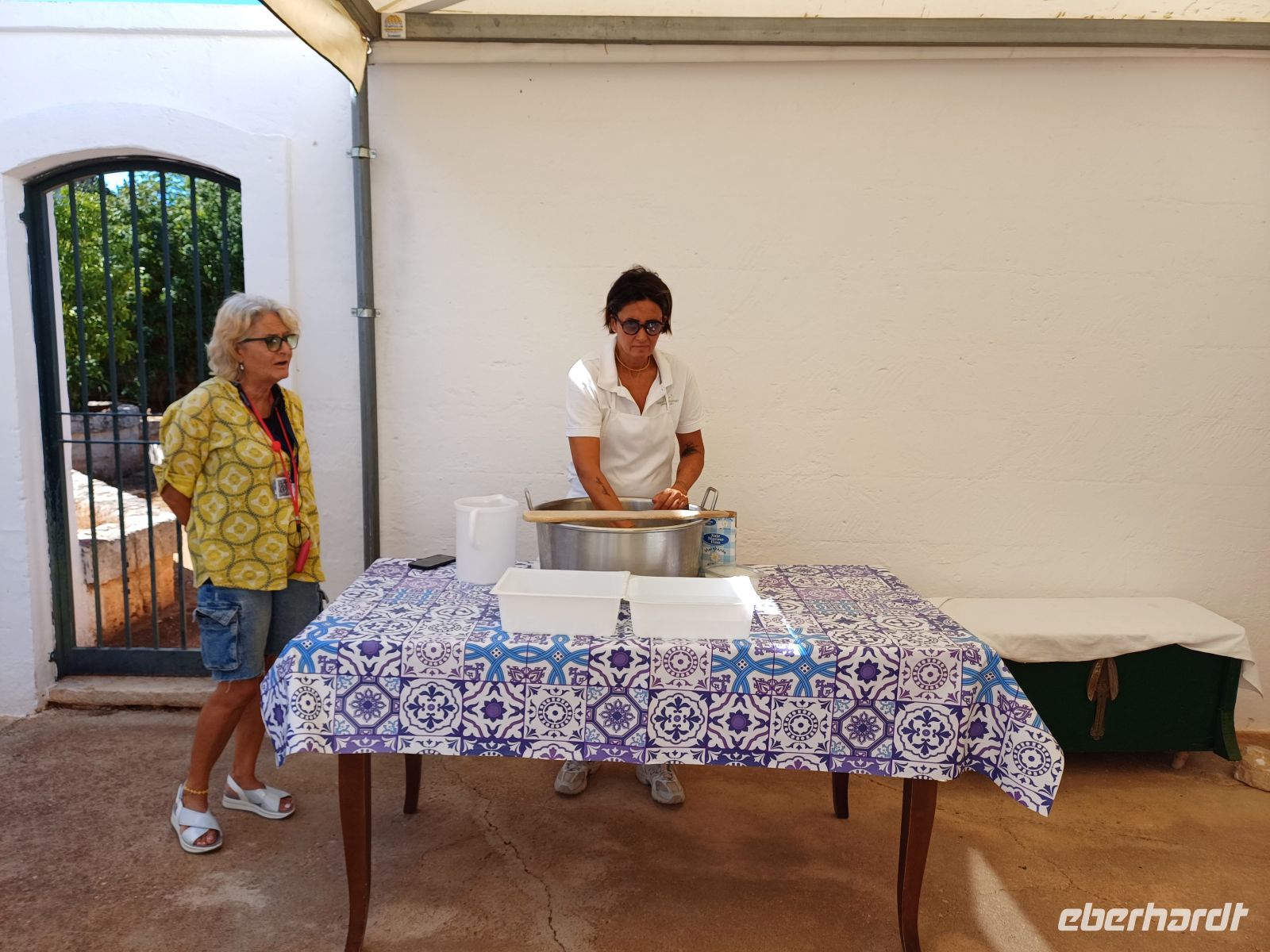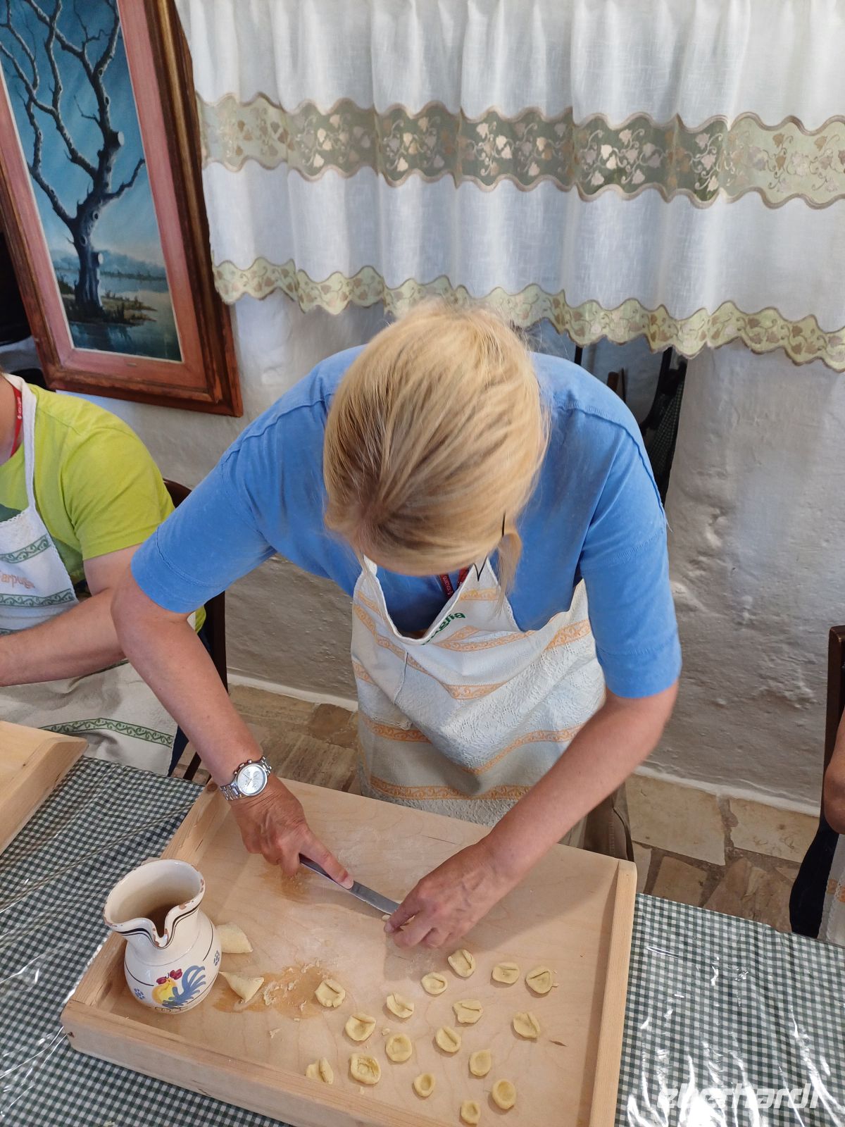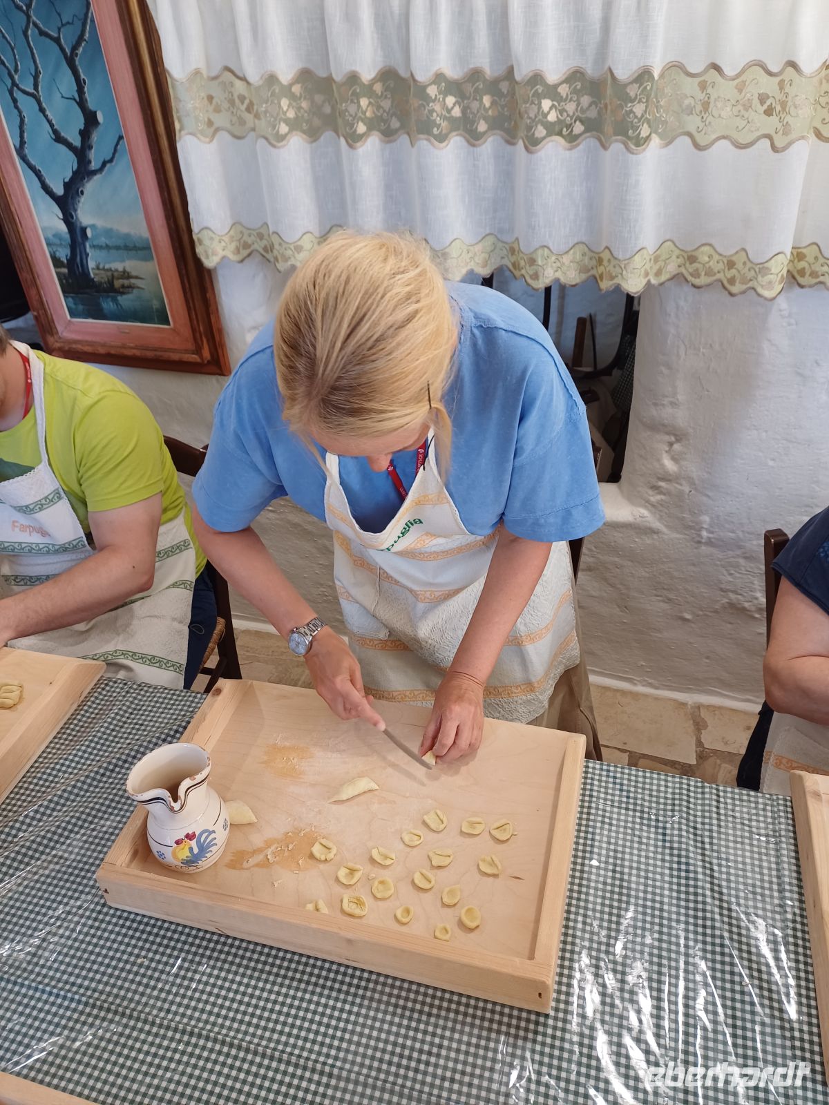 Nach dem Frühstück machen wir uns auf dem Weg in den Landhof „Masseria il Frantoio“, dieser ist ein apulischer Bauernhof mit Bioprodukten. Wir bestaunen die prachtvollen Olivenbäume im Garten. Aber nun sind wir an der Reihe und werden mit einer Schürze ausgestattet, dann geht es ans kneten des Teiges für die Öhrchennudeln(Orecchiette). Die Kreationen sind eigenwillig und meist viel größer als die Vorlage, aber allen macht es Spaß. Anschließend werden wir in das Geheimnis des Mozarellazupfens eingeführt und bekommen gezeigt wie man Polpette(gefüllte Teigbällchen)macht. Endlich dürfen wir einige Spezialitäten der Region probieren, vorallem Saubohnenmus ist sehr beliebt bei den Gästen.