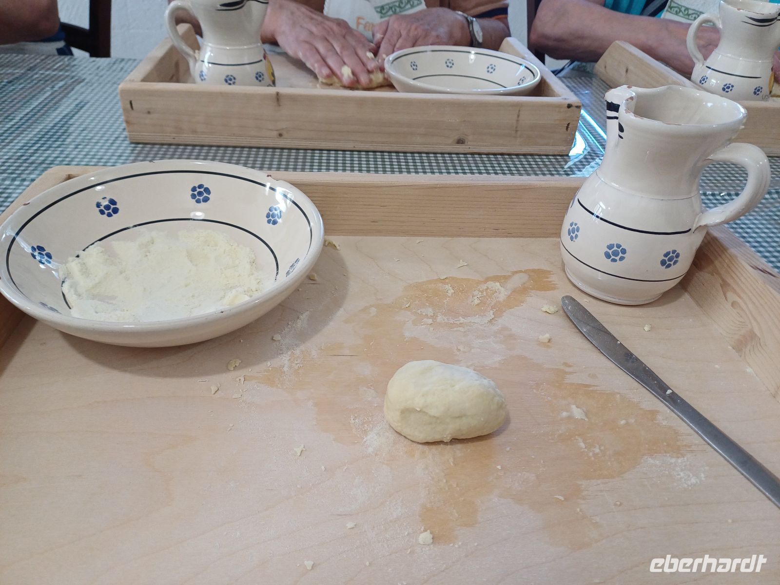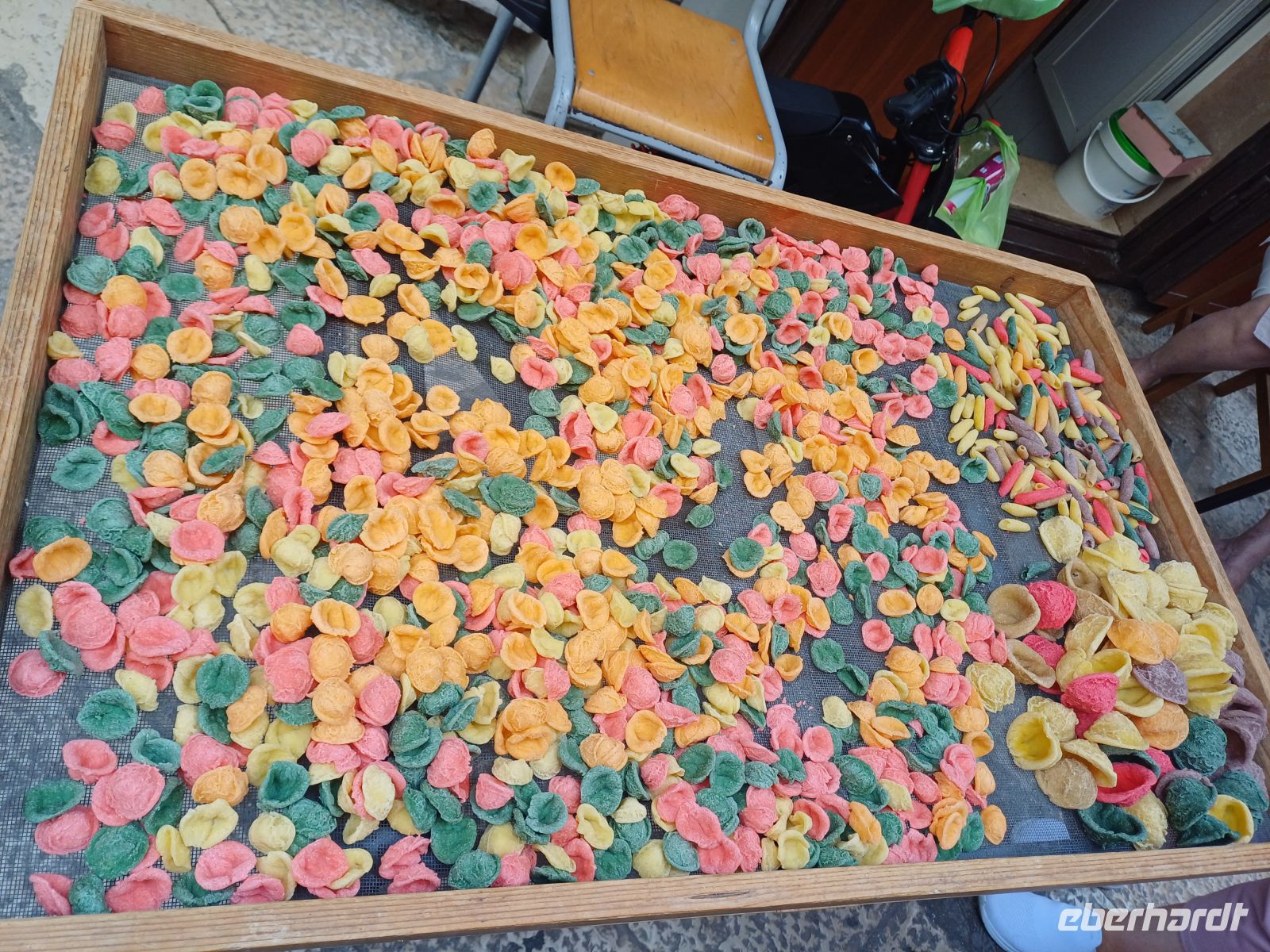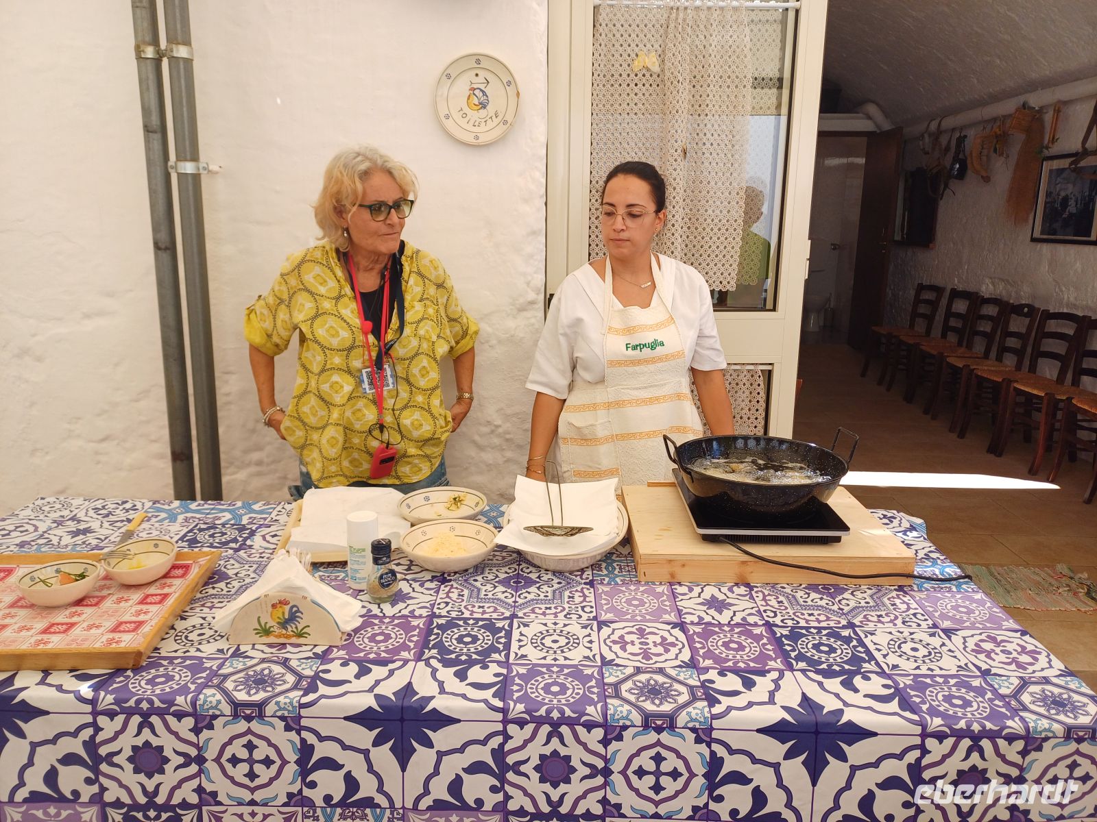 Nach dem Frühstück machen wir uns auf dem Weg in den Landhof „Masseria il Frantoio“, dieser ist ein apulischer Bauernhof mit Bioprodukten. Wir bestaunen die prachtvollen Olivenbäume im Garten. Aber nun sind wir an der Reihe und werden mit einer Schürze ausgestattet, dann geht es ans kneten des Teiges für die Öhrchennudeln(Orecchiette). Die Kreationen sind eigenwillig und meist viel größer als die Vorlage, aber allen macht es Spaß. Anschließend werden wir in das Geheimnis des Mozarellazupfens eingeführt und bekommen gezeigt wie man Polpette(gefüllte Teigbällchen)macht. Endlich dürfen wir einige Spezialitäten der Region probieren, vorallem Saubohnenmus ist sehr beliebt bei den Gästen.