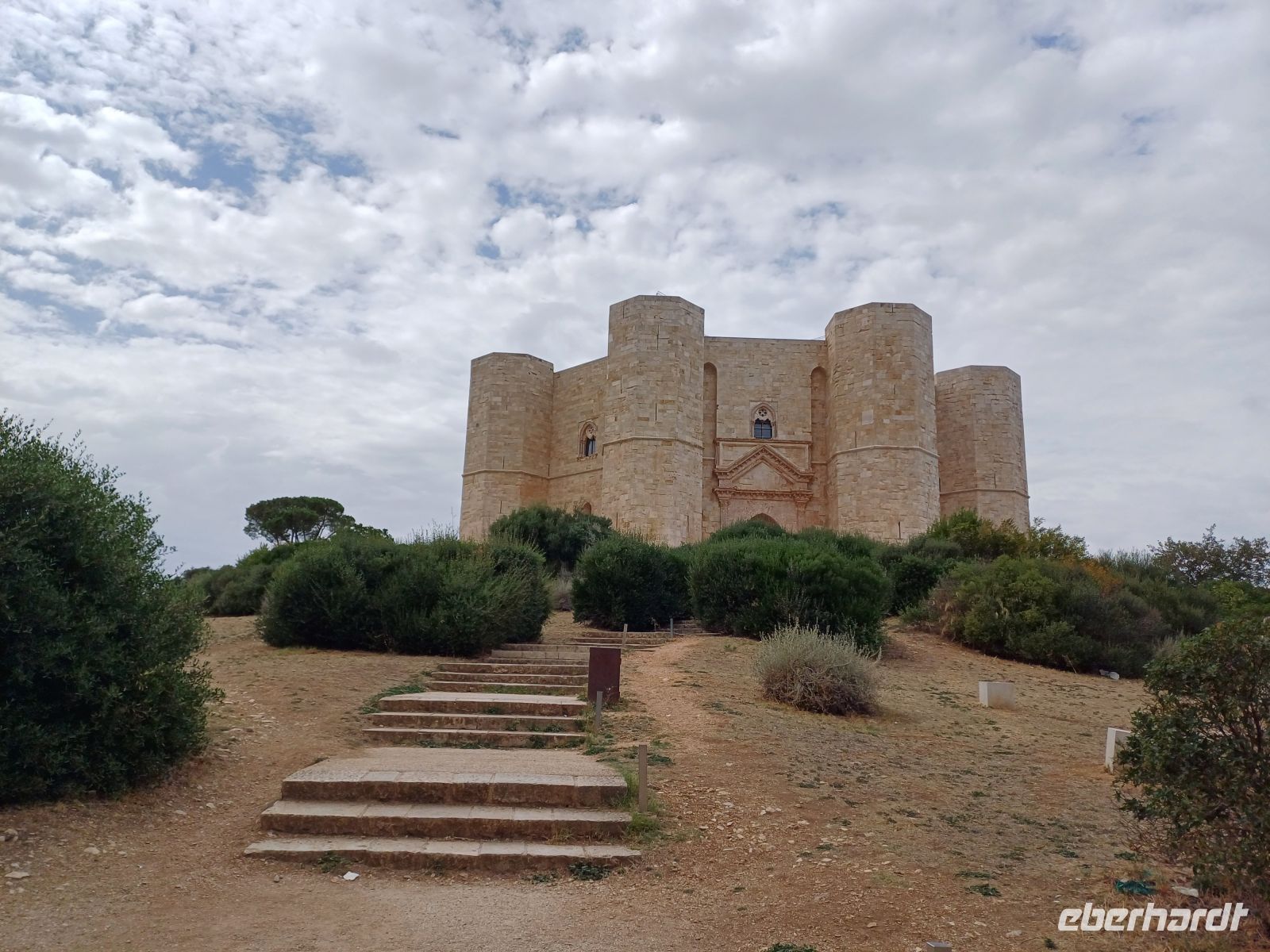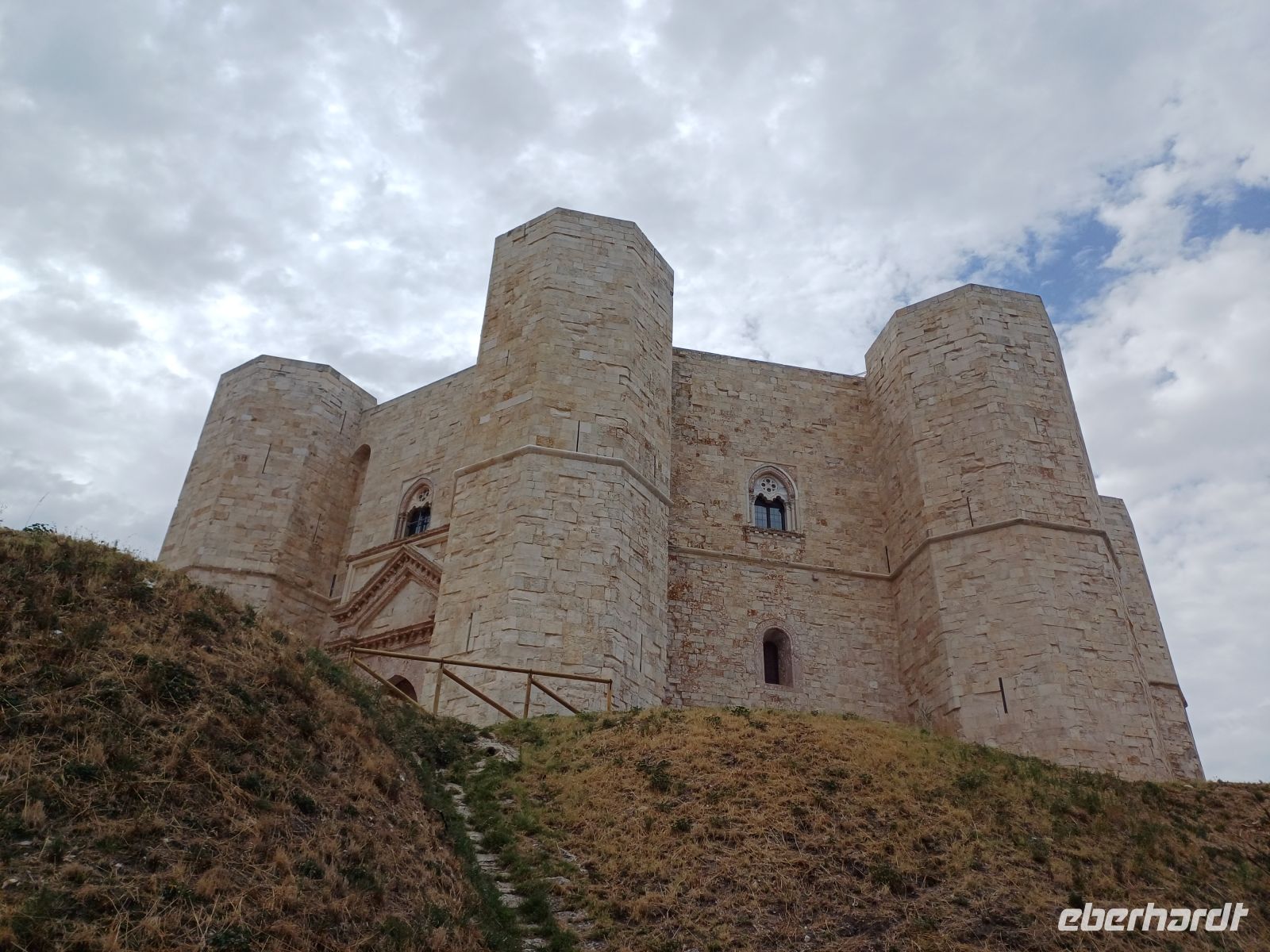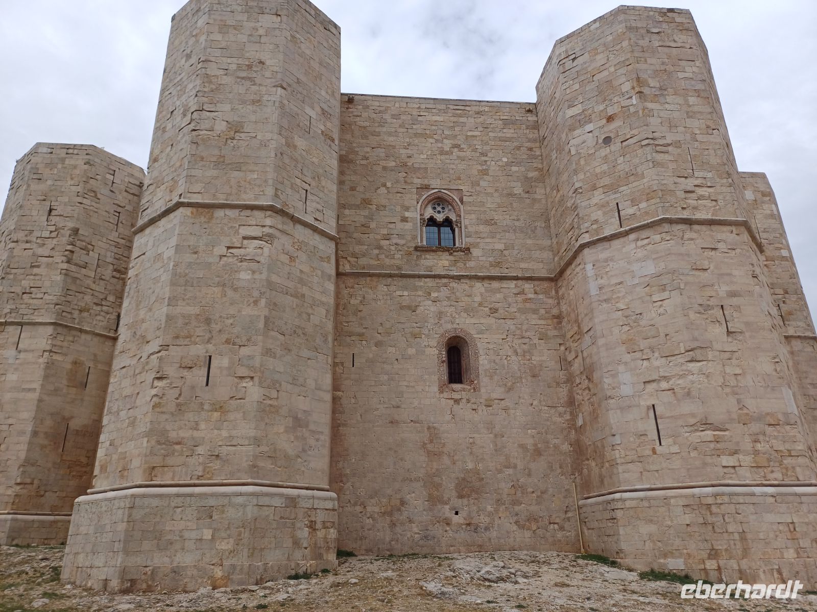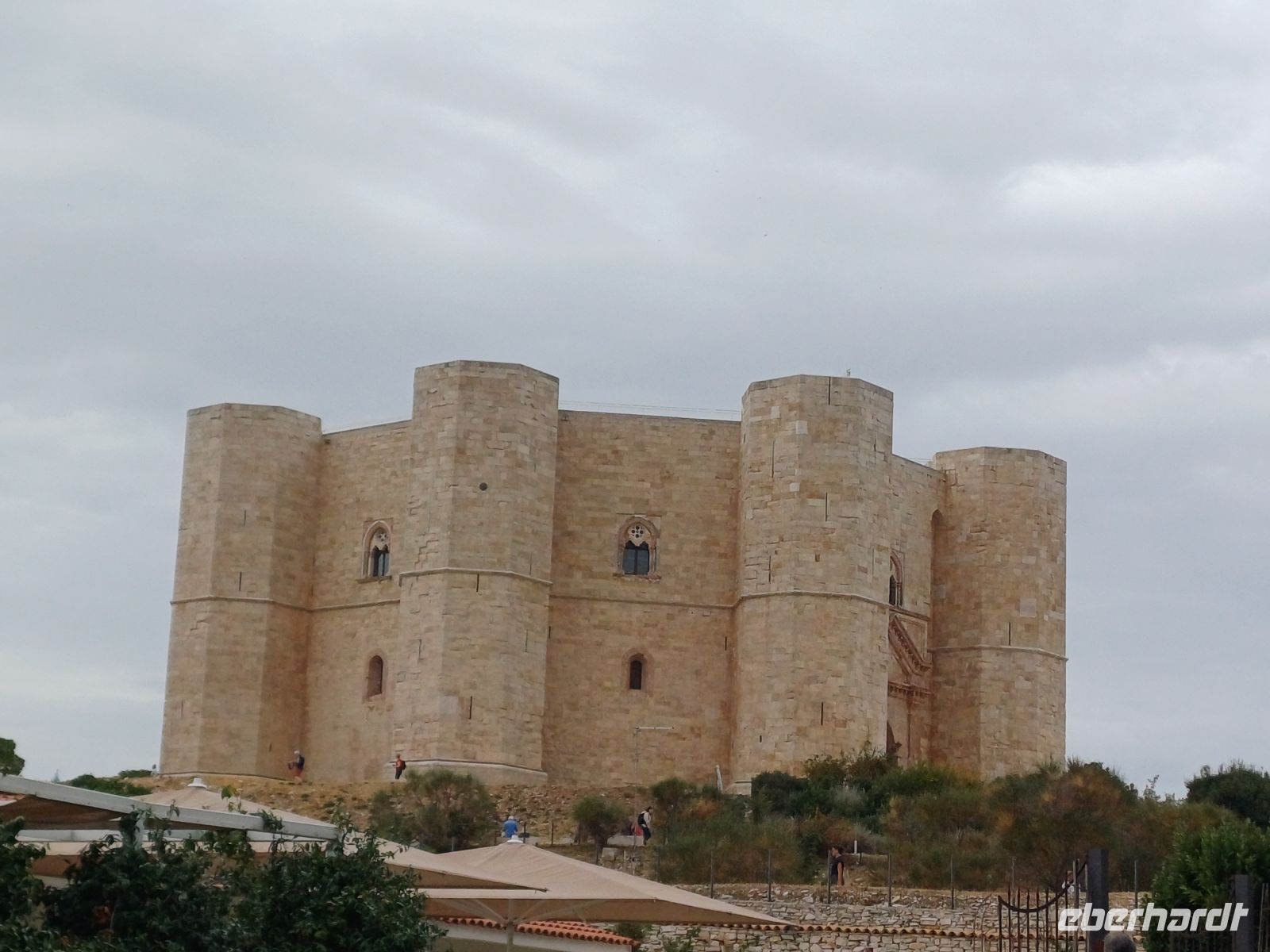 Unsere Reiseleiterin nimmt uns, vom Frühstück gestärkt, in Empfang. Der erste Stopp des Tages führt uns zum Stauferschloß „Castel del Monte“. Das Schloss ist eher eine Burg, ein einzigartiges mittelalterliches Bauwerk der Militärarchitektur steht unter UNESCO Weltkulturerbe. Bei den acht oktogonalen Türmen hat die Zahl 8 eine mystische Bedeutung. Die Innenräume sind weniger sehenswert, da nie vollendet worden. Vermutlich inspirierte das imposante Bauwerk den Autor Umberto Eco, zum Vorbild für seine Abtei im Buch „Der Name der Rose“.