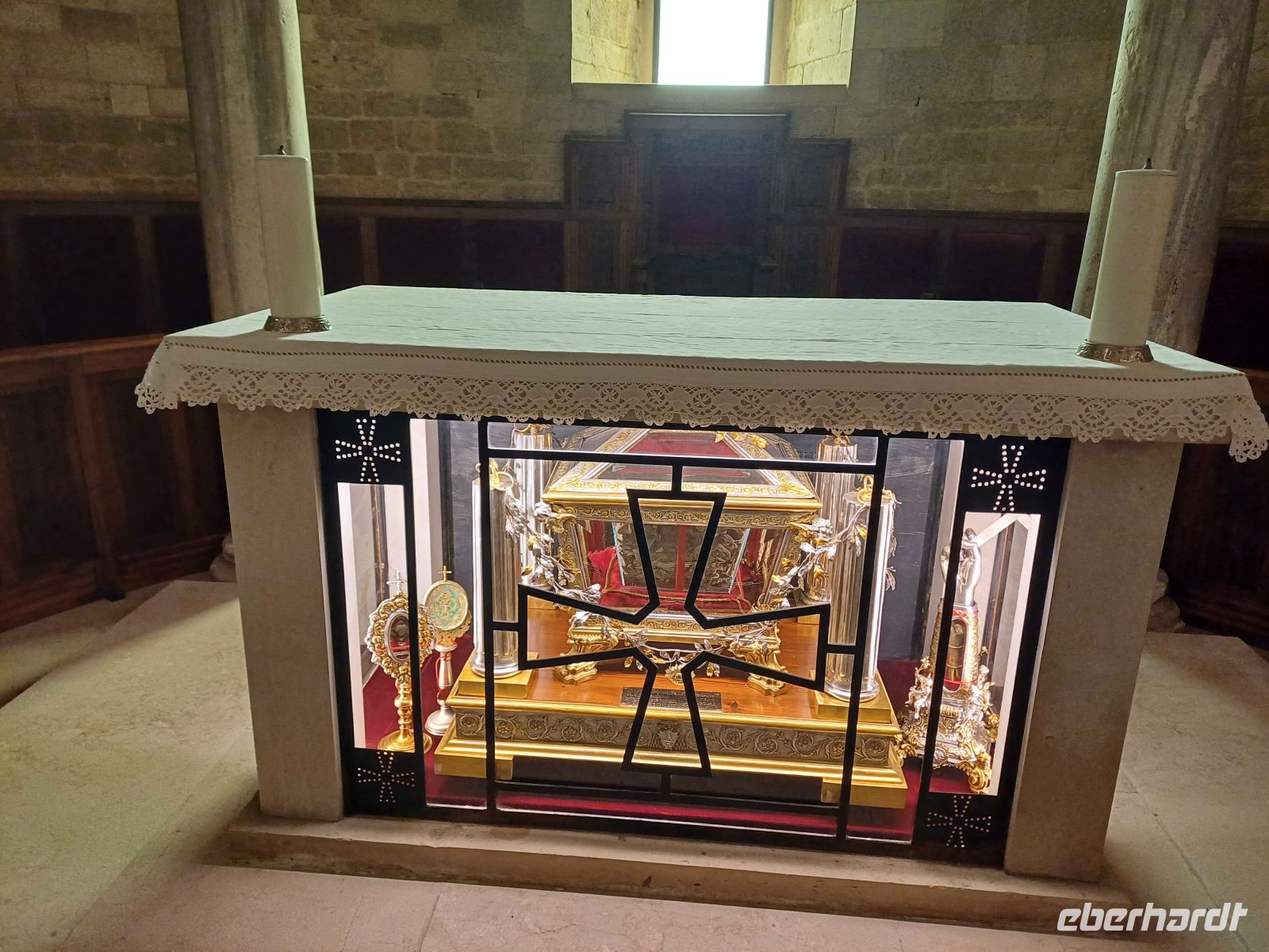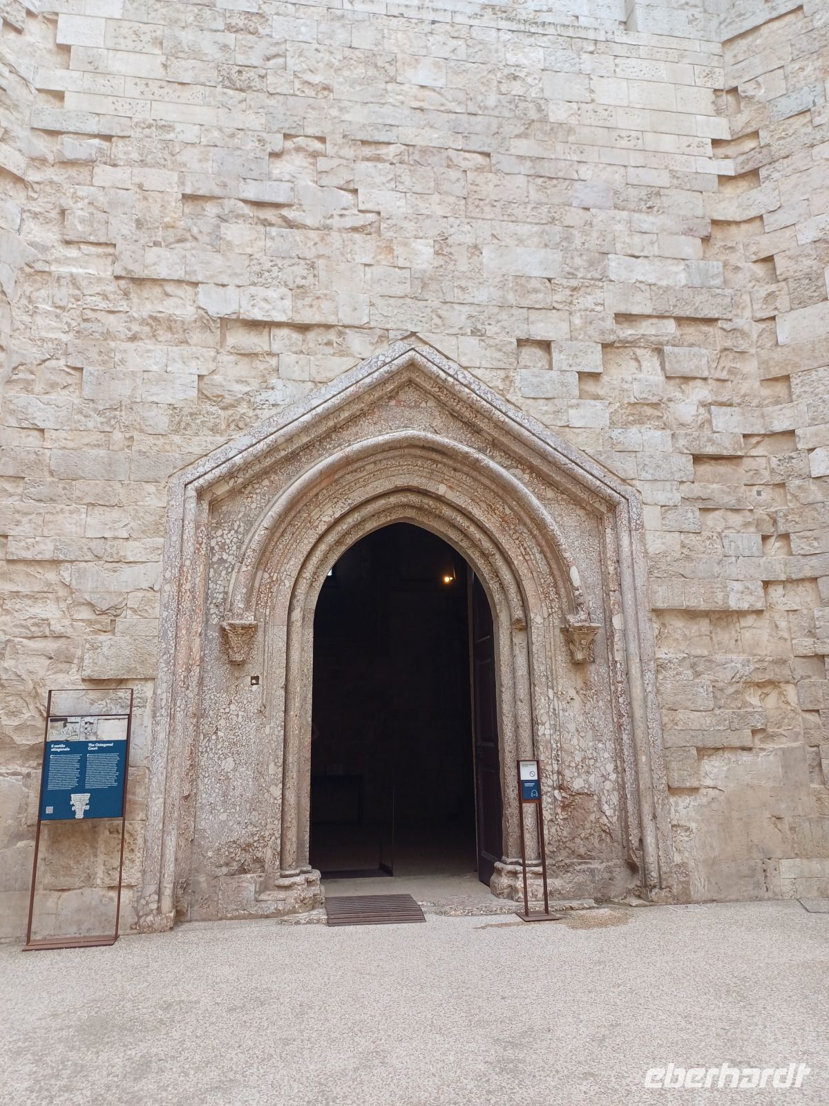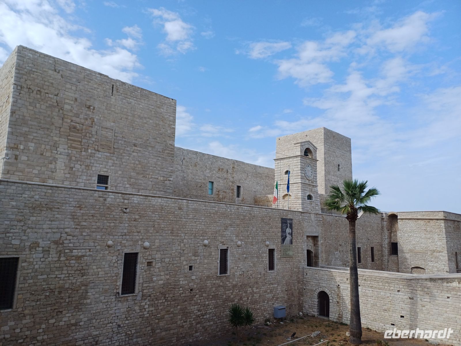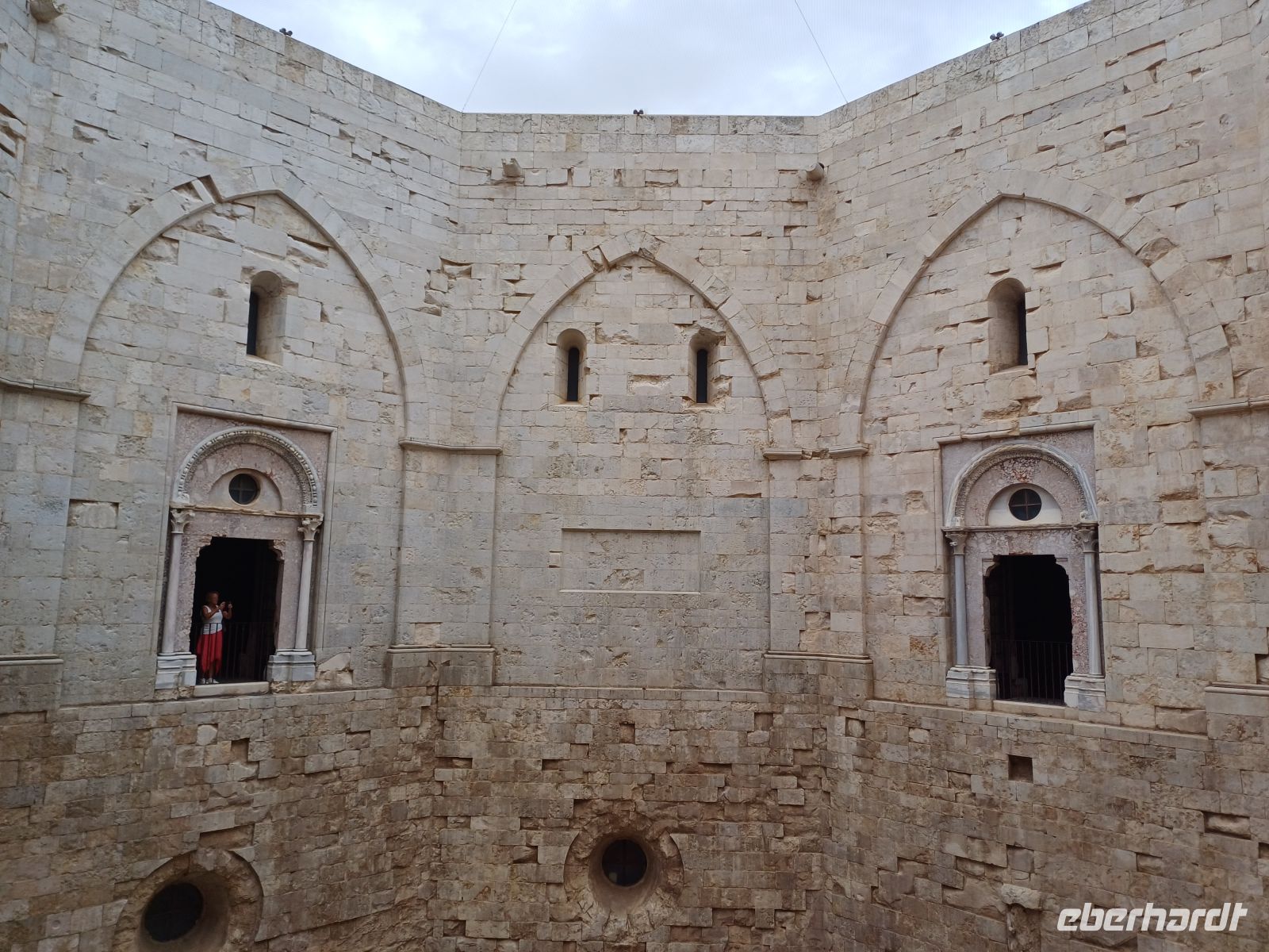 Unsere Reiseleiterin nimmt uns, vom Frühstück gestärkt, in Empfang. Der erste Stopp des Tages führt uns zum Stauferschloß „Castel del Monte“. Das Schloss ist eher eine Burg, ein einzigartiges mittelalterliches Bauwerk der Militärarchitektur steht unter UNESCO Weltkulturerbe. Bei den acht oktogonalen Türmen hat die Zahl 8 eine mystische Bedeutung. Die Innenräume sind weniger sehenswert, da nie vollendet worden. Vermutlich inspirierte das imposante Bauwerk den Autor Umberto Eco, zum Vorbild für seine Abtei im Buch „Der Name der Rose“.