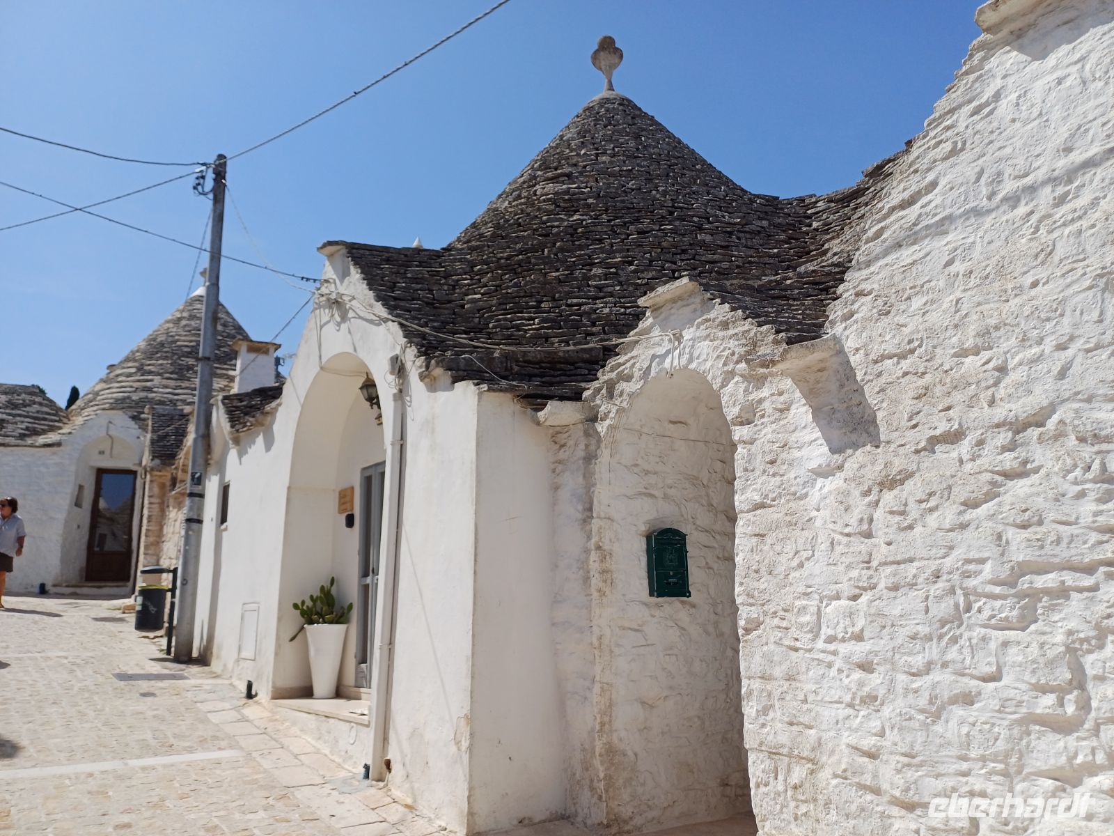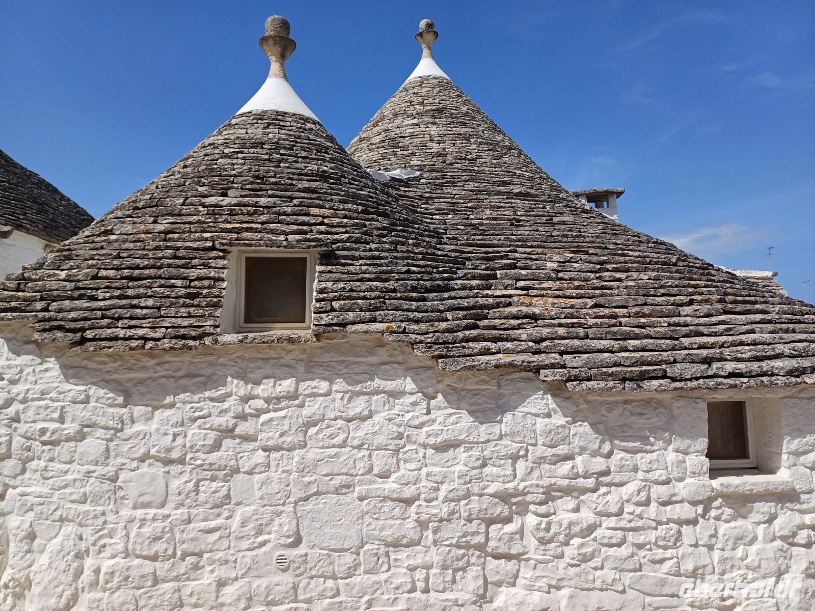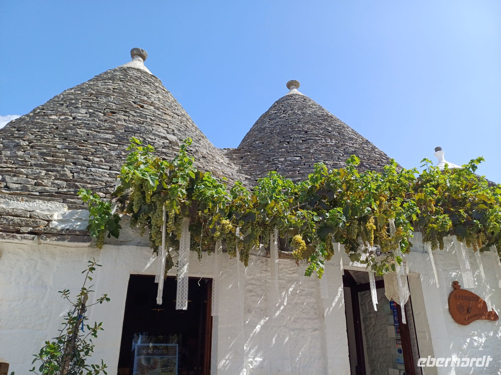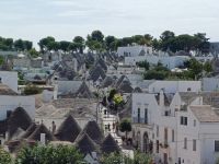 Wir sind schon sehr gespannt. Sind die Trullihäuser doch für viele Gäste der Grund, eine Reise nach Apulien zu machen. Die Trullihäuser verteilen sich in der gesamten Stadt, vor allem auf den Hügeln. Die weißen Rundhäuser zeigen uns ihre Zipfelmützen(Kegeldächer),auf den Steindächern findet man in der Regel christliche Symbole. Diese Art des Häuserbaus gab den Bewohnern die Möglichkeit das Haus in viele Steinplatten zu zerlegen. Damit konnte man den Steuereintreibern entgegenwirken, weil es nicht als richtiges Haus angesehen wurde.
