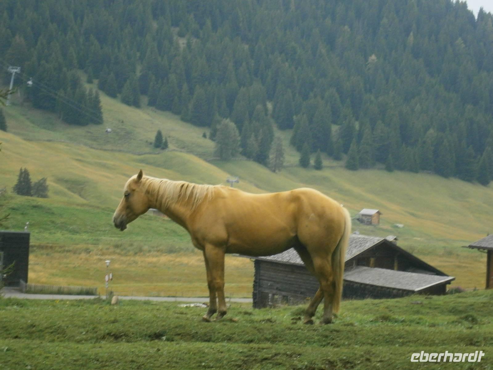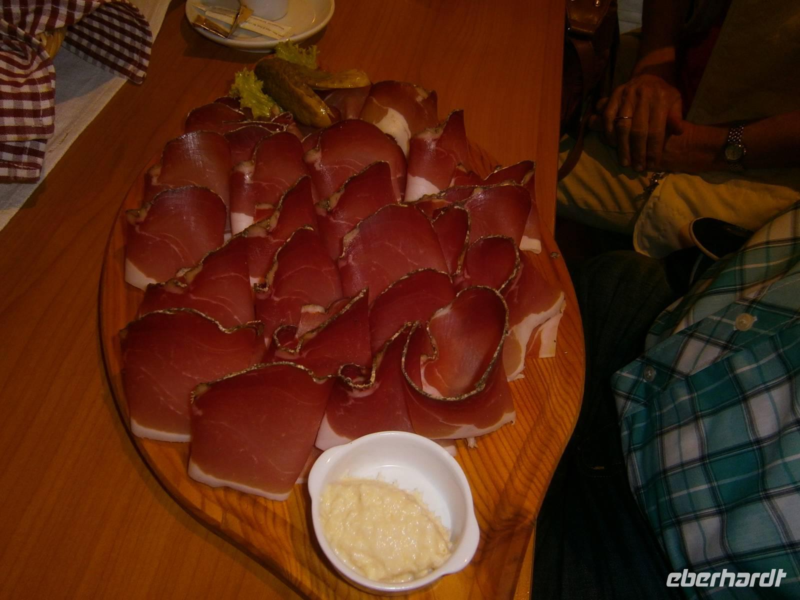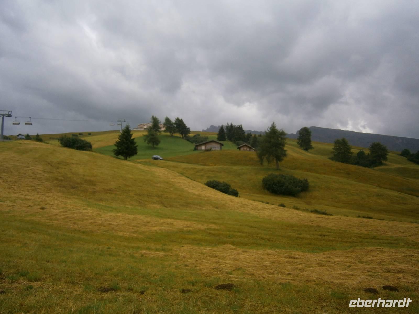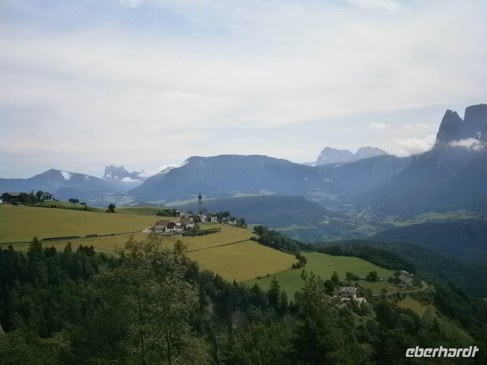 Ein Muss für alle Südtirol - Gäste ist der Aufenthalt auf einer der größten Hochalmen - der Seiser Alm, gelegen im Naturpark „Parco Naturale dello Sciliar e Alpi di Siusi". Von dem Ort Seis am Schlern fährt eine Kabinenbahn auf das Hochplateau. Hunderte von Bauern nutzen die Seiser Alm als Sommerweide. Kühe, Pferde und sogar Alpacas „grüßen" die Besucher. Compatsch ist das Zentrum der Hochalm und idealer Ausgangsort für Kutschfahrten, Wanderungen oder Radtouren. Ein bequemer Spazierweg oder die Fahrt mit dem Panoramalift führt zum gleichnamigen Hotel und Restaurant auf eine Höhe von über 2100 Metern. Von hier hat man den Blick (bei klarem Wetter) auf den Lang- und Plattkofel und die umliegenden Bergspitzen der Dolomiten. Der Schlern, 2563 m hoch, zeigt sich fast in seiner gesamten Schönheit. Markantes Merkmal sind die beiden vorgelagerten Spitzen; die Santner - und die Euringerspitze. Auf unserem Rückweg von der Panoramahöhe zur Bergstation der Kabinenbahn fängt es leicht an zu regnen. Auf dem Weg von Seis nach Kastelruth wird der Regen dann immer heftiger und in Castelrotto fällt es schwer den „trockenen" Bus zu verlassen. Der Ort lebt von der Tradition. Im alten Ortskern schmücken viele Häuser Wandmalereien. Sehenswert ist der freistehende Glockenturm, der am Hauptplatz aufragt. Seinen Namen verdankt der Ort einer zerstörten antiken Burg; Castellum ruptum.