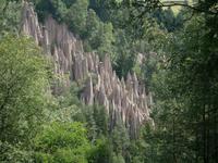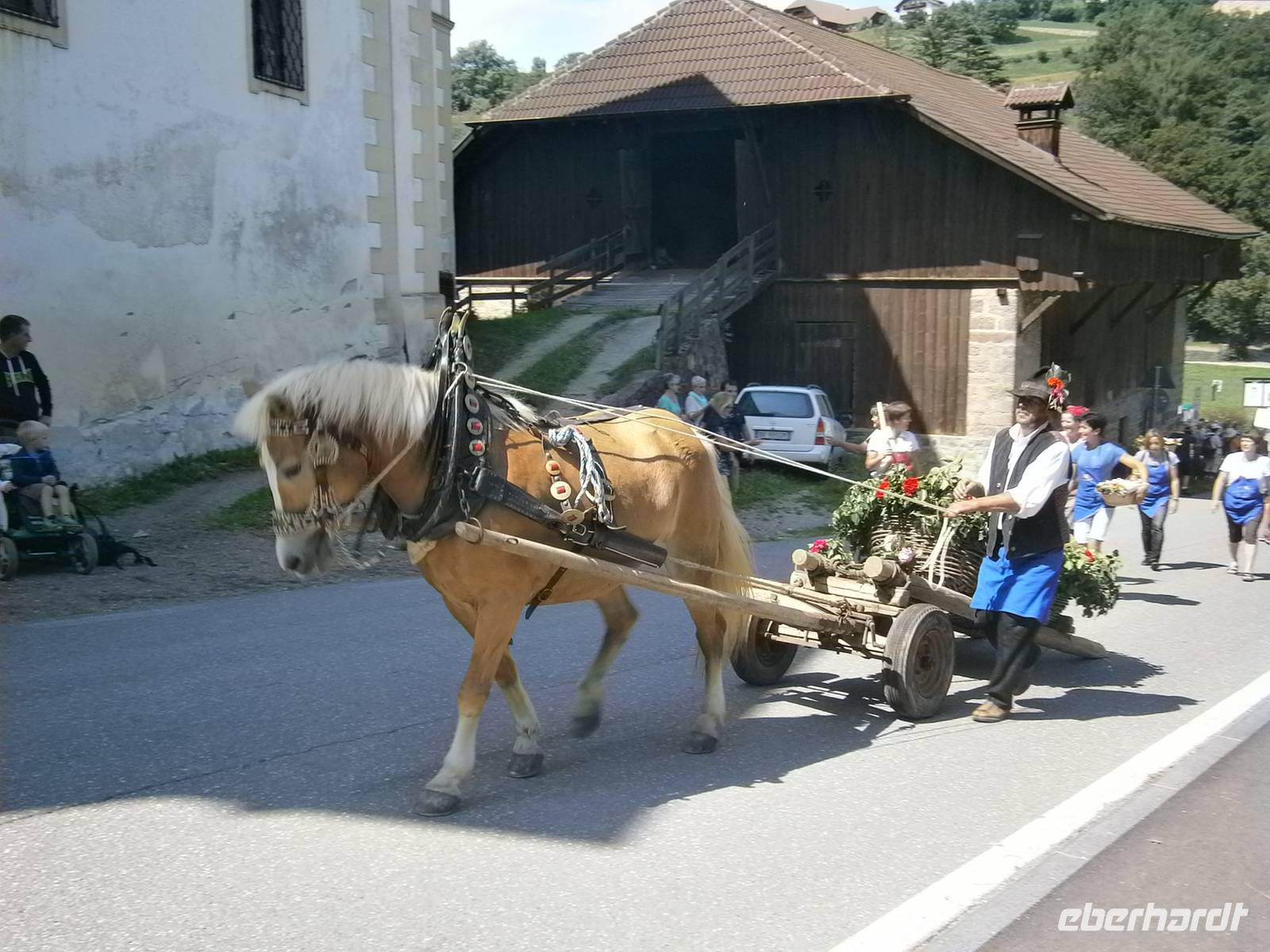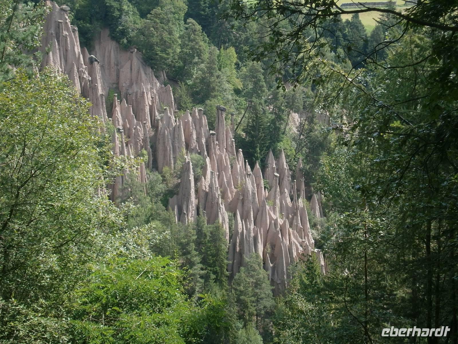 Von Bozen aus fahren wir über eine Panoramastraße, hoch über dem Eisacktal, auf den Ritten - ein Sonnenplateau. Hier in der Nähe bei Klobenstein hat die Natur ein Wunder vollbracht. Vom Sporthotel in Lengmoos aus führt ein bequemer Wanderweg zu den Rittner Erdpyramiden. Beschrieben wurden sie das erste Mal im 15. Jahrhundert. Die Erdpyramiden im Finsterbach sind wohl die größten und malerisch schönsten. Entstanden sind sie aus Moränenlehm, den die Gletscher aufgeschüttet haben. Der oben aufliegende Stein schützt die Pyramiden vor den Einflüssen der Natur. Trocken ist der Lehm hart wie Stein. Im feuchten Zustand wird der Lehm zu Brei. Liegt kein Stein auf der Pyramide ist sie also Wind, Regen, Sonne, Schnee und somit dem Zerfall ausgesetzt. Das Gesamtbild der Gruppe der Erdpyramiden wechselt also ständig. Im Finsterbachtal sind noch riesige Moränenlehmablagerungen vorhanden, so dass hier noch zahlreiche Erdpyramiden heraus wachsen können. Spaziert man weiter kommt man über eine Holzbrücke und einem kurzen Anstieg zur Wallfahrtskirche Maria Saal. Das kleine Kirchlein ist bekannt für sein Halbrundesfresko im Innenbereich. Es zeigt Maria unter einem Regenschirm. Nach der ausgiebigen Mittagspause erleben wir noch etwas besonderes. Wir sind Zuschauer eines Festumzuges der umliegenden Gemeinden. Die Bewohner zeigen auf verschiedenen Wagen wie zum Beispiel Heu gedroschen wird, wie man Zaunspfosten herstellt und vom Krapfenwagen werden die Leckereien an die Zuschauer verteilt.