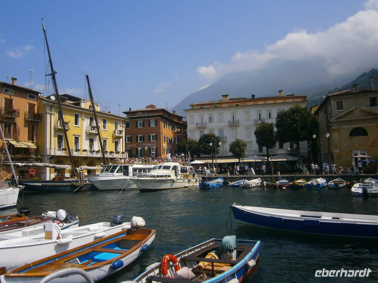 Die malerische Altstadt von Malcesine erstreckt sich unterhalb der Hauptstraße. Durchzogen von vielen kleinen Gassen, verwinkelten Straßen ist der Ort Ziel von unzähligen Touristen, nicht nur in den Sommermonaten. Unweigerlich erreicht man auch den Hafen. Hier bietet sich dem Besucher ein reizvolles Bild - die mittelalterliches Häuser und Palazzi erstrahlen in Rot- und Ockerfarben. Der Hafen ist auch Anlegestelle der Linienschiffe der Gesellschaft Navigatione sul Garda. Von hier aus sind es nur zwanzig Minuten Fahrzeit um an die andere Seite des Sees zu gelangen, nach Limone. Der Ort ist bekannt geworden durch den Anbau und die Zucht von Zitronen. Lange Jahre war diese Tradition in Vergessenheit geraten, doch heutzutage hat man diese alte Tradition wieder zum Leben erweckt. Bestes Beispiel dafür ist der Limoncello (Zitronenlikör) den man natürlich in vielen Geschäften probieren und erwerben kann.