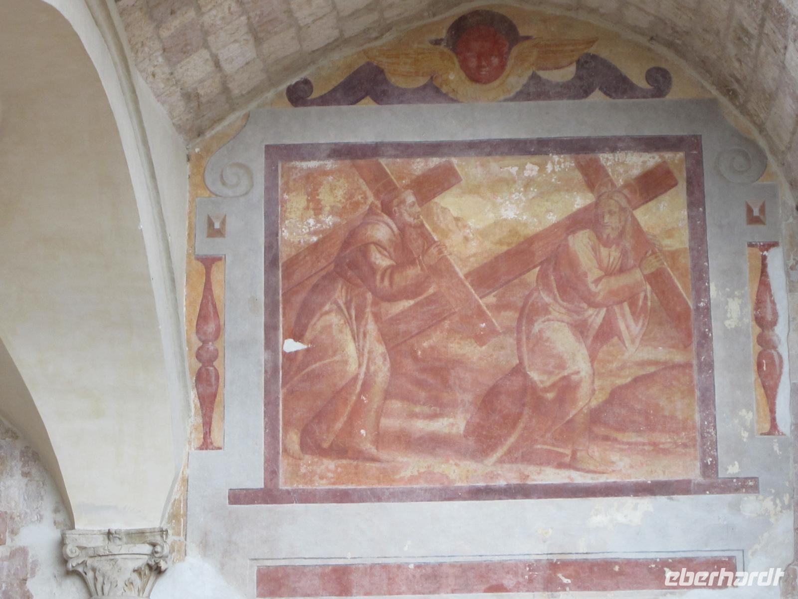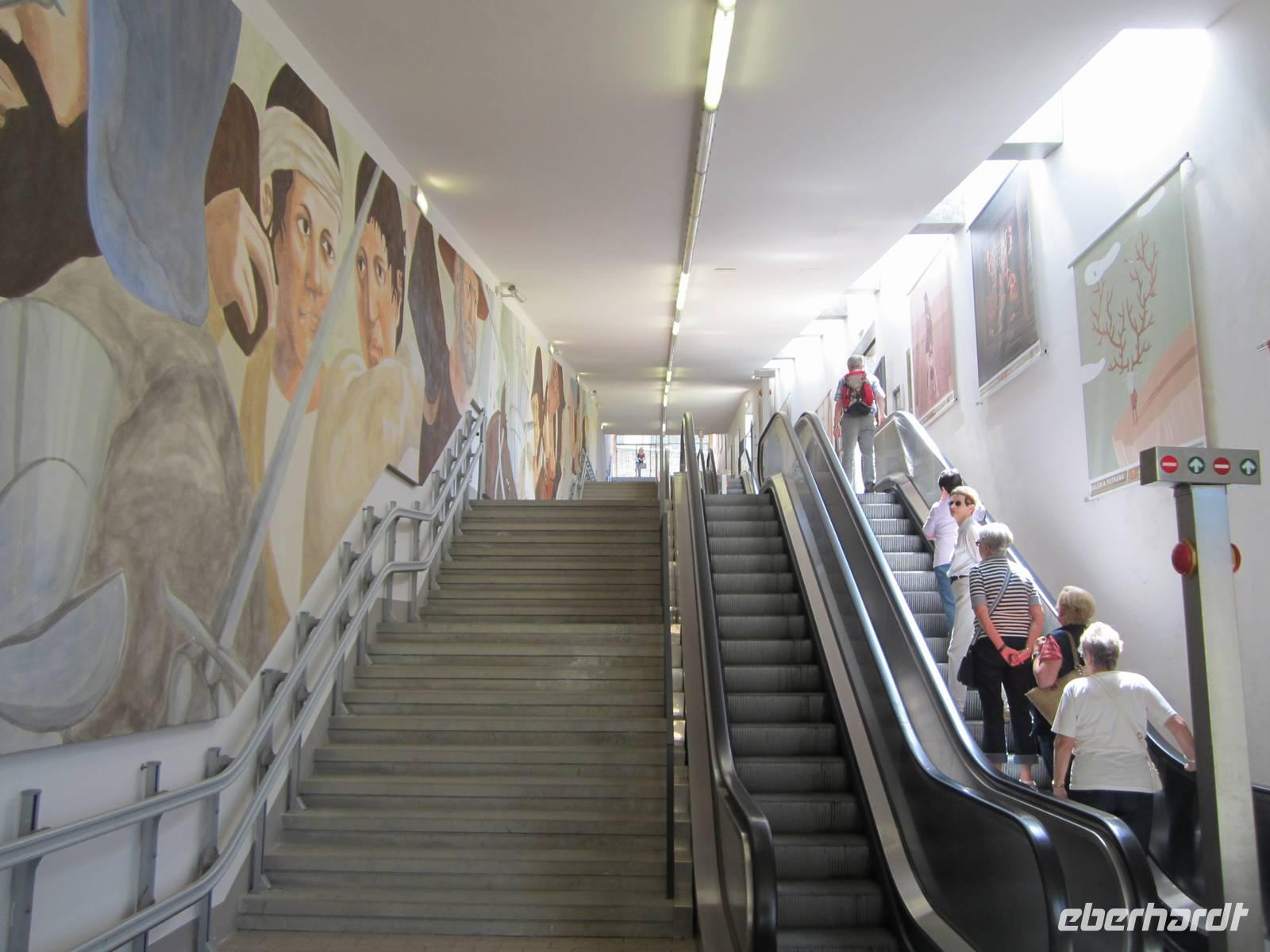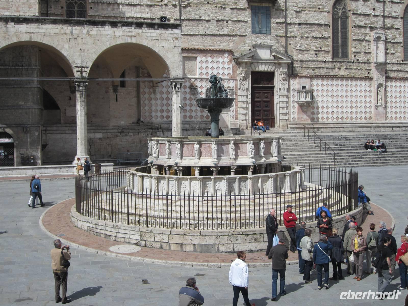 Gut gestärkt fahren wir zuerst nach Assisi, die Fahrt geht entlang der Autobahn vorbei am Trasimenischen See, deren Geschichte für die schwere Niederlage der Römer 217 v. Ch. erlitten haben. Hannibal (katagischer Feldherr),der mit seinem Herr die Alpen überquert hat, griff hier die Römer von 3 Seiten an. 15000 von ihnen kamen dabei ums Leben. Weiter auf dem Weg nach Assisi haben wir schon einmal einen Blick auf Perugia. 10.00 Uhr beginnen wir mit einer Stadtführung im Mittelpunkt steht natürlich der heilige Franziskus, der den Bettelorden gründete. Zwei Jahre nach seinem Tod wurde er bereits Heilig gesprochen und eine rege Bautätigkeit begann. Unsere Stadtführerin machte immer wieder deutlich, dass die Basilica di S. Francesco nicht im Interesse des heiligen Franziskus war, sondern von Rom aus gesteuert wurde. Dieser zweigeschossige Bau der Basilica ist uns aber eine Führung wert und ausgesprochen sehenswert, wenn für uns die Zeit auch etwas knapp wurde die Mittagspause etwas kurz war. Weiter geht es nun aber zur Hauptstadt Umbriens nach Perugia. Wir fahren bis zum Piazza Partigiani(Busbahnhof) und begrüßen hier unsere Stadtführerin. Wiederum auf Rolltreppen geht es in die antike Altstadt hier finden wir noch Bau-und Kunstdenkmäler von der Etruskerzeit bis in die Moderne. Die Stadt ist neben Siena die meistbesuchteste Stadt zwischen Florenz und Rom und wir genießen den Stadtrundgang. Bei schönem Wetter mit viel Sonne halten wir unsere Gruppe auf dem Hauptplatz der Stadt dem Fontana Maggiore am Fontana Maggiore fest. Die Stadt liegt auf dem Bergrücken zwischen den Transimenischen See und dem Tibertal. Das merken wir ganz genau. Es geht immer wieder bergab und bergauf. Am Ende unserer Stadtführung besuchen wir die Cioccolateria Augusta Perugia. Die Schokolade gehört zu Perugia war aber schon etwas anstrengend für uns. Viel Spaß gab es dann bei der Fahrt mit der Minimetro zum Busparkplatz wenn es an der Station " Pincetto" auch einige Hindernisse zu bewältigen gab. War die Fahrt zum Busparkplatz sehr beeindruckend.